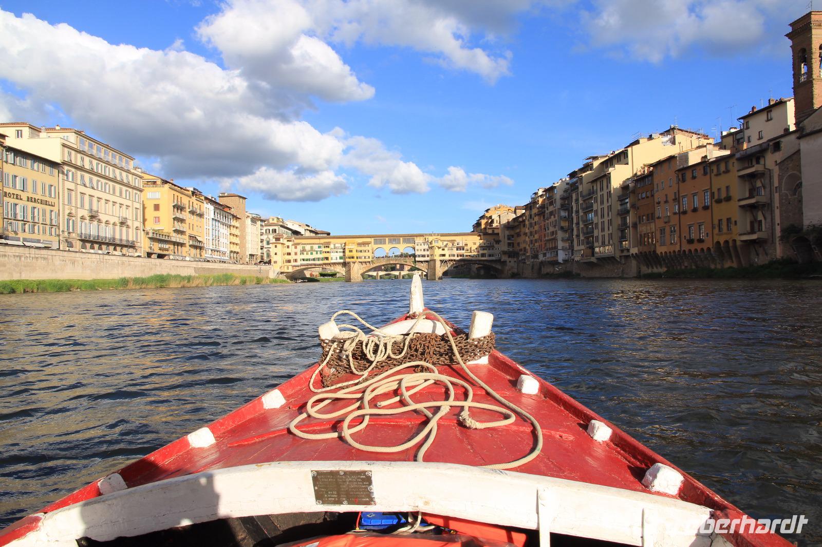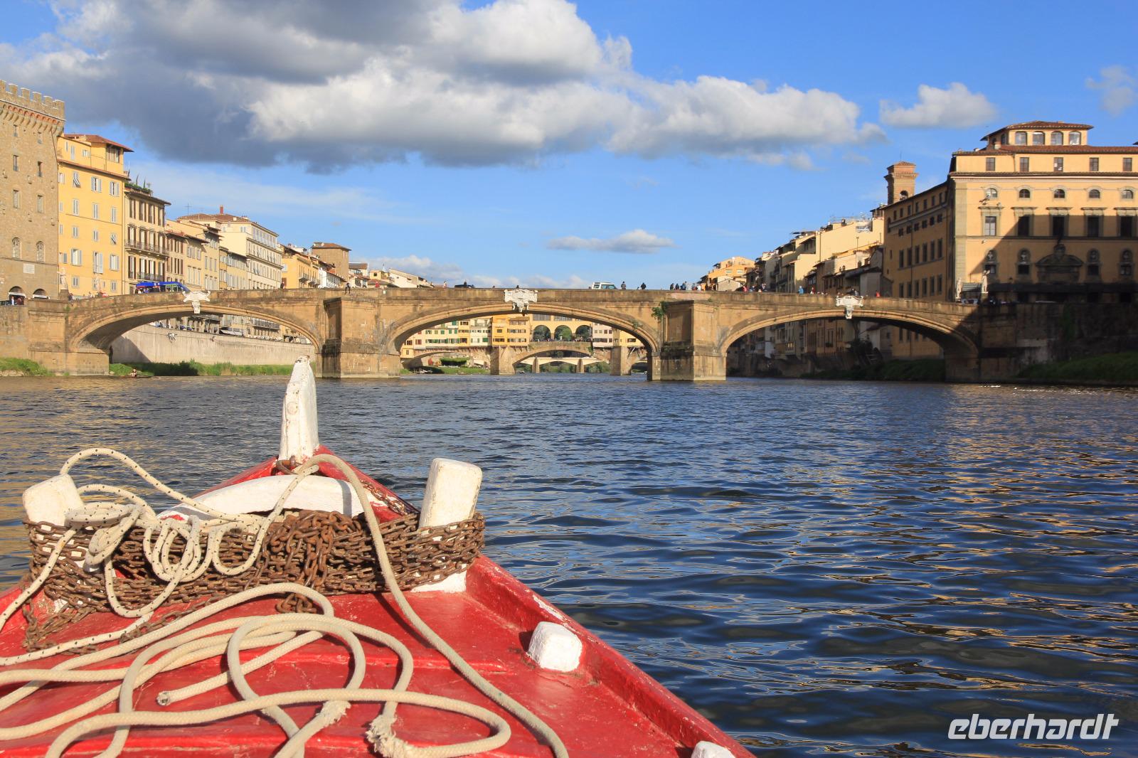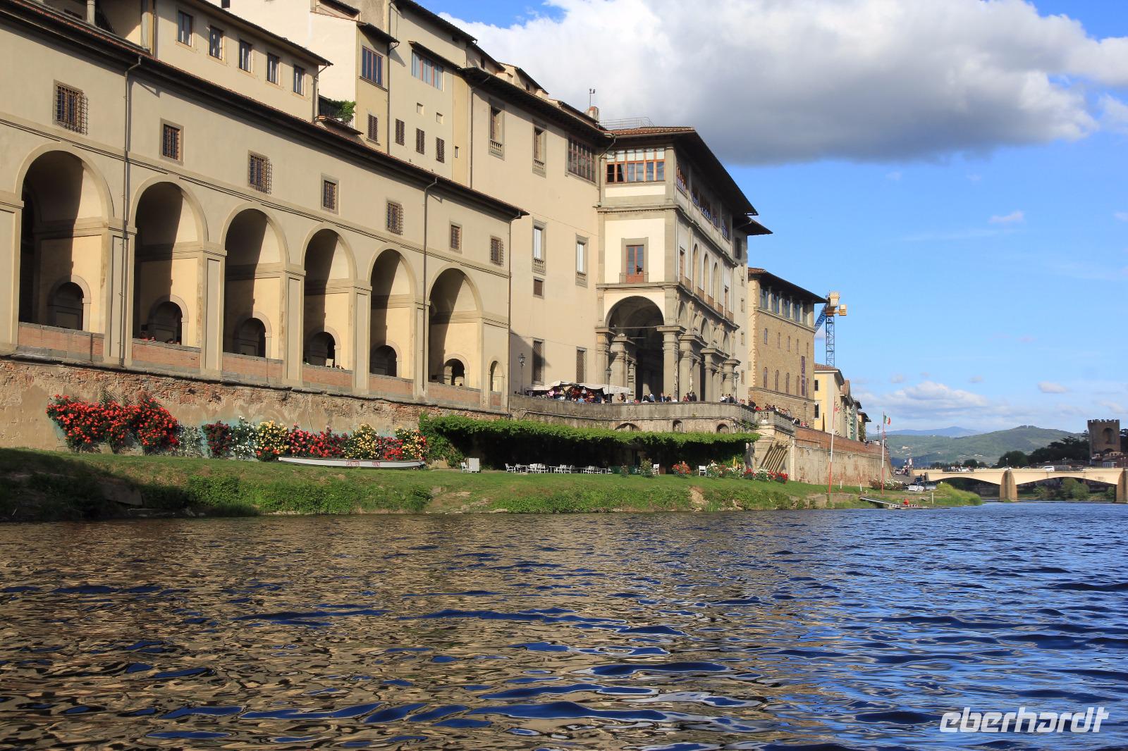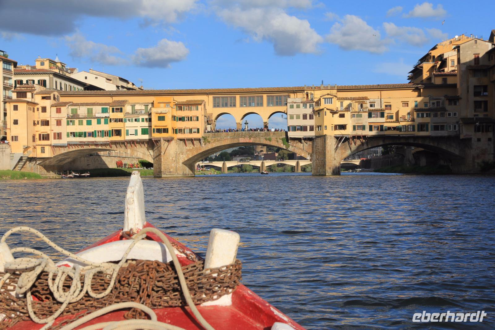 Trotz unserer vorbestellten Eintrittskarten müssen wir ein paar Minuten in der Schlange vor der Galleria degli Uffizi warten, bevor wir im 2. Geschoss unsere Führung beginnen. Wir beginnen mit den „Großvätern der Renaissance-Malerei", vor allem mit Giottos „Madonna di Ognissanti" aber auch mit Simone Martinis „Verkündigung". Wir begegnen natürlich wieder Masolino und Masaccio mit „Anna Selbdritt", bevor wir die bekanntesten Werke von Sandro Botticelli „Madonna del Magnificat", „Primavera" und „Geburt der Venus" ausgiebig mit unserer Bewunderung würdigen. Michelangelos „Die Heilige Familie mit dem Johannesknaben" und „Die Verkündigung" finden auch unsere ungeteilte Aufmerksamkeit, die unsere Führerin und Kunstkennerin Angela engagiert und gestenreich aufrecht zu erhalten versucht. Jetzt ist es aber Zeit für eine Mittagspause, die wir bei Kaffee und Focaccio auf der Terasses über der Loggia die Lanzi verbringen. Danach widmen wir uns u.a. den Meistern Tizian, Giorgione und Leonardo der Vinci. Wir sehen Leonardo förmlich über die Schulter seines Schaffens, indem wir sein unvollendetes, fast skizzenhaftes Werk „Anbetung" vor uns haben und seine Malweise zu verstehen versuchen. Wir verlassen die Uffizien und schließen noch einen Besuch des Palazzo Vecchio an. Er zeigt sich heute in der Pracht, die er vor allem in der Zeit seiner Funktion als Sitz der Medici-Großherzöge hatte. Der „Saal der Fünfhundert", der ursprünglich als Tagungsort des Stadtparlaments des republikanisch verwalteten Florenz' gedacht war, wurde dadurch Thronsaal Cosimos I.. Schon ein bisschen erschöpft von den Eindrücken des Uffizien-Besuchs besichtigen wir noch die Arbeits- und Wohnräume der großherzoglichen Familie. Danach haben wir Zeit zum Ausruhen im Hotel oder Gelegenheit zum Einkaufen. Am späten Nachmittag überraschen uns Angela und der Eberhardt-Reisebegleiter mit einer Bootsfahrt auf dem Arno, die wir bei Sonnenschein und unter großer Aufmerksamkeit der am Ufer und auf der Ponte Vecchio flanierenden Touristen erleben. Den Abschluss unserer Reise feiern wir mit einem leckeren Abendessen und Nipozzano in der Trattoria Angiolino. Wir bedanken uns damit auch ganz herzlich bei Angela Solda, die uns so herzlich und kenntnisreich in Florenz verführt hat.