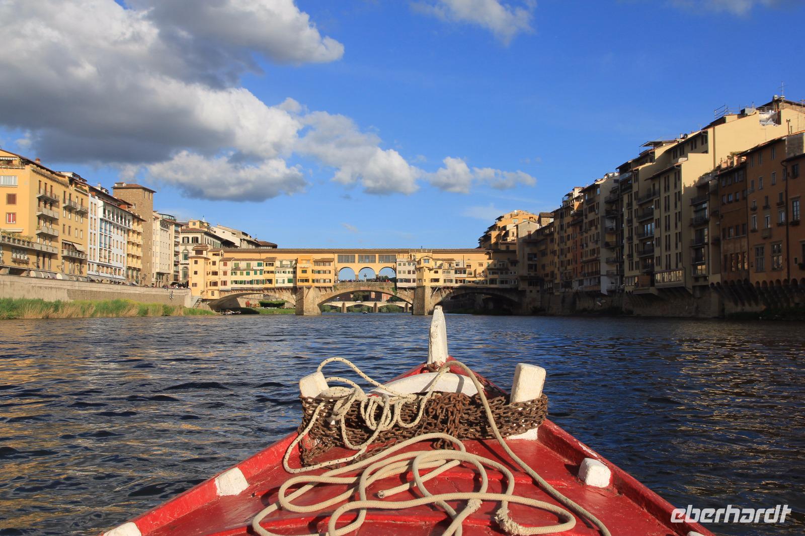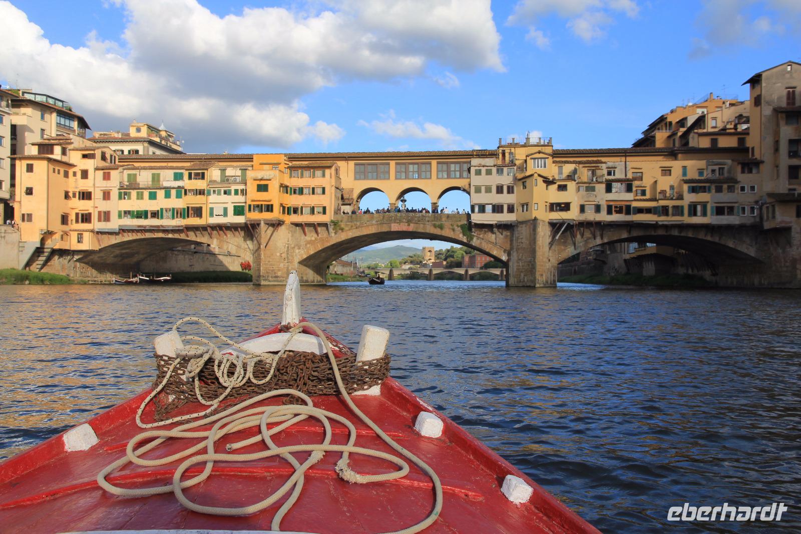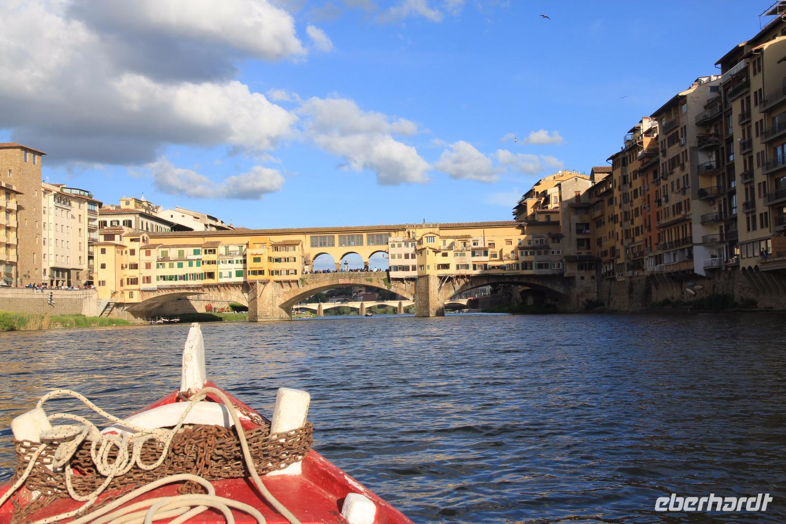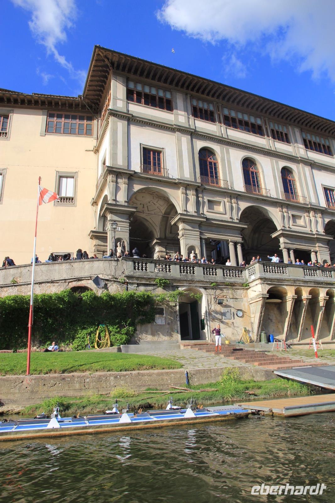 Trotz unserer vorbestellten Eintrittskarten müssen wir ein paar Minuten in der Schlange vor der Galleria degli Uffizi warten, bevor wir im 2. Geschoss unsere Führung beginnen. Wir beginnen mit den „Großvätern der Renaissance-Malerei", vor allem mit Giottos „Madonna di Ognissanti" aber auch mit Simone Martinis „Verkündigung". Wir begegnen natürlich wieder Masolino und Masaccio mit „Anna Selbdritt", bevor wir die bekanntesten Werke von Sandro Botticelli „Madonna del Magnificat", „Primavera" und „Geburt der Venus" ausgiebig mit unserer Bewunderung würdigen. Michelangelos „Die Heilige Familie mit dem Johannesknaben" und „Die Verkündigung" finden auch unsere ungeteilte Aufmerksamkeit, die unsere Führerin und Kunstkennerin Angela engagiert und gestenreich aufrecht zu erhalten versucht. Jetzt ist es aber Zeit für eine Mittagspause, die wir bei Kaffee und Focaccio auf der Terasses über der Loggia die Lanzi verbringen. Danach widmen wir uns u.a. den Meistern Tizian, Giorgione und Leonardo der Vinci. Wir sehen Leonardo förmlich über die Schulter seines Schaffens, indem wir sein unvollendetes, fast skizzenhaftes Werk „Anbetung" vor uns haben und seine Malweise zu verstehen versuchen. Wir verlassen die Uffizien und schließen noch einen Besuch des Palazzo Vecchio an. Er zeigt sich heute in der Pracht, die er vor allem in der Zeit seiner Funktion als Sitz der Medici-Großherzöge hatte. Der „Saal der Fünfhundert", der ursprünglich als Tagungsort des Stadtparlaments des republikanisch verwalteten Florenz' gedacht war, wurde dadurch Thronsaal Cosimos I.. Schon ein bisschen erschöpft von den Eindrücken des Uffizien-Besuchs besichtigen wir noch die Arbeits- und Wohnräume der großherzoglichen Familie. Danach haben wir Zeit zum Ausruhen im Hotel oder Gelegenheit zum Einkaufen. Am späten Nachmittag überraschen uns Angela und der Eberhardt-Reisebegleiter mit einer Bootsfahrt auf dem Arno, die wir bei Sonnenschein und unter großer Aufmerksamkeit der am Ufer und auf der Ponte Vecchio flanierenden Touristen erleben. Den Abschluss unserer Reise feiern wir mit einem leckeren Abendessen und Nipozzano in der Trattoria Angiolino. Wir bedanken uns damit auch ganz herzlich bei Angela Solda, die uns so herzlich und kenntnisreich in Florenz verführt hat.