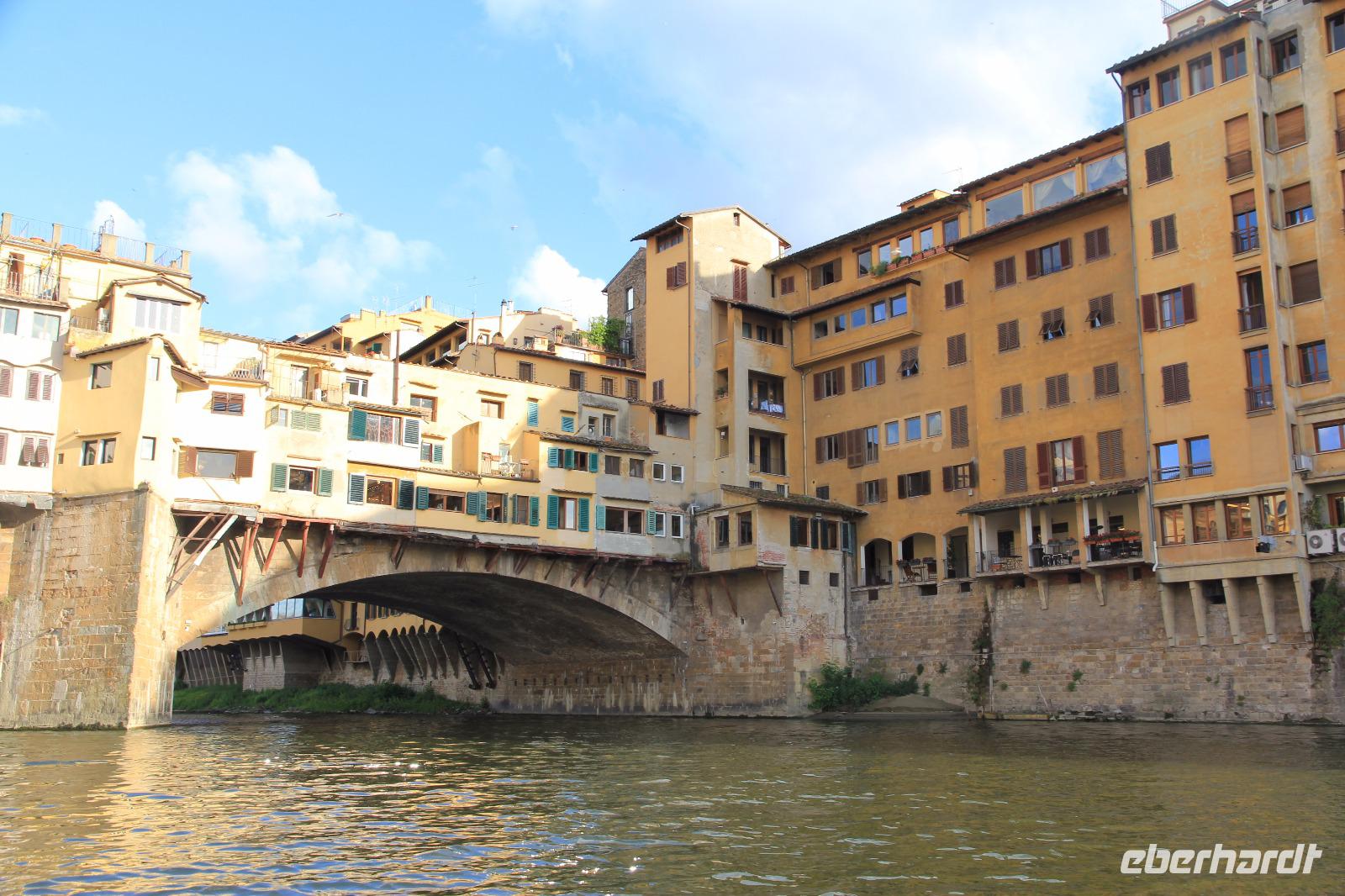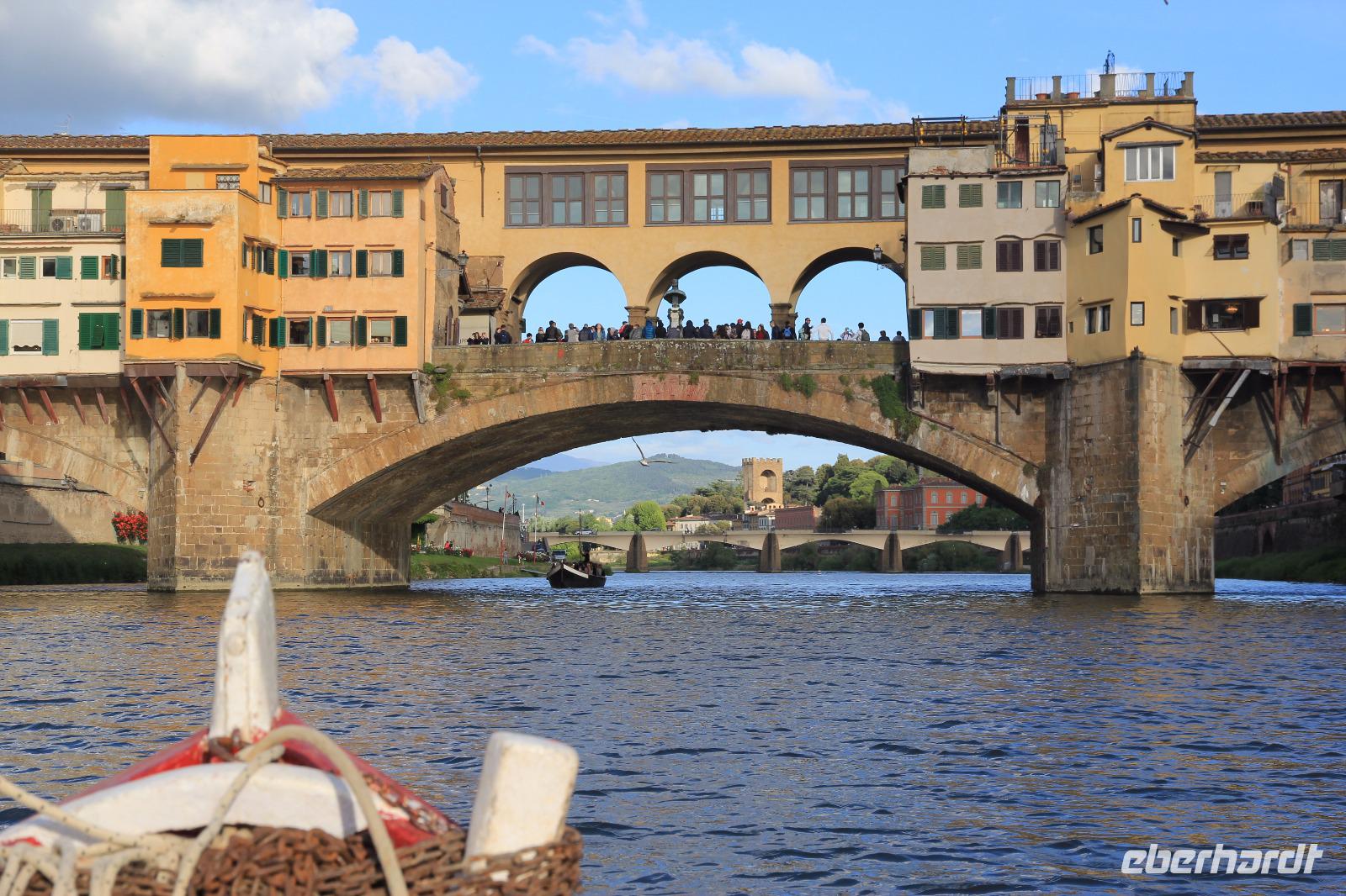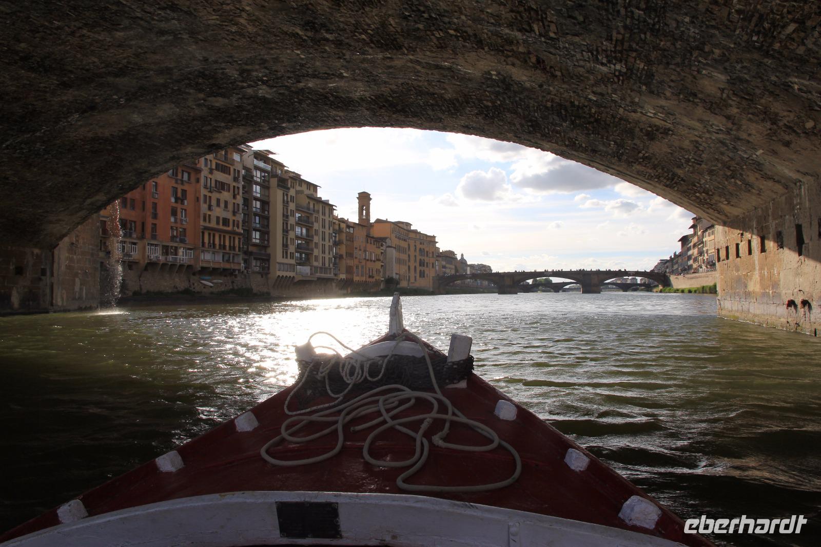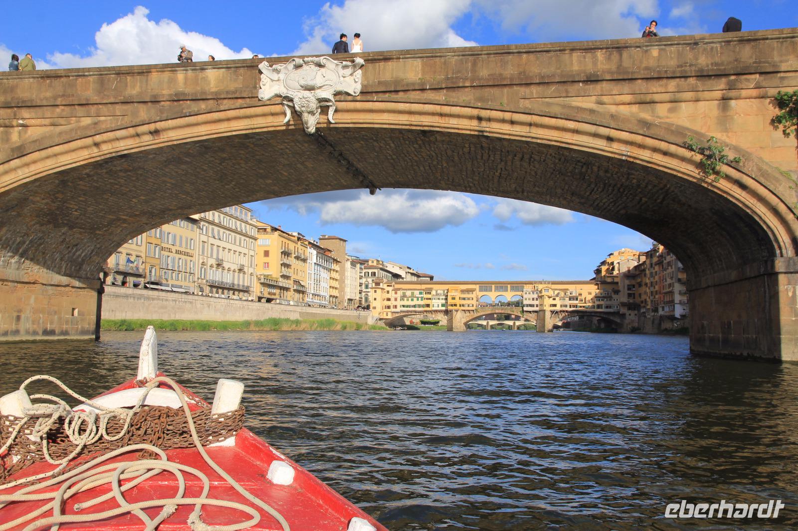 Trotz unserer vorbestellten Eintrittskarten müssen wir ein paar Minuten in der Schlange vor der Galleria degli Uffizi warten, bevor wir im 2. Geschoss unsere Führung beginnen. Wir beginnen mit den „Großvätern der Renaissance-Malerei", vor allem mit Giottos „Madonna di Ognissanti" aber auch mit Simone Martinis „Verkündigung". Wir begegnen natürlich wieder Masolino und Masaccio mit „Anna Selbdritt", bevor wir die bekanntesten Werke von Sandro Botticelli „Madonna del Magnificat", „Primavera" und „Geburt der Venus" ausgiebig mit unserer Bewunderung würdigen. Michelangelos „Die Heilige Familie mit dem Johannesknaben" und „Die Verkündigung" finden auch unsere ungeteilte Aufmerksamkeit, die unsere Führerin und Kunstkennerin Angela engagiert und gestenreich aufrecht zu erhalten versucht. Jetzt ist es aber Zeit für eine Mittagspause, die wir bei Kaffee und Focaccio auf der Terasses über der Loggia die Lanzi verbringen. Danach widmen wir uns u.a. den Meistern Tizian, Giorgione und Leonardo der Vinci. Wir sehen Leonardo förmlich über die Schulter seines Schaffens, indem wir sein unvollendetes, fast skizzenhaftes Werk „Anbetung" vor uns haben und seine Malweise zu verstehen versuchen. Wir verlassen die Uffizien und schließen noch einen Besuch des Palazzo Vecchio an. Er zeigt sich heute in der Pracht, die er vor allem in der Zeit seiner Funktion als Sitz der Medici-Großherzöge hatte. Der „Saal der Fünfhundert", der ursprünglich als Tagungsort des Stadtparlaments des republikanisch verwalteten Florenz' gedacht war, wurde dadurch Thronsaal Cosimos I.. Schon ein bisschen erschöpft von den Eindrücken des Uffizien-Besuchs besichtigen wir noch die Arbeits- und Wohnräume der großherzoglichen Familie. Danach haben wir Zeit zum Ausruhen im Hotel oder Gelegenheit zum Einkaufen. Am späten Nachmittag überraschen uns Angela und der Eberhardt-Reisebegleiter mit einer Bootsfahrt auf dem Arno, die wir bei Sonnenschein und unter großer Aufmerksamkeit der am Ufer und auf der Ponte Vecchio flanierenden Touristen erleben. Den Abschluss unserer Reise feiern wir mit einem leckeren Abendessen und Nipozzano in der Trattoria Angiolino. Wir bedanken uns damit auch ganz herzlich bei Angela Solda, die uns so herzlich und kenntnisreich in Florenz verführt hat.
