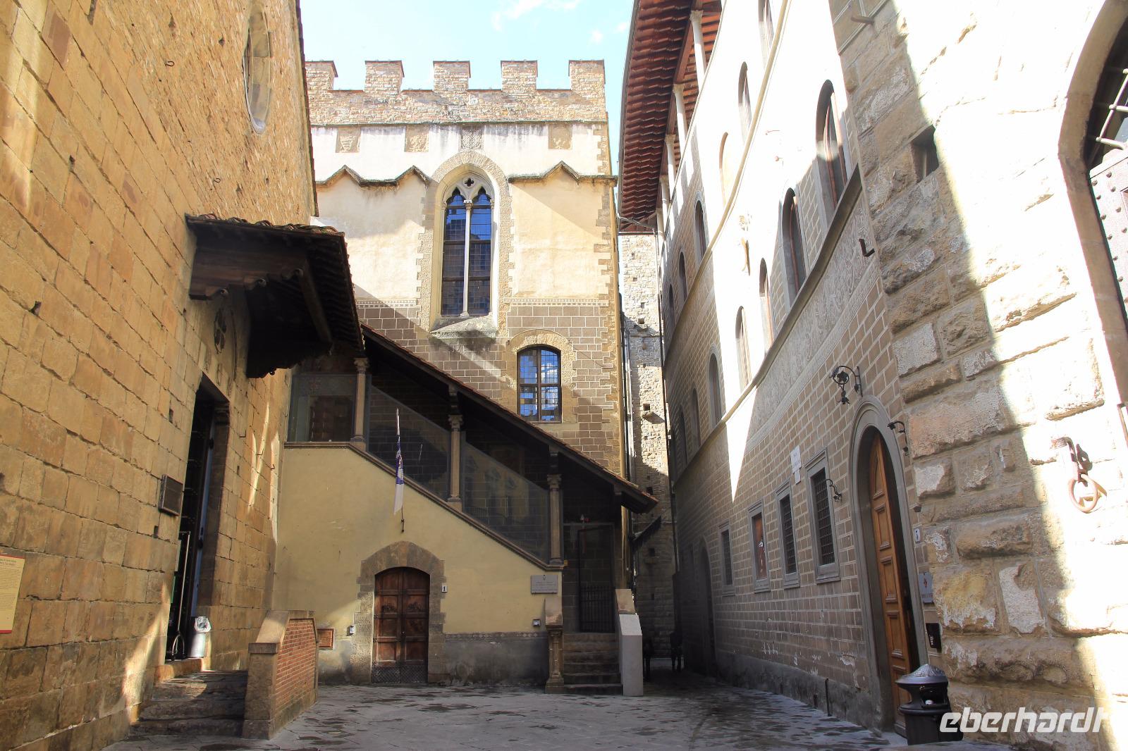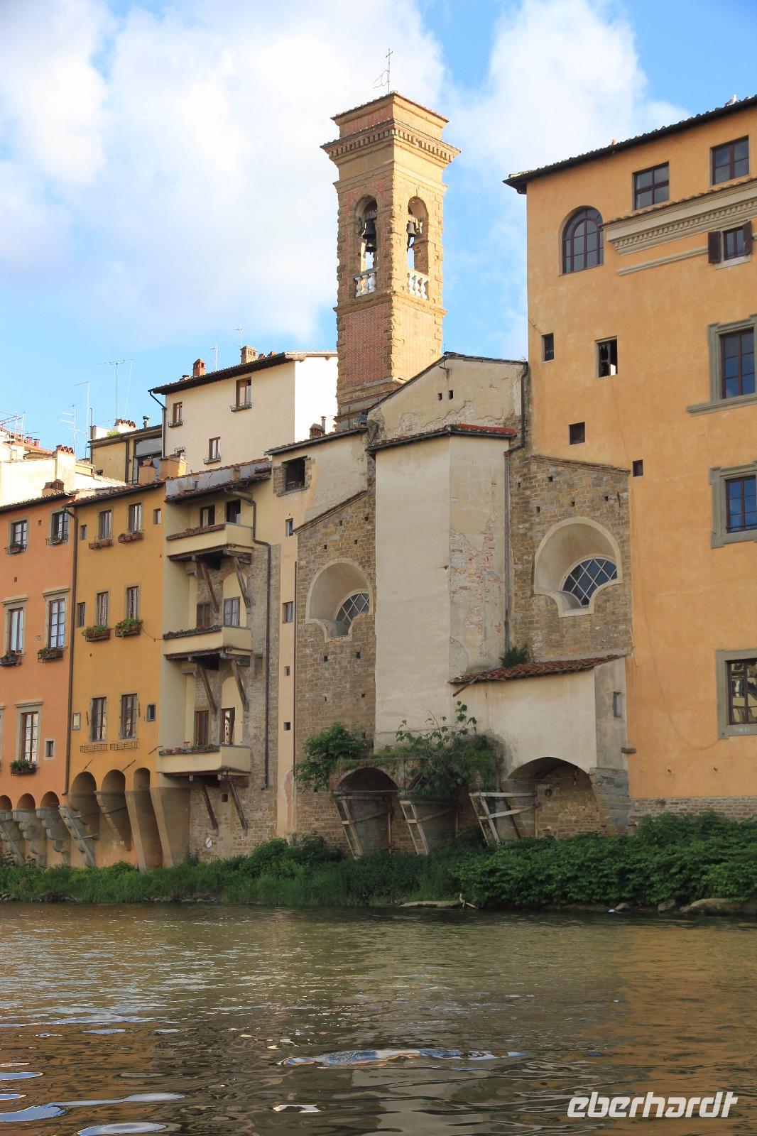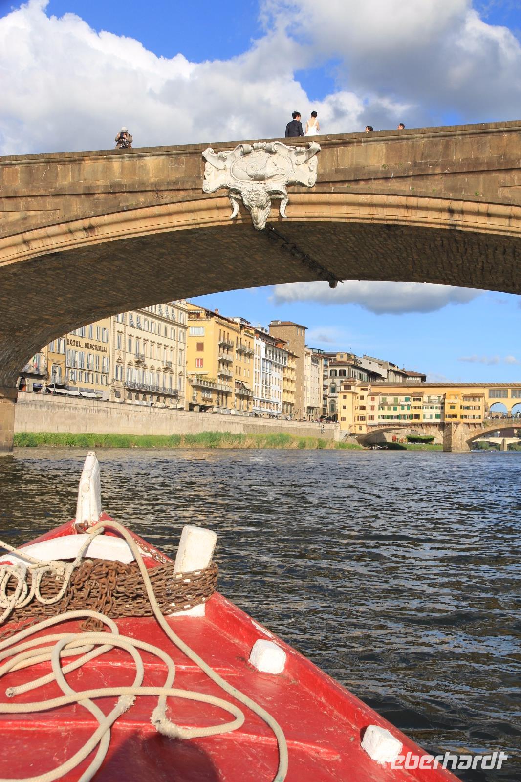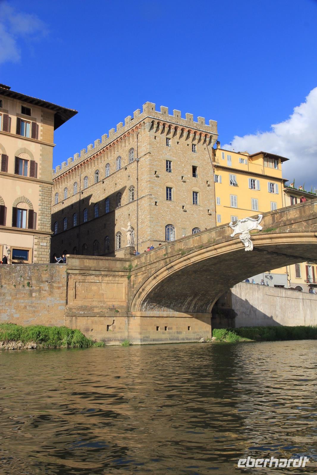 Trotz unserer vorbestellten Eintrittskarten müssen wir ein paar Minuten in der Schlange vor der Galleria degli Uffizi warten, bevor wir im 2. Geschoss unsere Führung beginnen. Wir beginnen mit den „Großvätern der Renaissance-Malerei", vor allem mit Giottos „Madonna di Ognissanti" aber auch mit Simone Martinis „Verkündigung". Wir begegnen natürlich wieder Masolino und Masaccio mit „Anna Selbdritt", bevor wir die bekanntesten Werke von Sandro Botticelli „Madonna del Magnificat", „Primavera" und „Geburt der Venus" ausgiebig mit unserer Bewunderung würdigen. Michelangelos „Die Heilige Familie mit dem Johannesknaben" und „Die Verkündigung" finden auch unsere ungeteilte Aufmerksamkeit, die unsere Führerin und Kunstkennerin Angela engagiert und gestenreich aufrecht zu erhalten versucht. Jetzt ist es aber Zeit für eine Mittagspause, die wir bei Kaffee und Focaccio auf der Terasses über der Loggia die Lanzi verbringen. Danach widmen wir uns u.a. den Meistern Tizian, Giorgione und Leonardo der Vinci. Wir sehen Leonardo förmlich über die Schulter seines Schaffens, indem wir sein unvollendetes, fast skizzenhaftes Werk „Anbetung" vor uns haben und seine Malweise zu verstehen versuchen. Wir verlassen die Uffizien und schließen noch einen Besuch des Palazzo Vecchio an. Er zeigt sich heute in der Pracht, die er vor allem in der Zeit seiner Funktion als Sitz der Medici-Großherzöge hatte. Der „Saal der Fünfhundert", der ursprünglich als Tagungsort des Stadtparlaments des republikanisch verwalteten Florenz' gedacht war, wurde dadurch Thronsaal Cosimos I.. Schon ein bisschen erschöpft von den Eindrücken des Uffizien-Besuchs besichtigen wir noch die Arbeits- und Wohnräume der großherzoglichen Familie. Danach haben wir Zeit zum Ausruhen im Hotel oder Gelegenheit zum Einkaufen. Am späten Nachmittag überraschen uns Angela und der Eberhardt-Reisebegleiter mit einer Bootsfahrt auf dem Arno, die wir bei Sonnenschein und unter großer Aufmerksamkeit der am Ufer und auf der Ponte Vecchio flanierenden Touristen erleben. Den Abschluss unserer Reise feiern wir mit einem leckeren Abendessen und Nipozzano in der Trattoria Angiolino. Wir bedanken uns damit auch ganz herzlich bei Angela Solda, die uns so herzlich und kenntnisreich in Florenz verführt hat.
