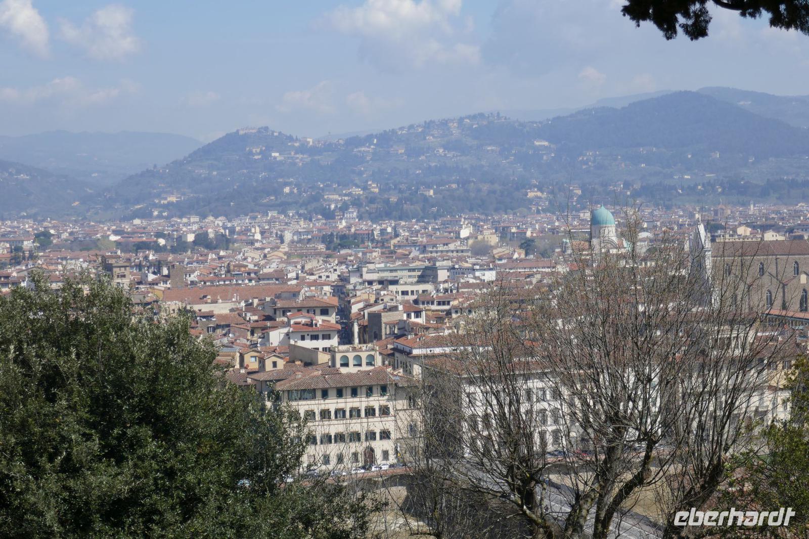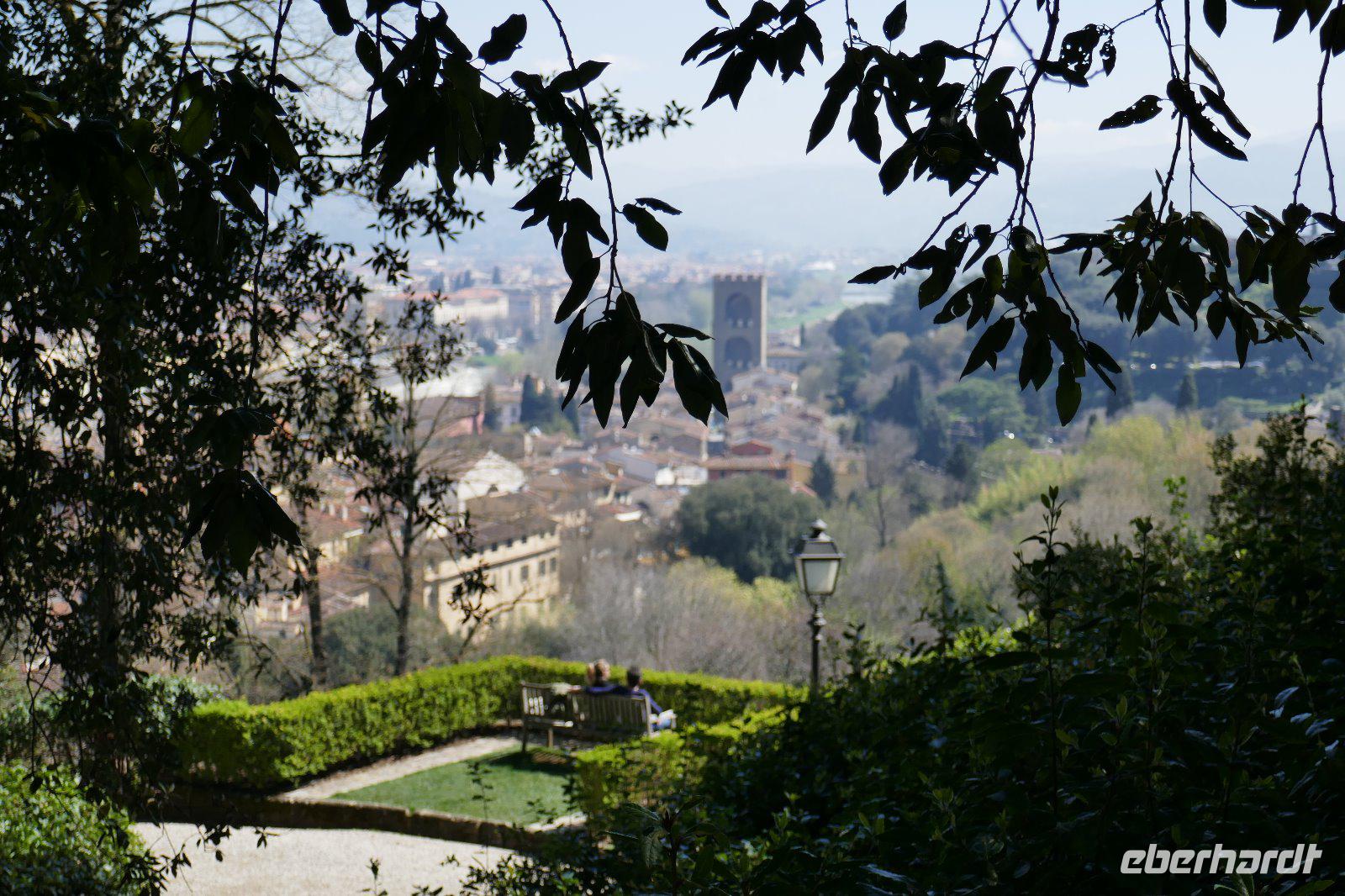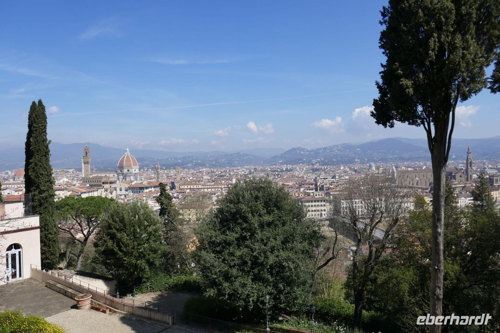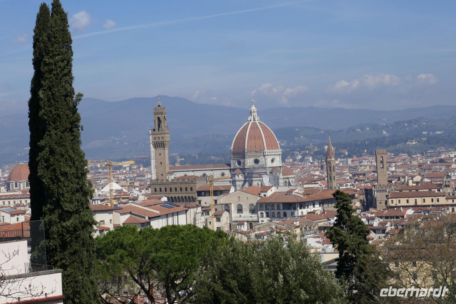 Heute bei strahlendem Sonnenschein versprach Angela einen ruhigen Tag. Am Ende waren auf den Schrittzählern immerhin 10 Km und mehr. Erster Stopp war am Piazza della Signoria. Einst politisches u. soziales Zentrum der Stadt säumen heute die Touristen und zahlreiche Cafés diesen Platz. Die Kunst ist eher an den Rand gedrängt. Sexy Boys an vielen Orten. Die eindrucksvollsten waren der zarte Jüngling, der glorreich seine Trophäe (Kopf der Medusa) zur Schau stellte und ein David wie von Gott geschaffen- breite Schultern u. ausgeprägter Sixpack.Über die Ponte Vecchio erreichten wir schließlich den Palazzo Pitti - einst vom Bankier Pitt in Auftrag gegeben um gegenüber den mächtigen Medicis Einfluss zu dokumentieren mussten diese aber gerade aus finanziellen Nöten dieses Anwesen schließlich an die Medicis verkaufen. Erbaut von keinem anderen als Brunelleschi. Nach dem Ausbau durch die Medicis dokumentierte es einmal mehr den Machtanspruch dieses Herrschergeschlechts. Die Residenz des italienischen Königs Cosimo I de Medici beherbergt heute zahlreiche Museen mit Werken von Raffael, Rubens, Tizian und natürlich die königlichen Gemächer. Dahinter liegt der Boboli-Garten. Dieser Renaissancegarten auf einem Hügel gleich hinter dem Palast wurde in der Mitte des 16. Jahrhunderts angelegt. Der Gartenbaustil, der verschwenderische Einsatz von Statuen, Brunnen und der erneute Panoramablick über die Perle am Arno luden zu einem Spaziergang ein. Nebenbei erfuhren wir viel zum Palast u. Garten und seiner Geschichte. Er ist einer der elegantesten Gärten Italiens und umfasst über 4,5 ha. Bis er seine heutige Ausdehnung erreichte, wurde er immer wieder umgestaltet und erweitert. Herausgekommen ist ein einzigartiger prächtiger Park mit saftig-grünen Wiesen, verschlungenen Pfaden mit wunderschönen Landschaftsausblicken. Um das Ganze zu vervollkommnen, finden sich in der gesamten Anlage besondere dekorative Kunstschätze, die den Park zu einem wahren Freilichtmuseum für Skulpturen machen. Antike Statuen werden ergänzt durch ein riesiges Amphitheater, eine zauberhafte Grotte, unzählige verspielte Brunnen mit Fontänen sowie eine Vogelwiese mit farbenfrohen gefiederten Freunden Auf dem Hügel Montecuccoli liegt der Bardini-Garten. Die barocke Freitreppe ist wohl der spektakulärste Teil des Gartens. Nach dem wir diese erklommen hatten, bot sich auf der Aussichtsterrasse ein herrlicher Blick auf die Stadt. Brunnen mit Mosaiken aus unterschiedlichen Materialien, grünes Theater, Kamelien, Zitrusfrüchte und der Rosengarten ergänzen den barocken Garten, der einst ein Obst u. Gemüsegarten war. Im Rosengarten konnte man die Pracht und den Duft, der Jahreszeit geschuldet, nur erahnen. Doch der Reiz der frühlingshaften Flora entschädigte allemal dafür. Anschließend nahmen wir uns ein wenig Zeit, zwischen Kunst und Botanik zu entspannen die sich in einer Trattoria zur Mittagszeit fortsetzte. Gestärkt ging es steil bergauf zur Kirche San Miniato al Monte. Von der Zunft der Spinner „gesponsert" ist es heute noch Kloster. Diese Atmosphäre versprüht heute noch die Kirche besonders wenn zur Abendmesse die Mönche ihren Gesang anstimmen. Prunkvoll auch das, was die Medici hier hinterlassen haben. Leider für uns derzeit nur sichtbar in Form eines Druckes, denn dieser Teil wird gerade restauriert. Über die Piazzale Michelangelo begleitet von italienischen Klängen einiger Straßenmusiker ging es über den Arno zum Piazza Santa Croce. In einem Kaffee stärkten wir uns für den letzten Programmpunkt des heutigen Tages - der Aufstieg auf die Domkuppel. Mehr als 400 Stufen und nach einigen Scheißtropfen erreichten wir die Laterne der Kuppel. Mit eine gigantischen Sicht über die Stadt die Region wurden wir für die Mühe entschädigt. Mit einem guten Essen in einem Lokal wurden der „ruhige Tag" beendet.