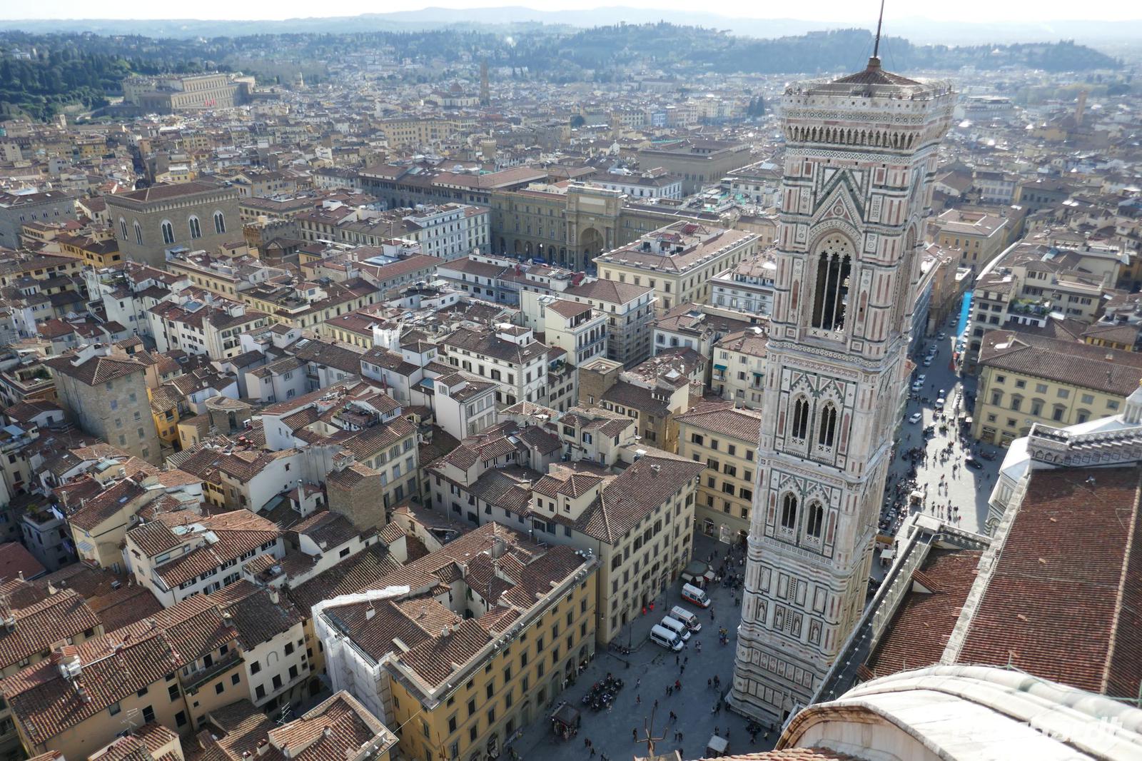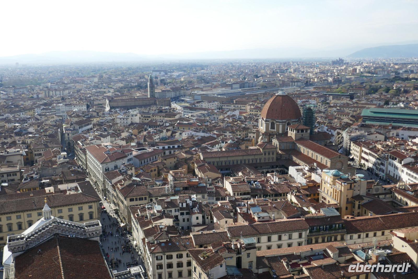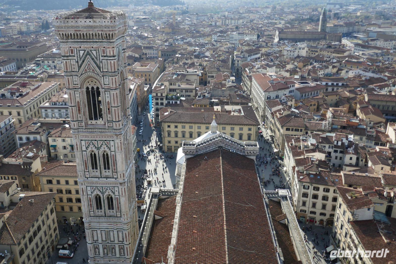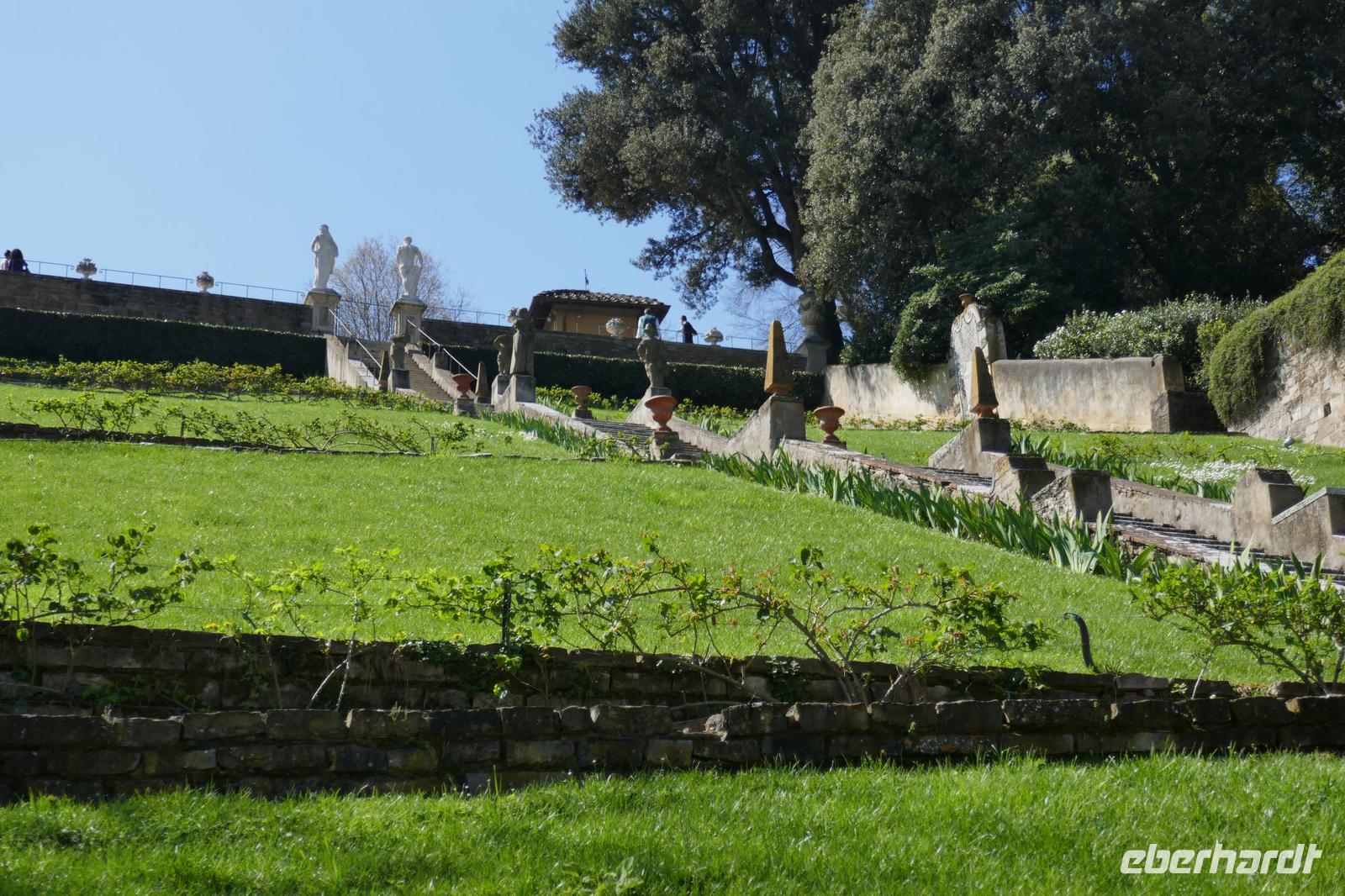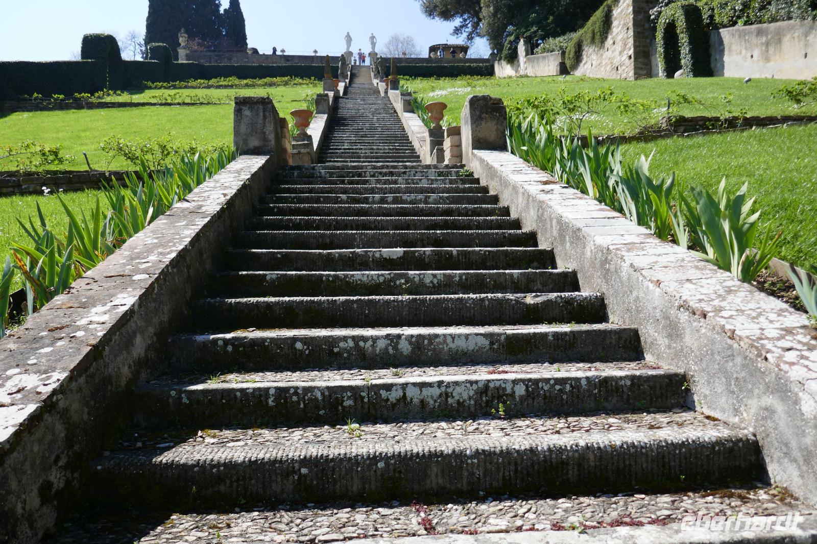 Heute bei strahlendem Sonnenschein versprach Angela einen ruhigen Tag. Am Ende waren auf den Schrittzählern immerhin 10 Km und mehr. Erster Stopp war am Piazza della Signoria. Einst politisches u. soziales Zentrum der Stadt säumen heute die Touristen und zahlreiche Cafés diesen Platz. Die Kunst ist eher an den Rand gedrängt. Sexy Boys an vielen Orten. Die eindrucksvollsten waren der zarte Jüngling, der glorreich seine Trophäe (Kopf der Medusa) zur Schau stellte und ein David wie von Gott geschaffen- breite Schultern u. ausgeprägter Sixpack.Über die Ponte Vecchio erreichten wir schließlich den Palazzo Pitti - einst vom Bankier Pitt in Auftrag gegeben um gegenüber den mächtigen Medicis Einfluss zu dokumentieren mussten diese aber gerade aus finanziellen Nöten dieses Anwesen schließlich an die Medicis verkaufen. Erbaut von keinem anderen als Brunelleschi. Nach dem Ausbau durch die Medicis dokumentierte es einmal mehr den Machtanspruch dieses Herrschergeschlechts. Die Residenz des italienischen Königs Cosimo I de Medici beherbergt heute zahlreiche Museen mit Werken von Raffael, Rubens, Tizian und natürlich die königlichen Gemächer. Dahinter liegt der Boboli-Garten. Dieser Renaissancegarten auf einem Hügel gleich hinter dem Palast wurde in der Mitte des 16. Jahrhunderts angelegt. Der Gartenbaustil, der verschwenderische Einsatz von Statuen, Brunnen und der erneute Panoramablick über die Perle am Arno luden zu einem Spaziergang ein. Nebenbei erfuhren wir viel zum Palast u. Garten und seiner Geschichte. Er ist einer der elegantesten Gärten Italiens und umfasst über 4,5 ha. Bis er seine heutige Ausdehnung erreichte, wurde er immer wieder umgestaltet und erweitert. Herausgekommen ist ein einzigartiger prächtiger Park mit saftig-grünen Wiesen, verschlungenen Pfaden mit wunderschönen Landschaftsausblicken. Um das Ganze zu vervollkommnen, finden sich in der gesamten Anlage besondere dekorative Kunstschätze, die den Park zu einem wahren Freilichtmuseum für Skulpturen machen. Antike Statuen werden ergänzt durch ein riesiges Amphitheater, eine zauberhafte Grotte, unzählige verspielte Brunnen mit Fontänen sowie eine Vogelwiese mit farbenfrohen gefiederten Freunden Auf dem Hügel Montecuccoli liegt der Bardini-Garten. Die barocke Freitreppe ist wohl der spektakulärste Teil des Gartens. Nach dem wir diese erklommen hatten, bot sich auf der Aussichtsterrasse ein herrlicher Blick auf die Stadt. Brunnen mit Mosaiken aus unterschiedlichen Materialien, grünes Theater, Kamelien, Zitrusfrüchte und der Rosengarten ergänzen den barocken Garten, der einst ein Obst u. Gemüsegarten war. Im Rosengarten konnte man die Pracht und den Duft, der Jahreszeit geschuldet, nur erahnen. Doch der Reiz der frühlingshaften Flora entschädigte allemal dafür. Anschließend nahmen wir uns ein wenig Zeit, zwischen Kunst und Botanik zu entspannen die sich in einer Trattoria zur Mittagszeit fortsetzte. Gestärkt ging es steil bergauf zur Kirche San Miniato al Monte. Von der Zunft der Spinner „gesponsert" ist es heute noch Kloster. Diese Atmosphäre versprüht heute noch die Kirche besonders wenn zur Abendmesse die Mönche ihren Gesang anstimmen. Prunkvoll auch das, was die Medici hier hinterlassen haben. Leider für uns derzeit nur sichtbar in Form eines Druckes, denn dieser Teil wird gerade restauriert. Über die Piazzale Michelangelo begleitet von italienischen Klängen einiger Straßenmusiker ging es über den Arno zum Piazza Santa Croce. In einem Kaffee stärkten wir uns für den letzten Programmpunkt des heutigen Tages - der Aufstieg auf die Domkuppel. Mehr als 400 Stufen und nach einigen Scheißtropfen erreichten wir die Laterne der Kuppel. Mit eine gigantischen Sicht über die Stadt die Region wurden wir für die Mühe entschädigt. Mit einem guten Essen in einem Lokal wurden der „ruhige Tag" beendet.