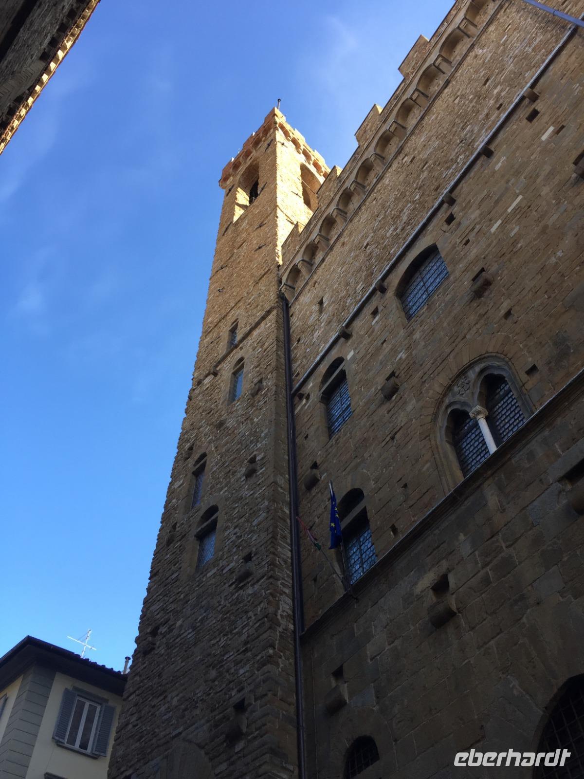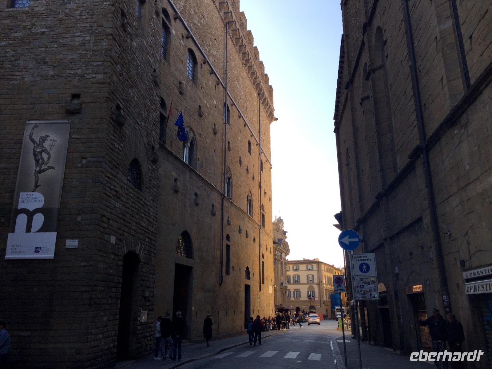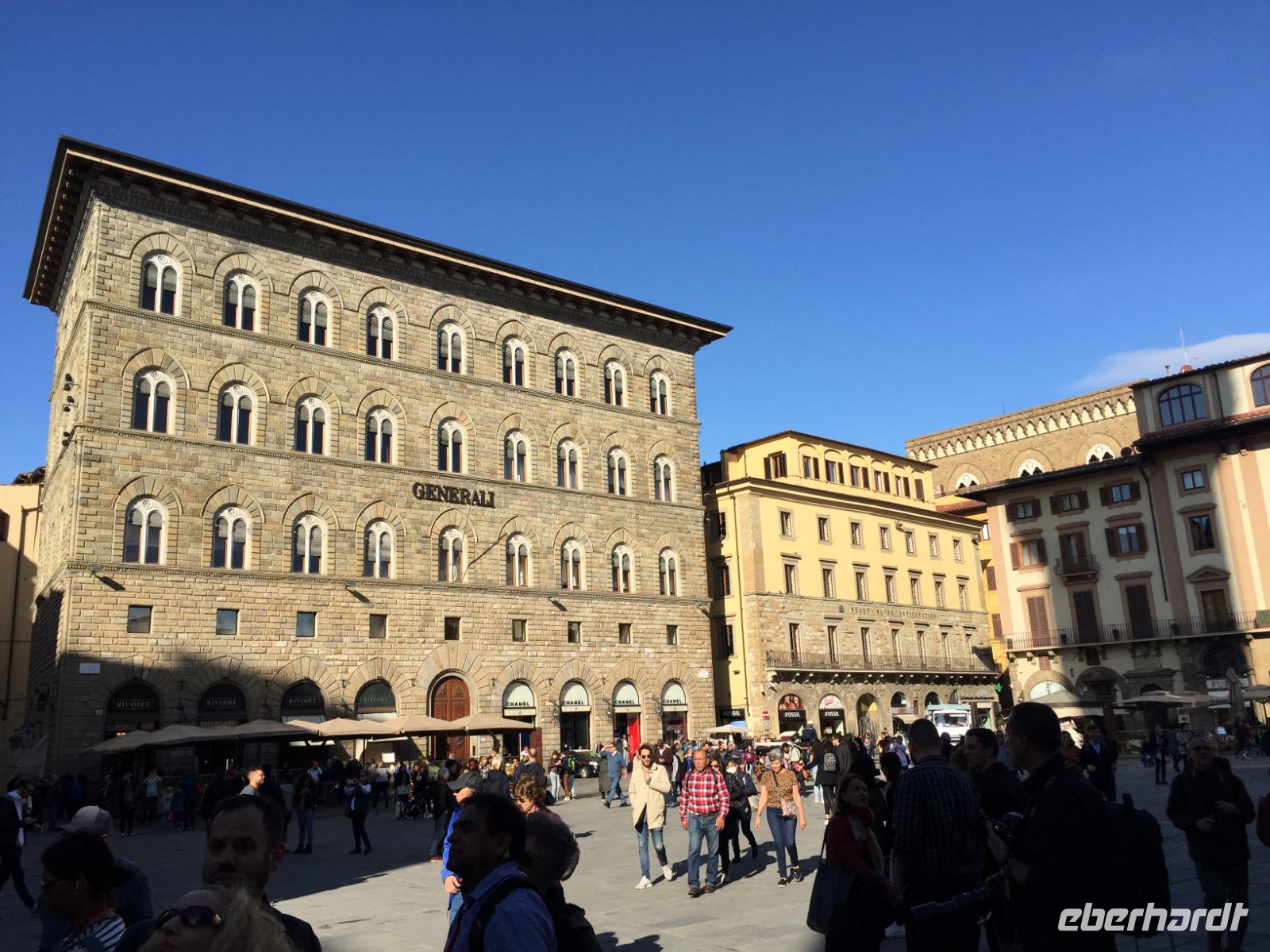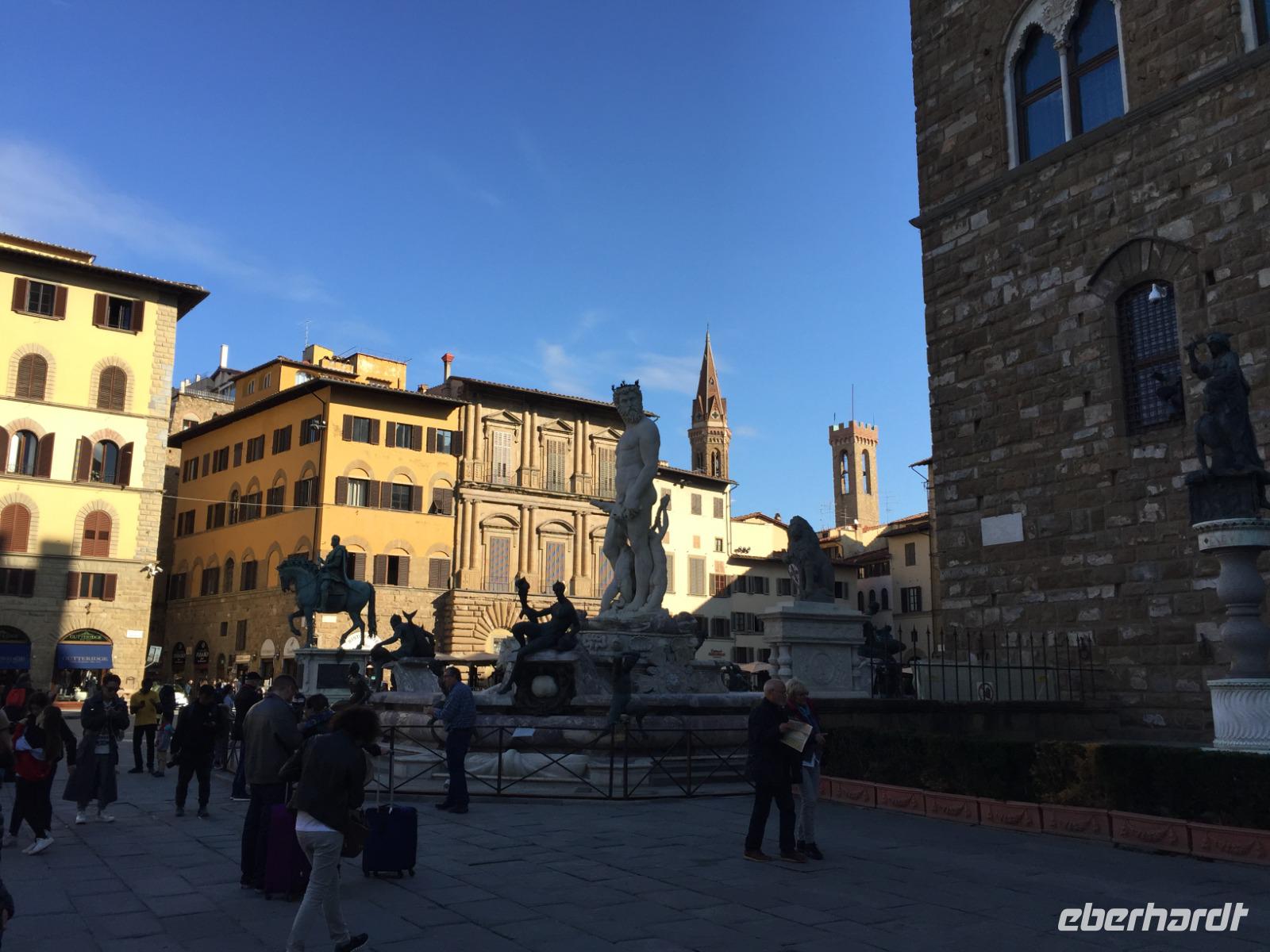 Gleich schräg gegenüber dem Hotel passieren wir den Palazzo del Bargello, der heute Nationalmuseum ist und Plastiken sowie Skulpturen beherbergt, die in den Uffizien keinen Platz mehr haben. Wir schlendern weiter über die kleine Piazza di San Firenze mit den zwei „zusammengewachsenen" Kirchen San Filippo Neri und Sant' Appolinare. Vorbei an weiteren stattlichen Renaissance-Palästen erreichen wir die Piazza della Signoria, den Hauptplatz von Florenz mit dem Neptunbrunnen, dem Palazzo Vecchio und der Loggia dei Lanzi, die mehreren Statuen Unterschlupf gewährt.