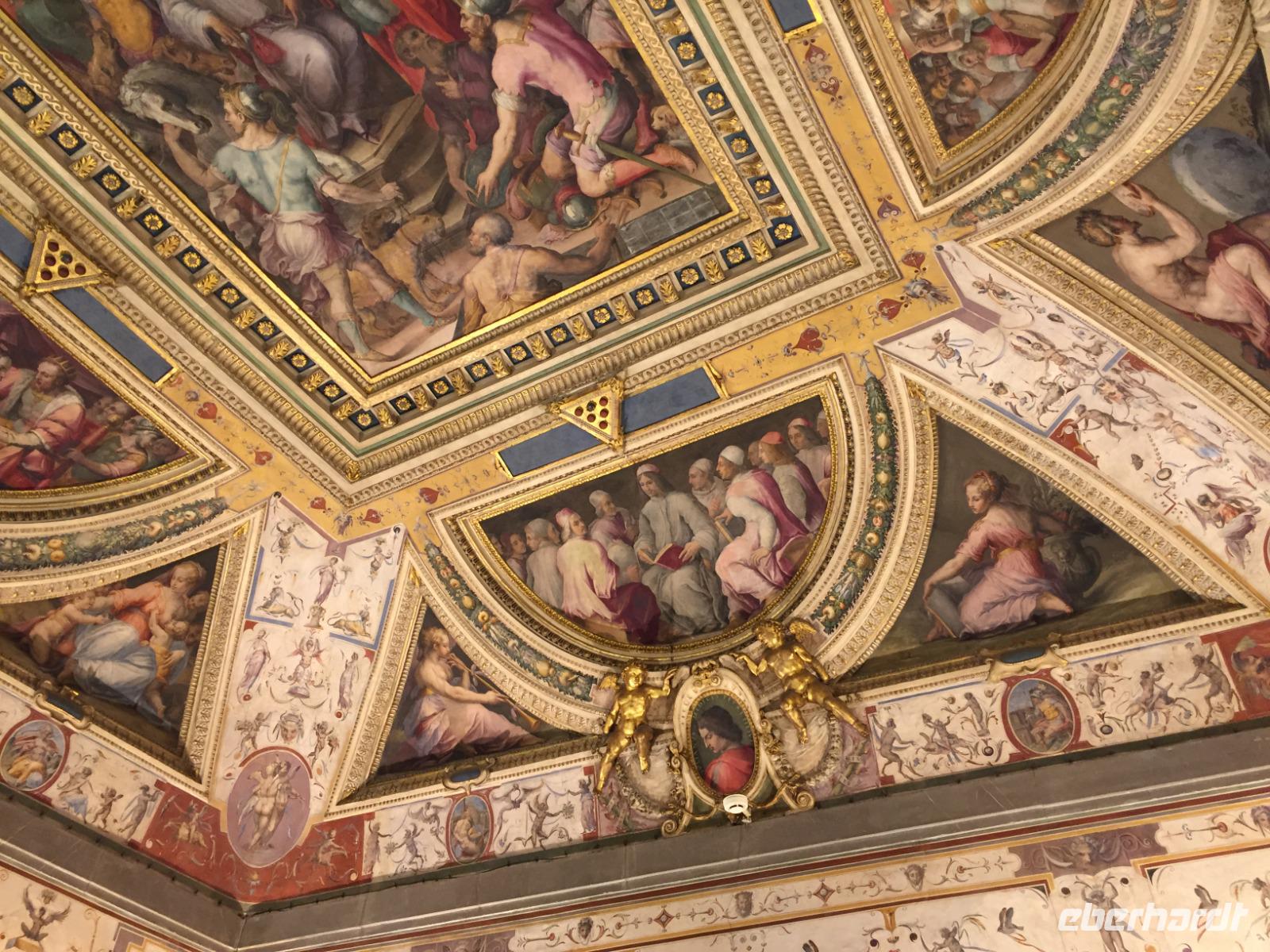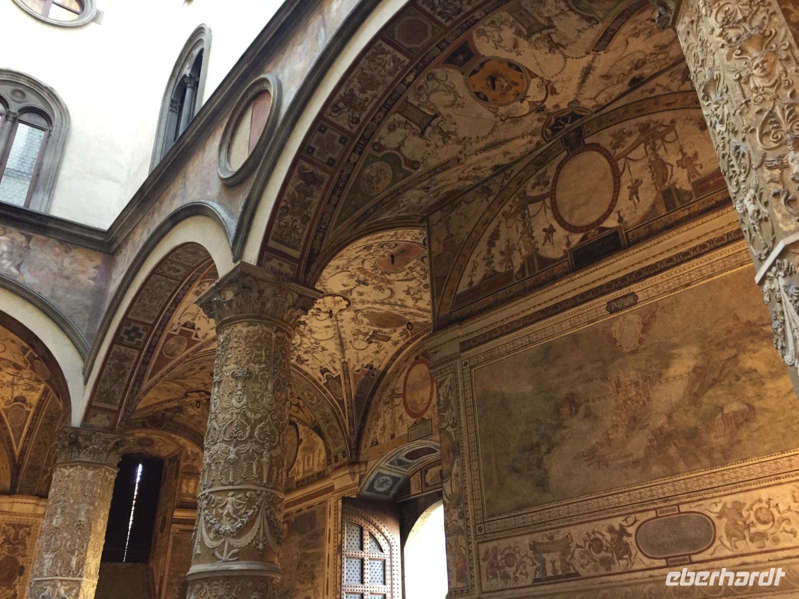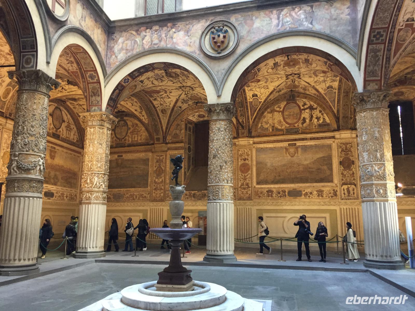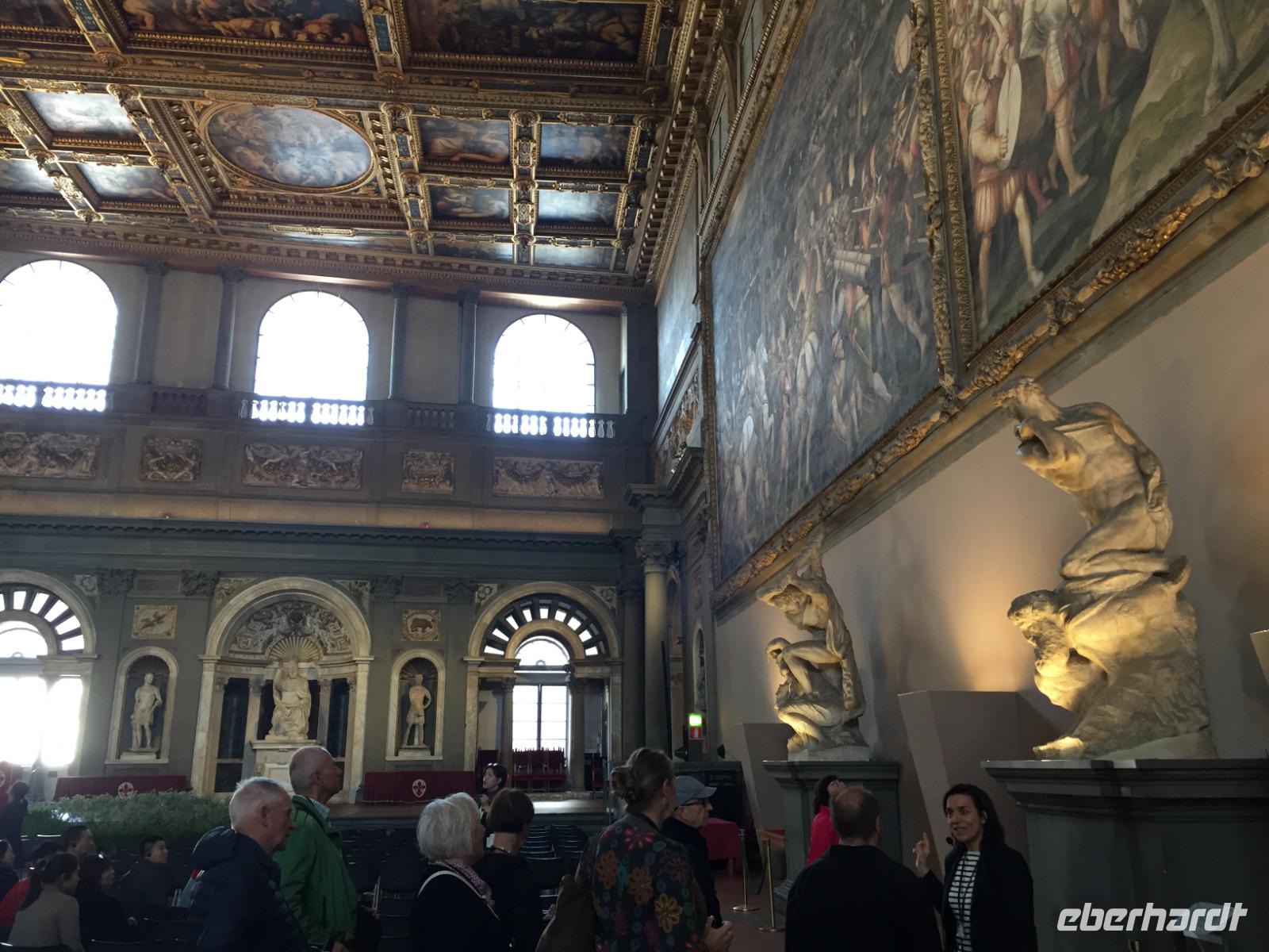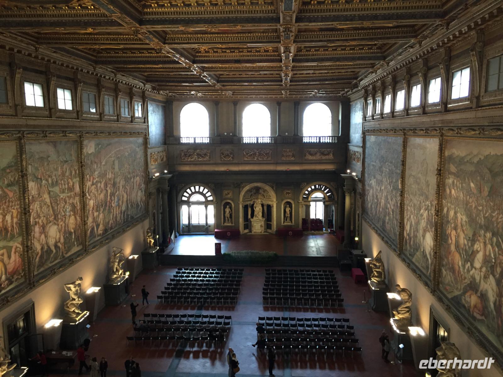 Obwohl die Innenbesichtigung des mächtigen Palazzo Vecchio nicht im Programm vorgesehen ist, planen wir diesen dennoch mit ein und besorgen die Tickets. Wir bestaunen nun diesen „Alten Palast", von dem früher die mächtige Republik von Florenz regiert wurde. Gleich zu Beginn betreten wir die „Sala dei Cinquecento" (Saal der Fünfhundert). Mit seinen Maßen 54 Meter Länge, 22 Meter Breite und 17 Meter Höhe gehört er zu den größten Räumlichkeiten der Stadt und dient noch heute als Ort für Audienzen und Events - eine Kulisse, die wir nicht hätten vermissen wollen bei unserem Besuch der Wiege der italienischen Renaissance! Das heutige Aussehen und vor allem die innere Ausstattung haben wir Cosimo I. de' Medici zu verdanken. Als er diesen Palast für seine private Residenz umfunktionieren ließ, veranlasste er unter anderem die Umstrukturierung und eben die tolle Dekoration. So erhielt der Bau sein heutiges Aussehen und wurde zum Palazzo Ducale (Herzogenpalast). Später, als Cosimo I. seinen Wohnsitz in den Palazzo Pitti verlegte, wurde aus dem Palazzo Ducale der Palazzo Vecchio und somit zum Sitz einiger Regierungsämter. Weiterhin gab Cosimo I. einen Laufgang in Auftrag, der den Palazzo Vecchio mit der Verwaltung der Uffizien und dem Palazzo Pitti verbinden sollte - der Vasari-Korridor, der uns auf unserem weiteren Weg durch die Stadt immer wieder begleitet.