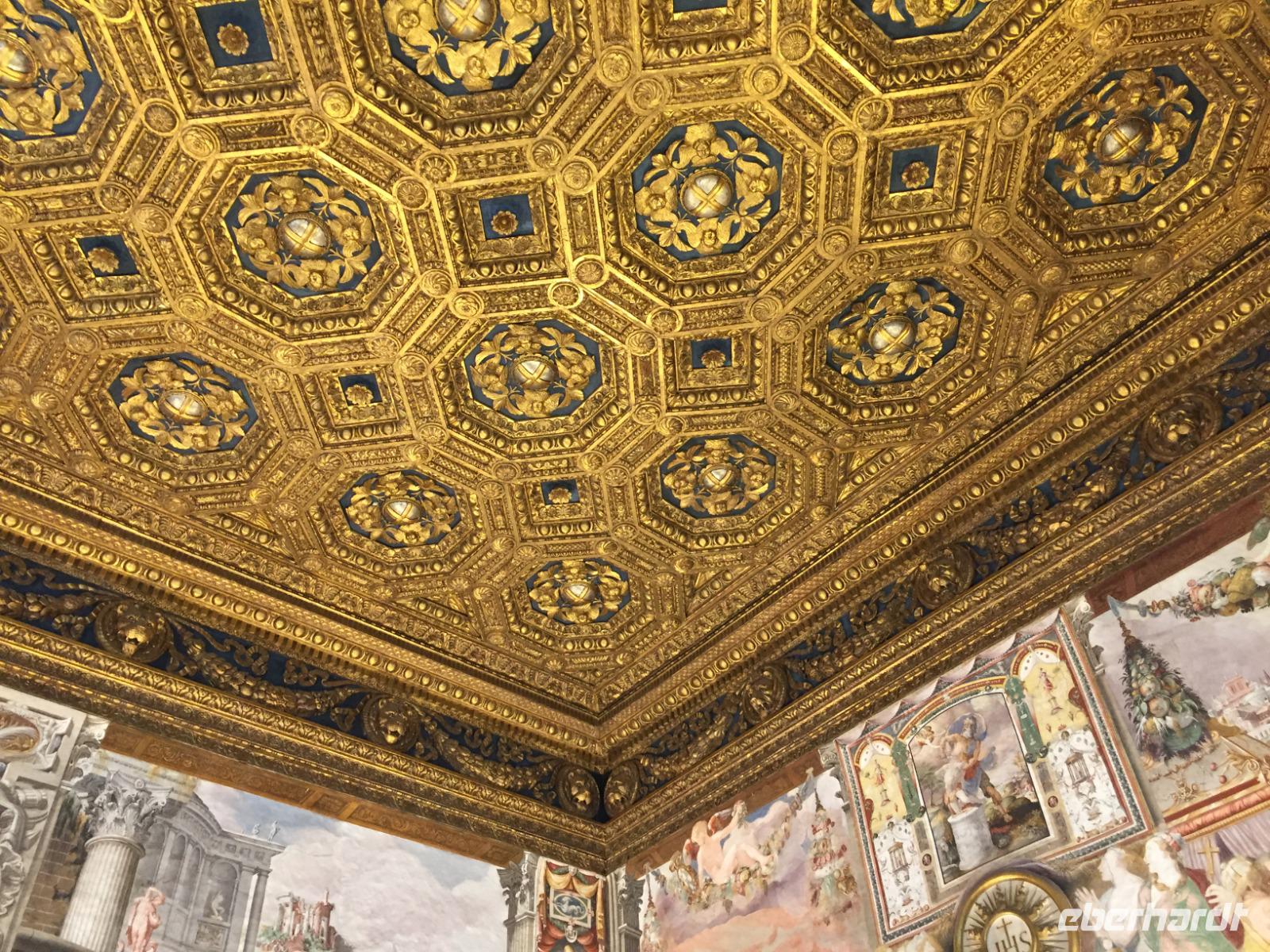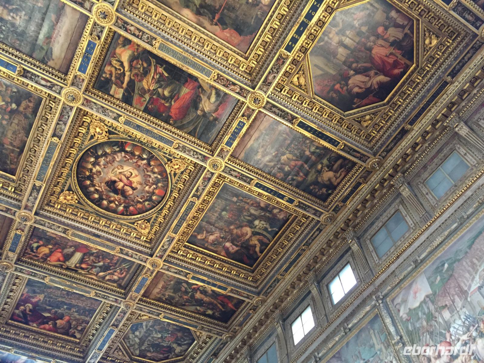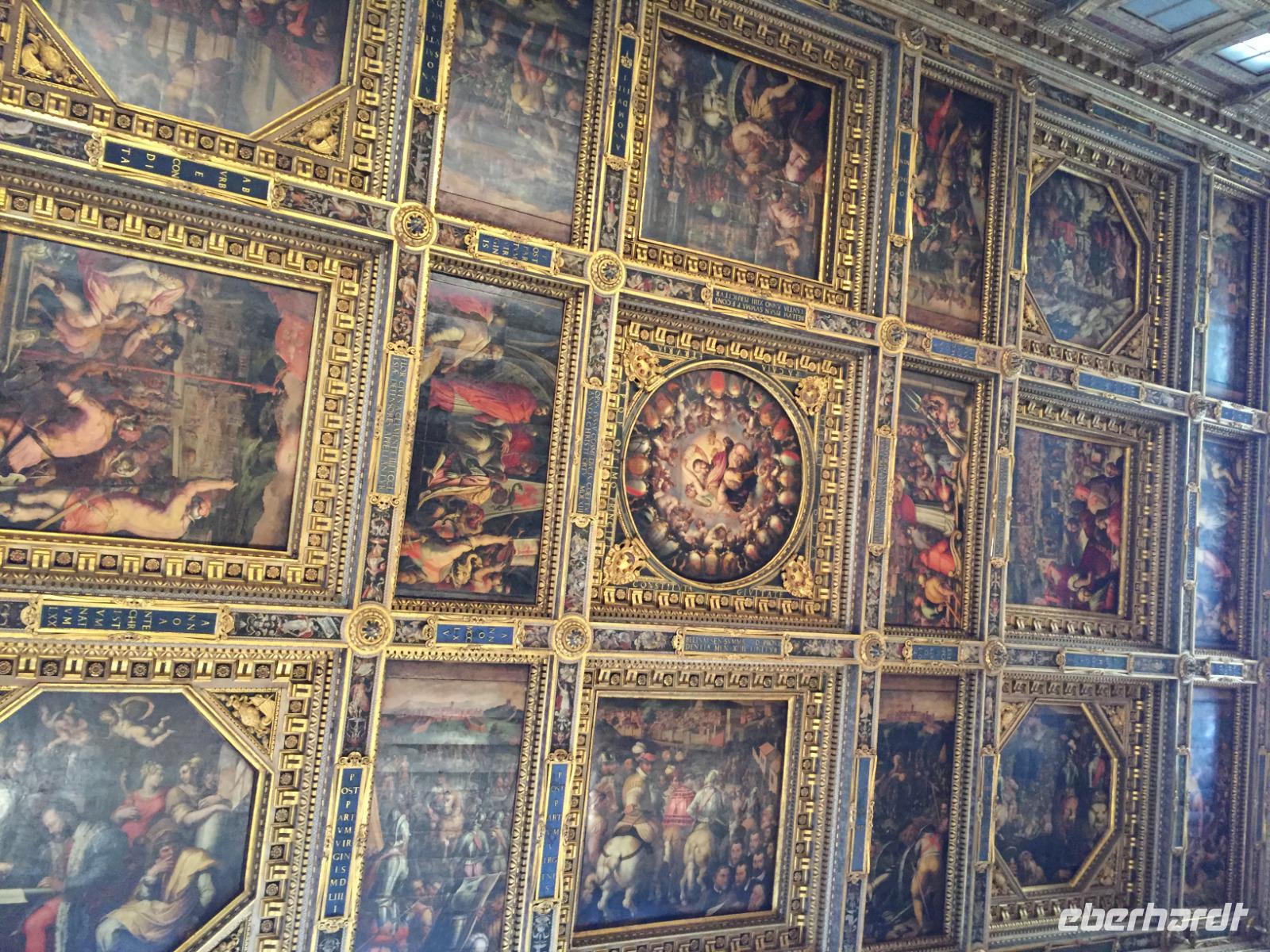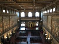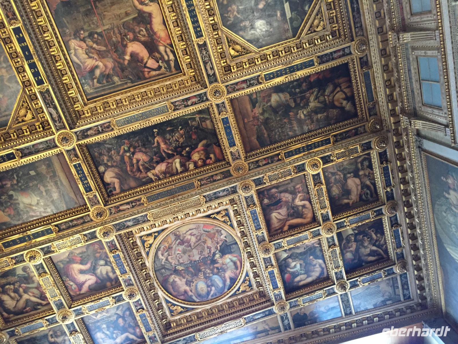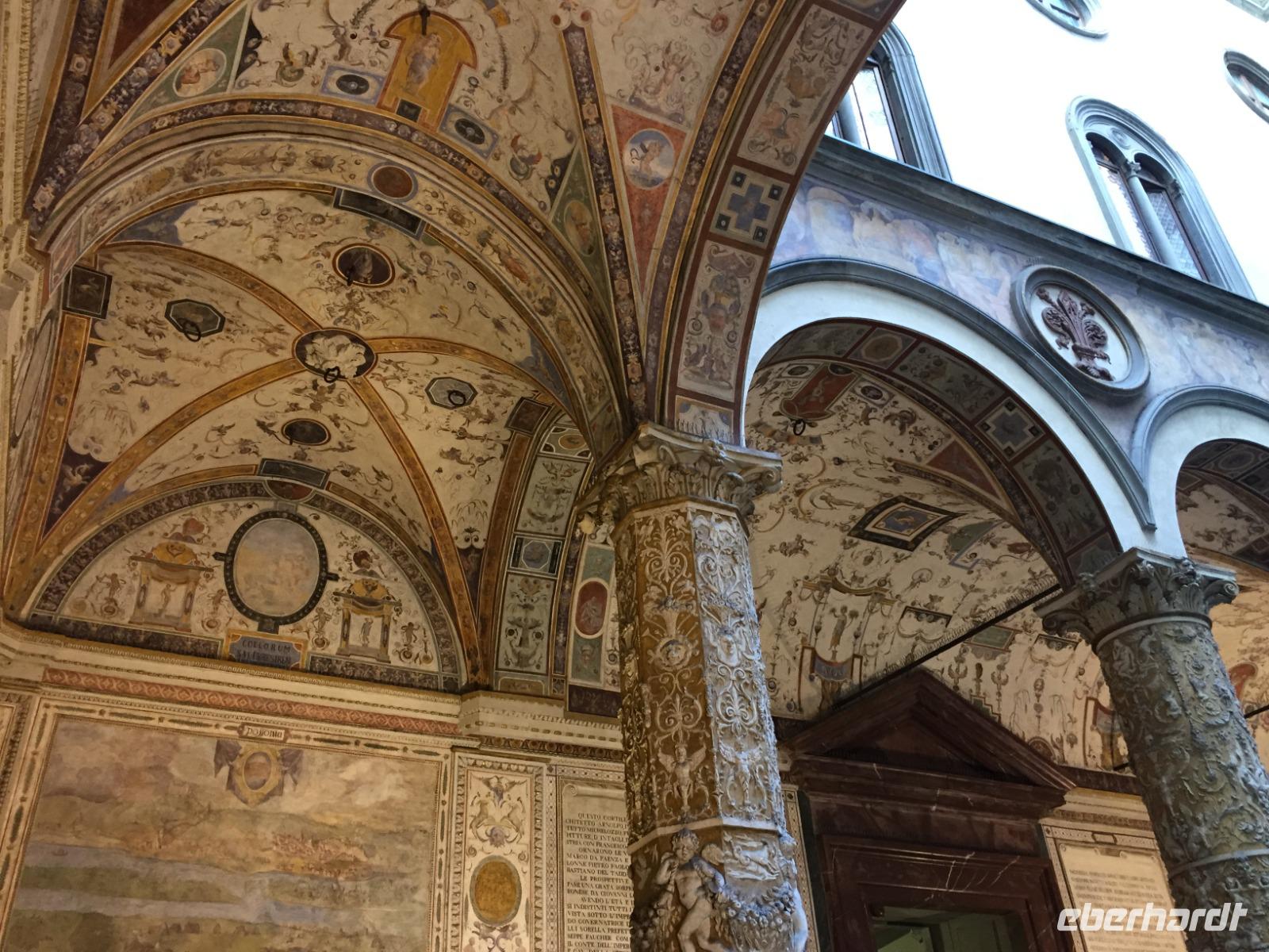 Obwohl die Innenbesichtigung des mächtigen Palazzo Vecchio nicht im Programm vorgesehen ist, planen wir diesen dennoch mit ein und besorgen die Tickets. Wir bestaunen nun diesen „Alten Palast", von dem früher die mächtige Republik von Florenz regiert wurde. Gleich zu Beginn betreten wir die „Sala dei Cinquecento" (Saal der Fünfhundert). Mit seinen Maßen 54 Meter Länge, 22 Meter Breite und 17 Meter Höhe gehört er zu den größten Räumlichkeiten der Stadt und dient noch heute als Ort für Audienzen und Events - eine Kulisse, die wir nicht hätten vermissen wollen bei unserem Besuch der Wiege der italienischen Renaissance! Das heutige Aussehen und vor allem die innere Ausstattung haben wir Cosimo I. de' Medici zu verdanken. Als er diesen Palast für seine private Residenz umfunktionieren ließ, veranlasste er unter anderem die Umstrukturierung und eben die tolle Dekoration. So erhielt der Bau sein heutiges Aussehen und wurde zum Palazzo Ducale (Herzogenpalast). Später, als Cosimo I. seinen Wohnsitz in den Palazzo Pitti verlegte, wurde aus dem Palazzo Ducale der Palazzo Vecchio und somit zum Sitz einiger Regierungsämter. Weiterhin gab Cosimo I. einen Laufgang in Auftrag, der den Palazzo Vecchio mit der Verwaltung der Uffizien und dem Palazzo Pitti verbinden sollte - der Vasari-Korridor, der uns auf unserem weiteren Weg durch die Stadt immer wieder begleitet.