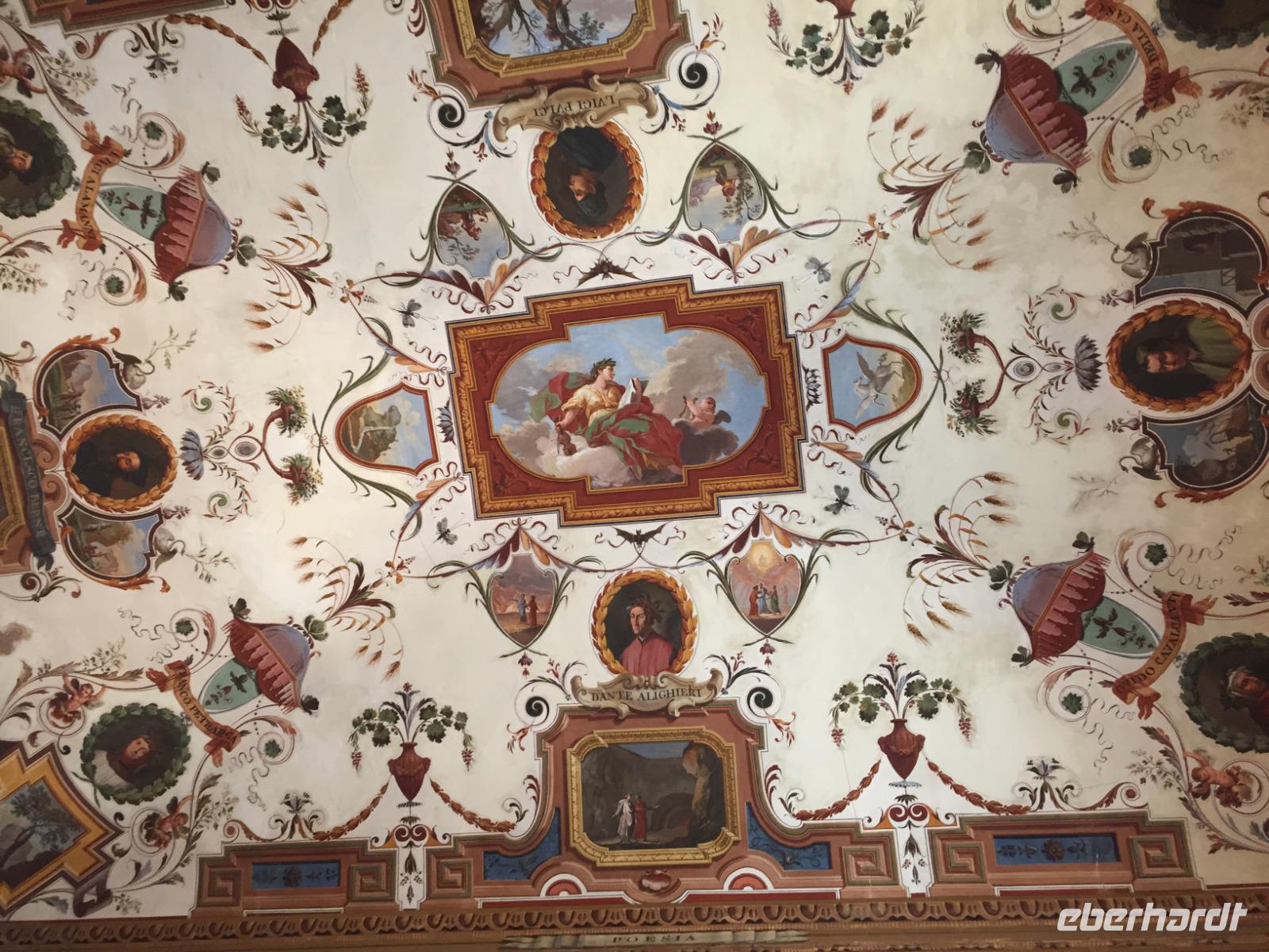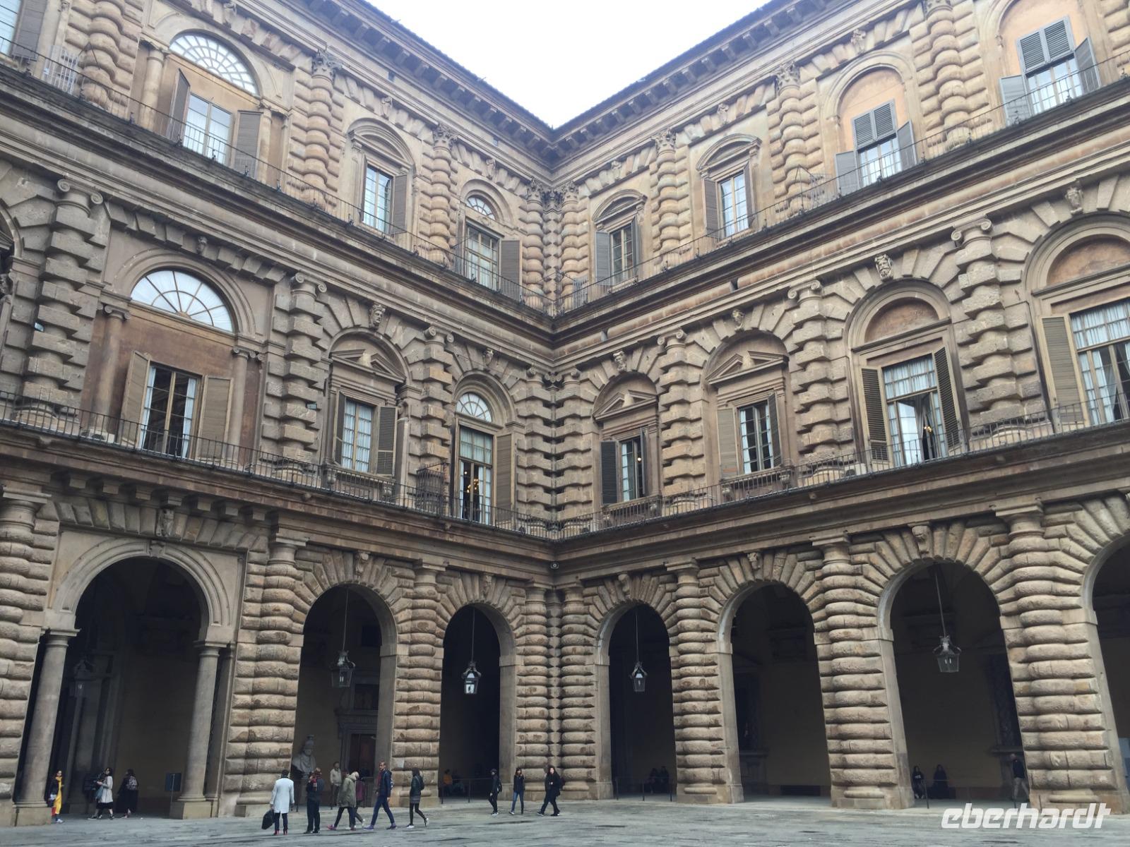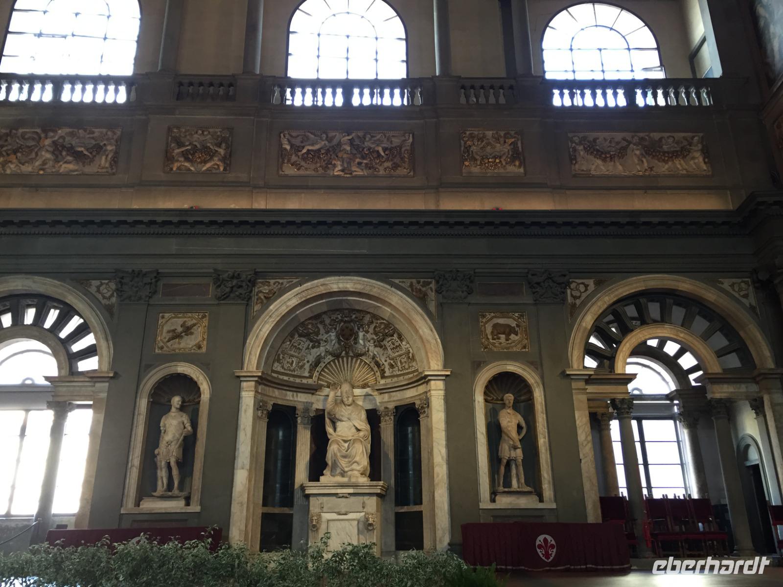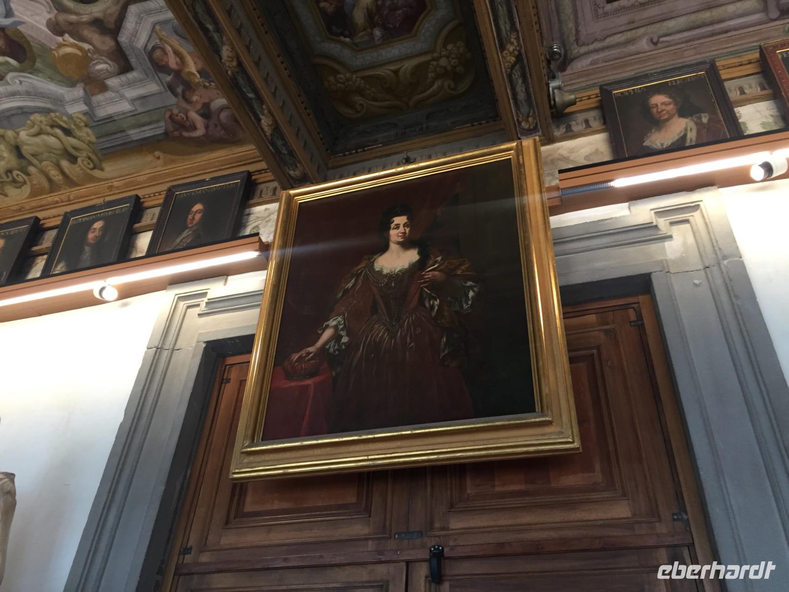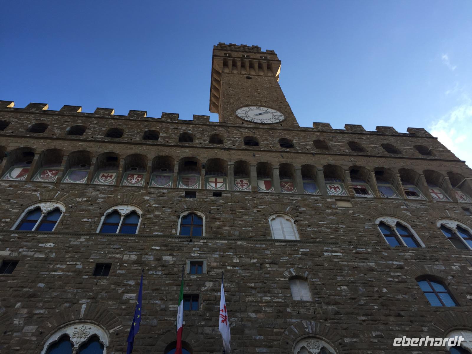 Obwohl die Innenbesichtigung des mächtigen Palazzo Vecchio nicht im Programm vorgesehen ist, planen wir diesen dennoch mit ein und besorgen die Tickets. Wir bestaunen nun diesen „Alten Palast", von dem früher die mächtige Republik von Florenz regiert wurde. Gleich zu Beginn betreten wir die „Sala dei Cinquecento" (Saal der Fünfhundert). Mit seinen Maßen 54 Meter Länge, 22 Meter Breite und 17 Meter Höhe gehört er zu den größten Räumlichkeiten der Stadt und dient noch heute als Ort für Audienzen und Events - eine Kulisse, die wir nicht hätten vermissen wollen bei unserem Besuch der Wiege der italienischen Renaissance! Das heutige Aussehen und vor allem die innere Ausstattung haben wir Cosimo I. de' Medici zu verdanken. Als er diesen Palast für seine private Residenz umfunktionieren ließ, veranlasste er unter anderem die Umstrukturierung und eben die tolle Dekoration. So erhielt der Bau sein heutiges Aussehen und wurde zum Palazzo Ducale (Herzogenpalast). Später, als Cosimo I. seinen Wohnsitz in den Palazzo Pitti verlegte, wurde aus dem Palazzo Ducale der Palazzo Vecchio und somit zum Sitz einiger Regierungsämter. Weiterhin gab Cosimo I. einen Laufgang in Auftrag, der den Palazzo Vecchio mit der Verwaltung der Uffizien und dem Palazzo Pitti verbinden sollte - der Vasari-Korridor, der uns auf unserem weiteren Weg durch die Stadt immer wieder begleitet.