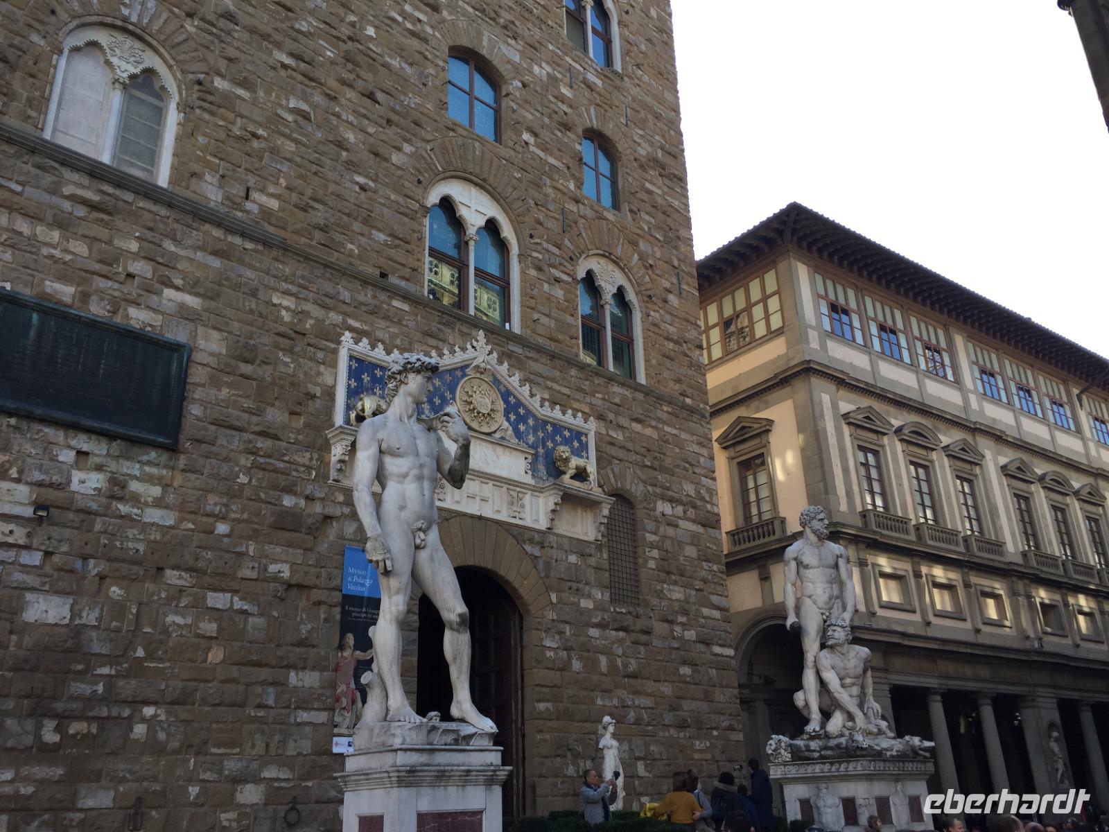 Vor dem Palazzo bestaunten wir den David von Michelangelo, eine Monumentalstatue der Hochrenaissance und wohl die bekannteste Skulptur der Kunstgeschichte! Und Angela wusste natürlich die eine oder andere Anekdote darüber zu berichten. Wir sehen hier nur die originalgetreue Kopie, das Original verweilt in der Galleria dell'Accademia, ebenfalls in Florenz.