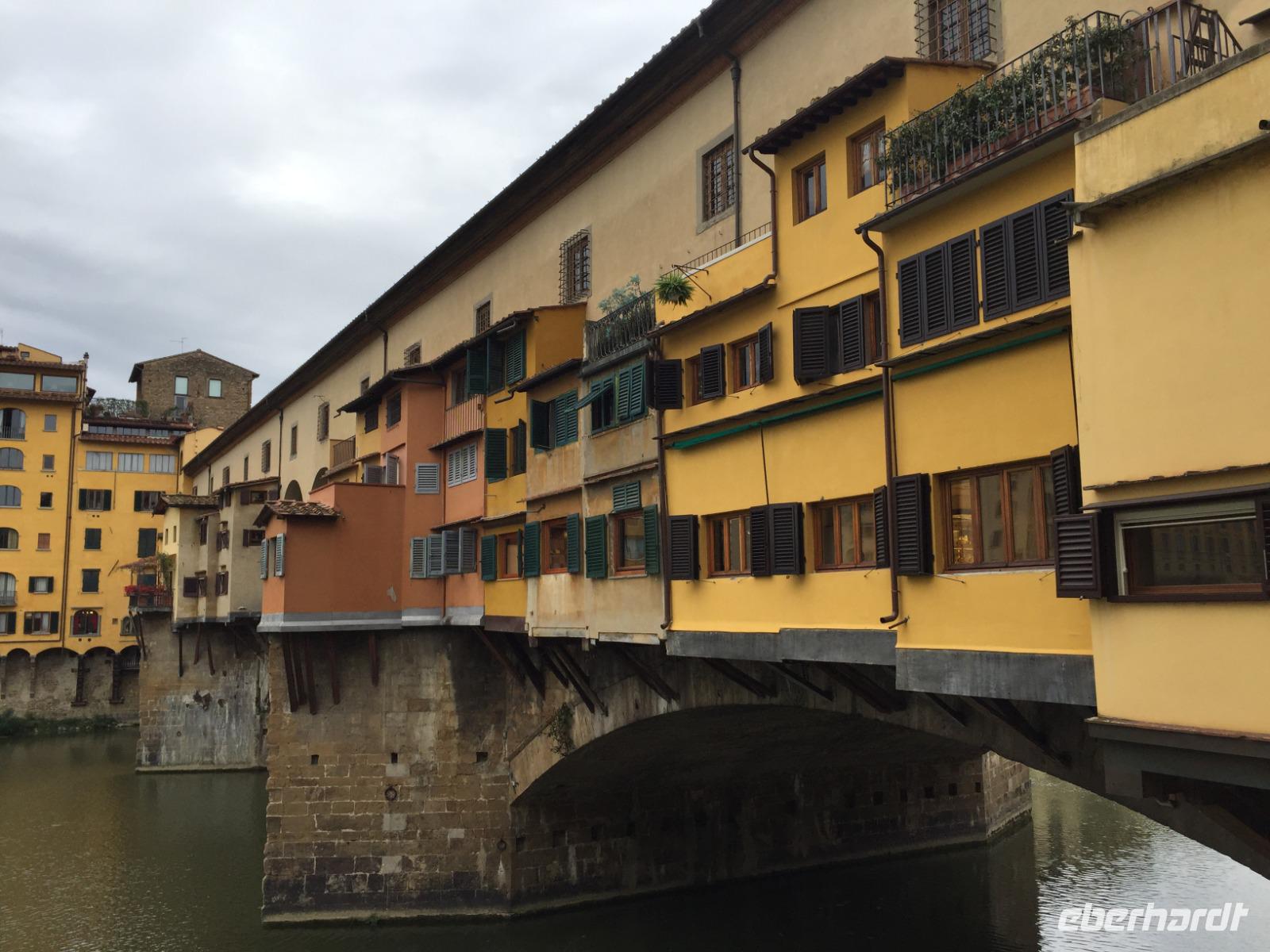 Wir spazieren weiter zur Fontana del Nettuno (Neptunbrunnen) vom Architekten Bartolomeo Ammannati (Baujahr 1565), der diesen zum Anlass der Hochzeit von Medici Francesco mit Johanna von Österreich schuf. Noch ein letztes Mal geht es durch den prunkvoll ausgestatteten Innenhof des Palazzo Vecchio, vorbei an den Uffizien Richtung Arno. Wir überqueren diesen über die Ponte Vecchio, die wohl berühmteste Brücke der Stadt.