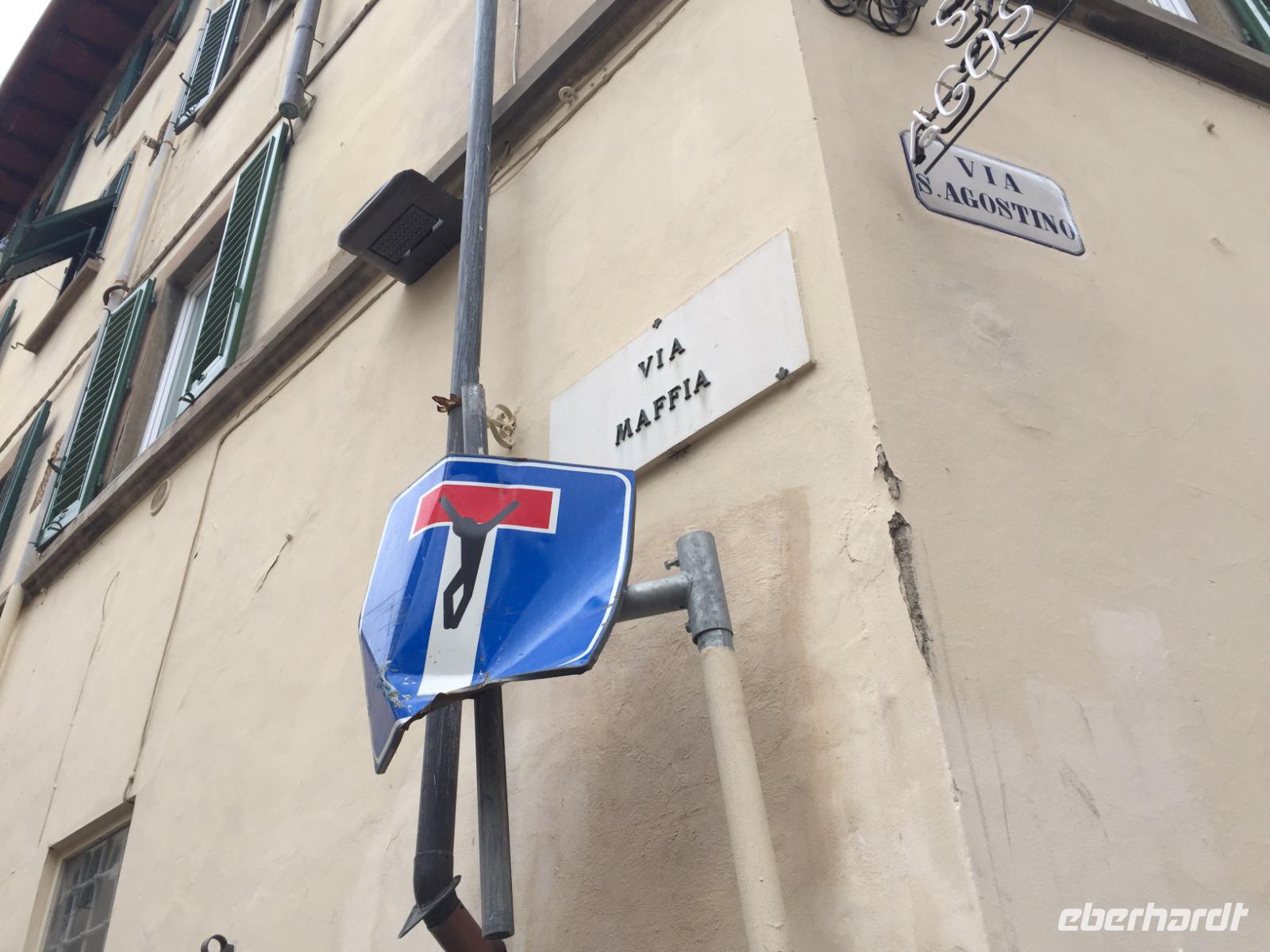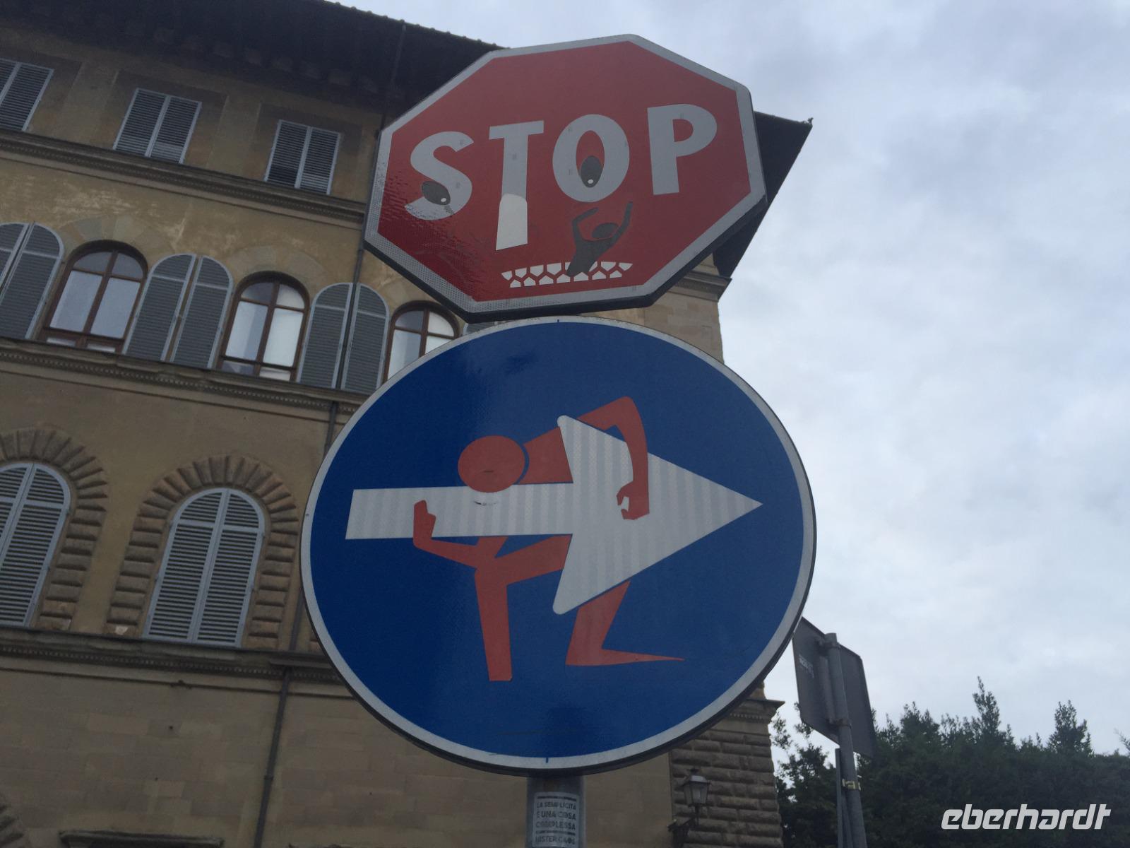 Oh, was ist das denn? Auf einem „Einfahrt verboten"-Schild hat eine kleine grazile Figur in Form einer Eiskunstläuferin den weißen Balken erobert und am Sackgassenschild wurde Jesus gekreuzigt. Eine tolle Idee des StreetArt-Künstlers Abraham Clet, dessen kleine Werkstatt wir kurz besuchen.