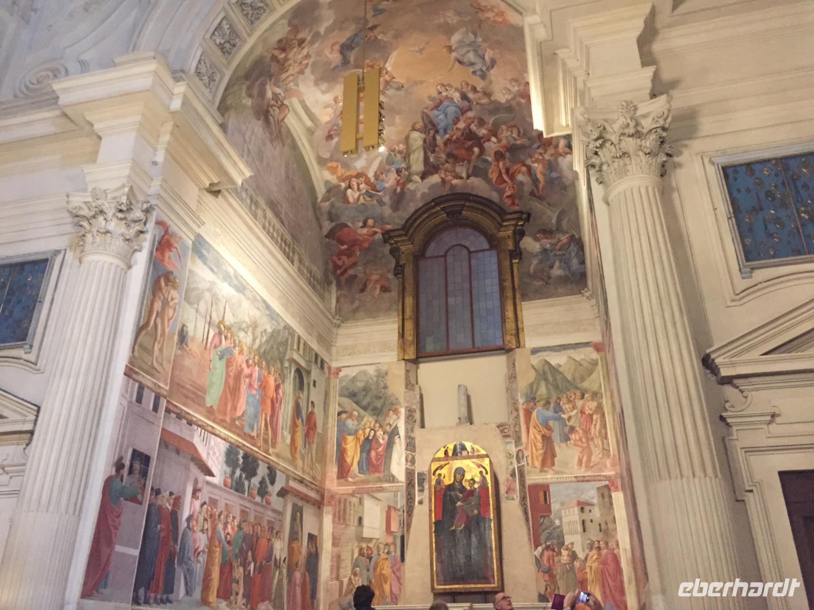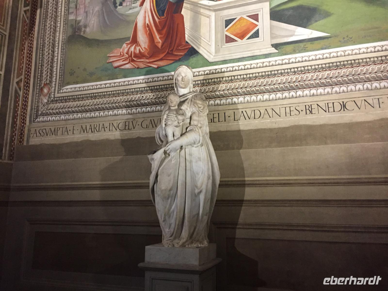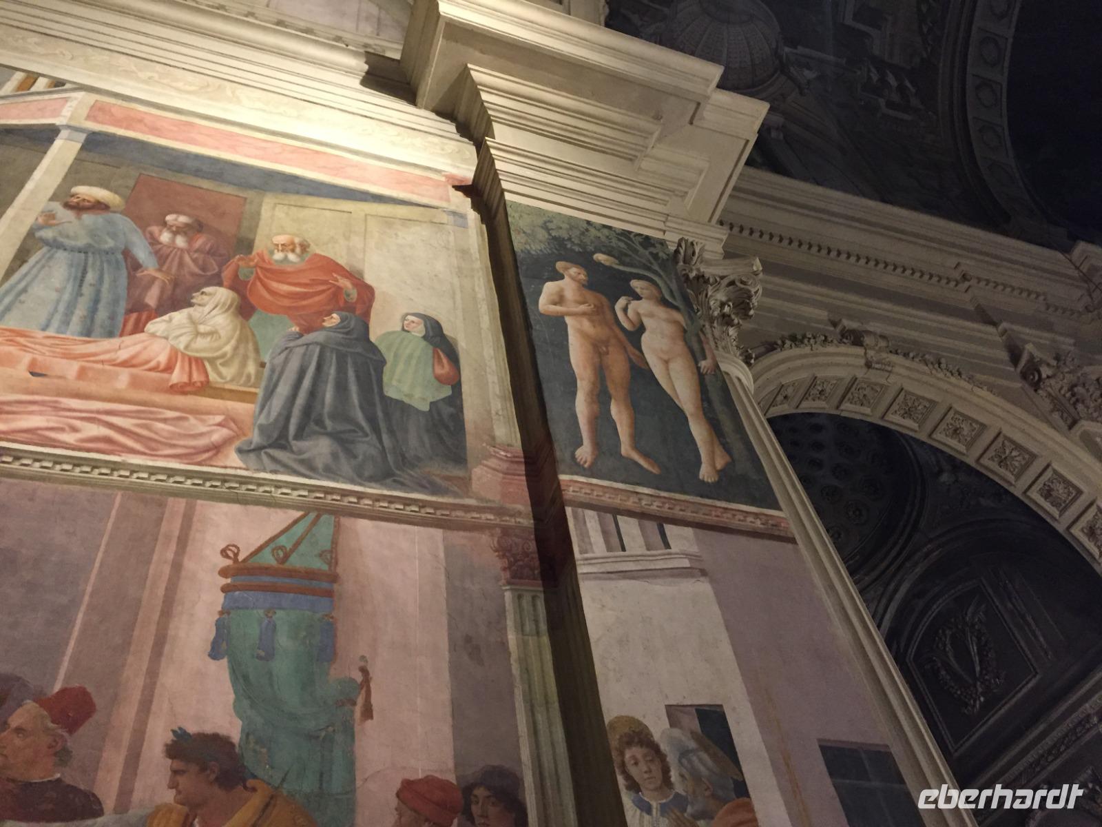 In einer kleinen, familiären Bar finden wir für unsere kleine Reisefamilie Platz und wir stärken uns mit Pizza, Caprese-Salat oder Focaccia. Unser Spaziergang führt uns dann weiter ins Stadtviertel Santo Spirito mit der gleichnamigen Kirche und Piazza. Ziel ist die Brancacci-Kapelle in der Kirche Santa Maria del Carmine. Hier haben wir ein gebuchtes Zeitfenster, da nur eine begrenzte Anzahl an Besuchern Einlass gewährt wird. Angela ist wieder in ihrem Element während Sie uns den grandiosen Freskenzyklus von Masolino, Masaccio und Filippino Lippi erklärt. In verschiedenen Epochen wurden Momente aus dem Leben des heiligen Petrus und der Erbsünde dargestellt. Dabei gibt es deutliche Unterschiede zwischen den Schöpfern: zarte und elegante Figuren von Masolino stehen im Kontrast zu den kräftigen von Masaccio, die ebenfalls durch den Einsatz der Perspektive noch verstärkt werden.