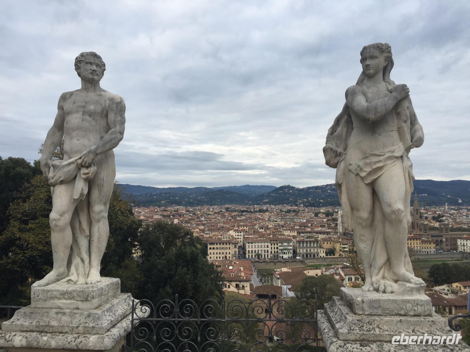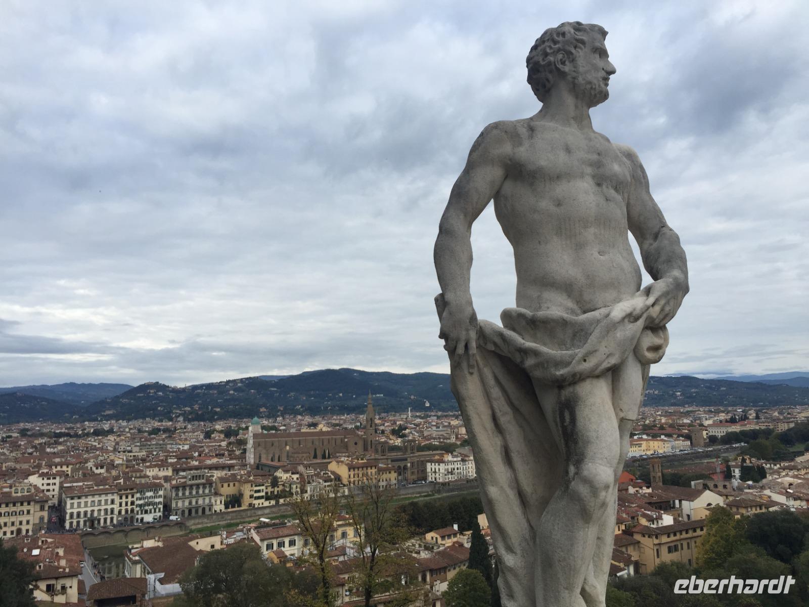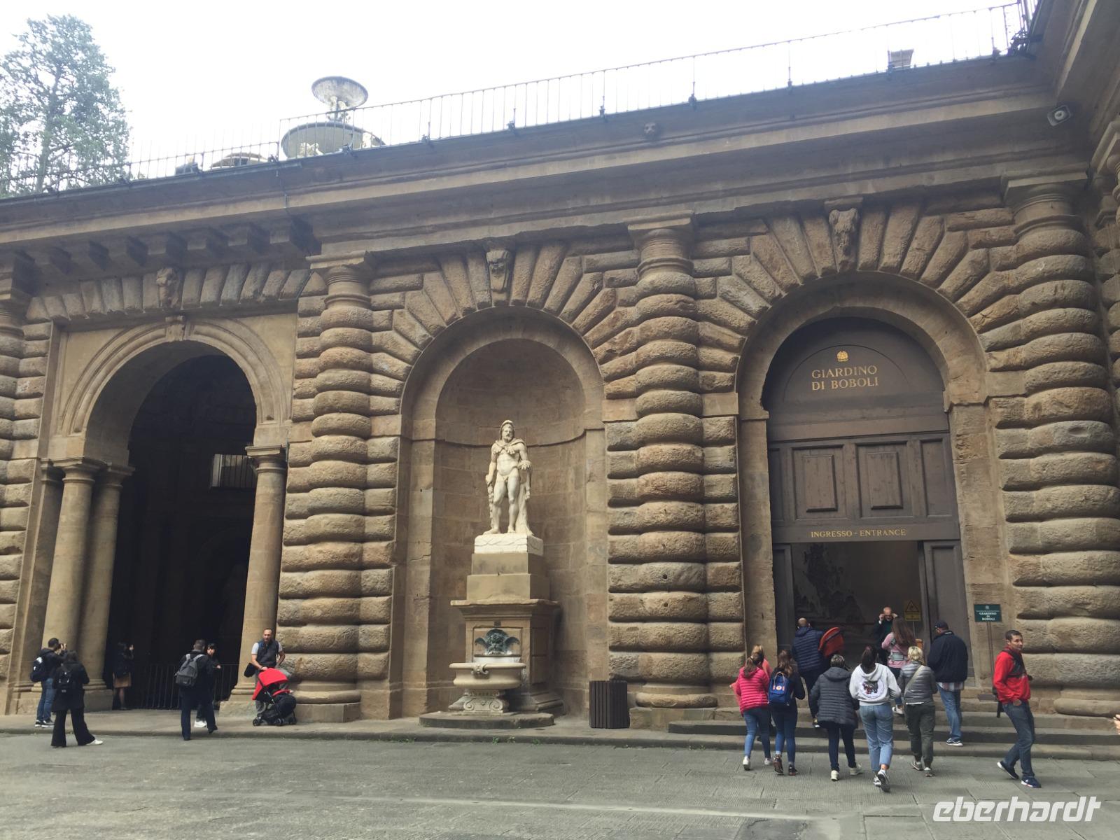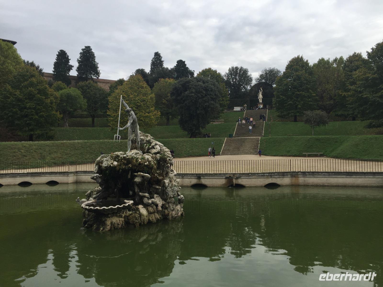 Wir spazieren nun weiter und erreichen schon bald den Palazzo Pitti, den Endpunkt des Vasari- Korridors, der im Palazzo Vecchio beginnt. Ups - die Warteschlange ist länger als gedacht...Angela verschwindet kurz und dann haben wir die Tickets für die Gärten auch schon. Schon praktisch, wenn man einen stadtbekannten Guide dabei hat! Der imposante Palazzo Pitti wurde von Eleonora da Toledo (Frau von Cosimo I. de Medici) gekauft und so restauriert und umgebaut, wie man ihn heute sieht. Nach dem Untergang der Medici ging der Palast in den Besitz des Hauses Habsburg-Lothringen über und diente auch als Wohnsitz für Napoleon während seiner Herrschaft über Italien. Heute ist der Palazzo ein monumentaler Museumskomplex mit Skulpturen, Gemälden, Kunstobjekten, Kostümen und Porzellan. Wir nutzen den Palazzo, um in den dahinterliegenden Boboli-Garten zu gelangen - der bekannteste Garten der Stadt. Wir durchstreifen dieses Freilichtmuseum aus Statuen aus der Antike und der Renaissance, sehen das Nymphäum, das Theater, den Neptunbrunnen und die Statue der Göttin Fortuna. Oben angekommen, werden wir mit einem schönen Blick hinunter auf den Palast und die uns zu Füßen liegende Stadt Florenz belohnt.