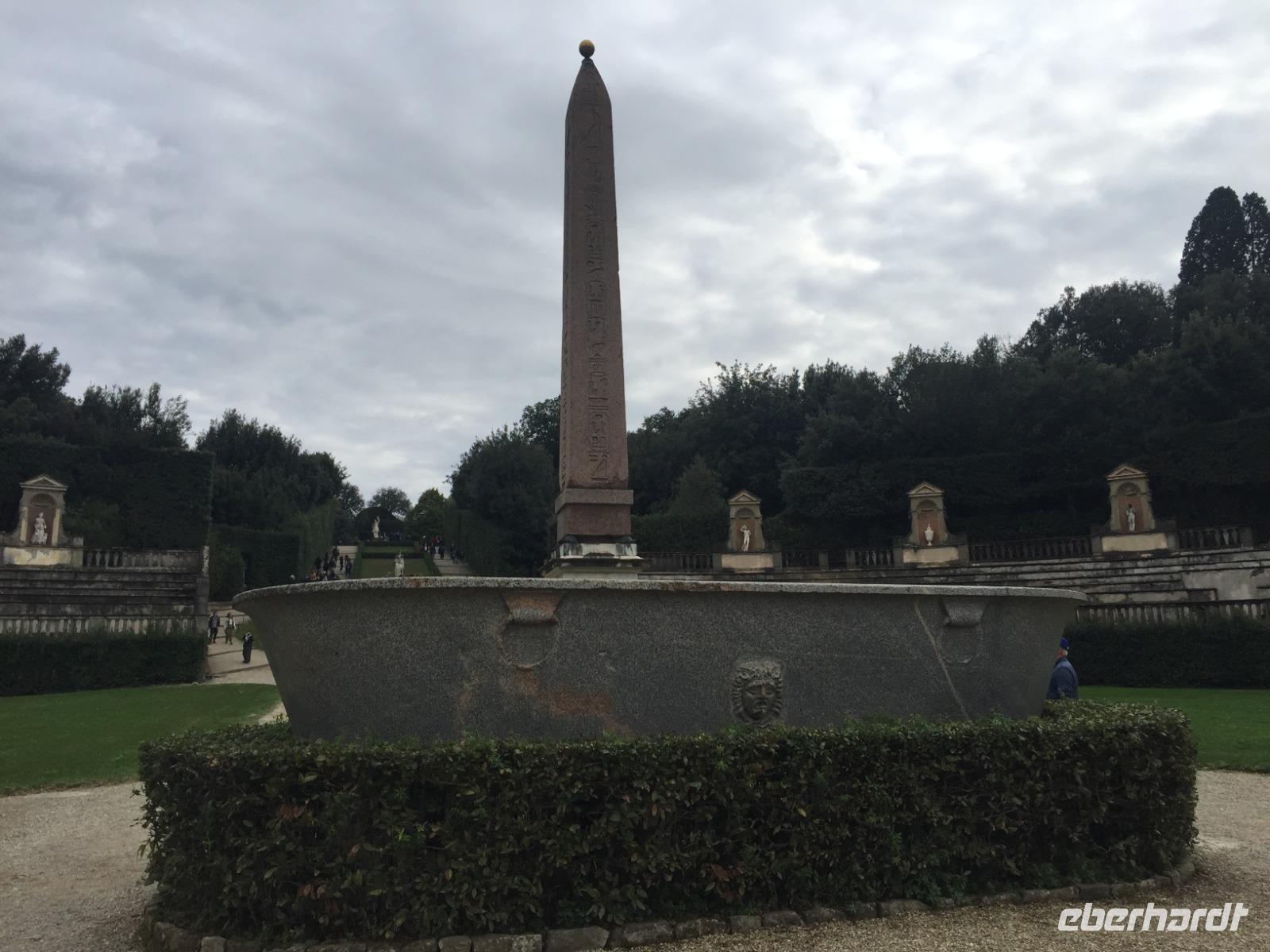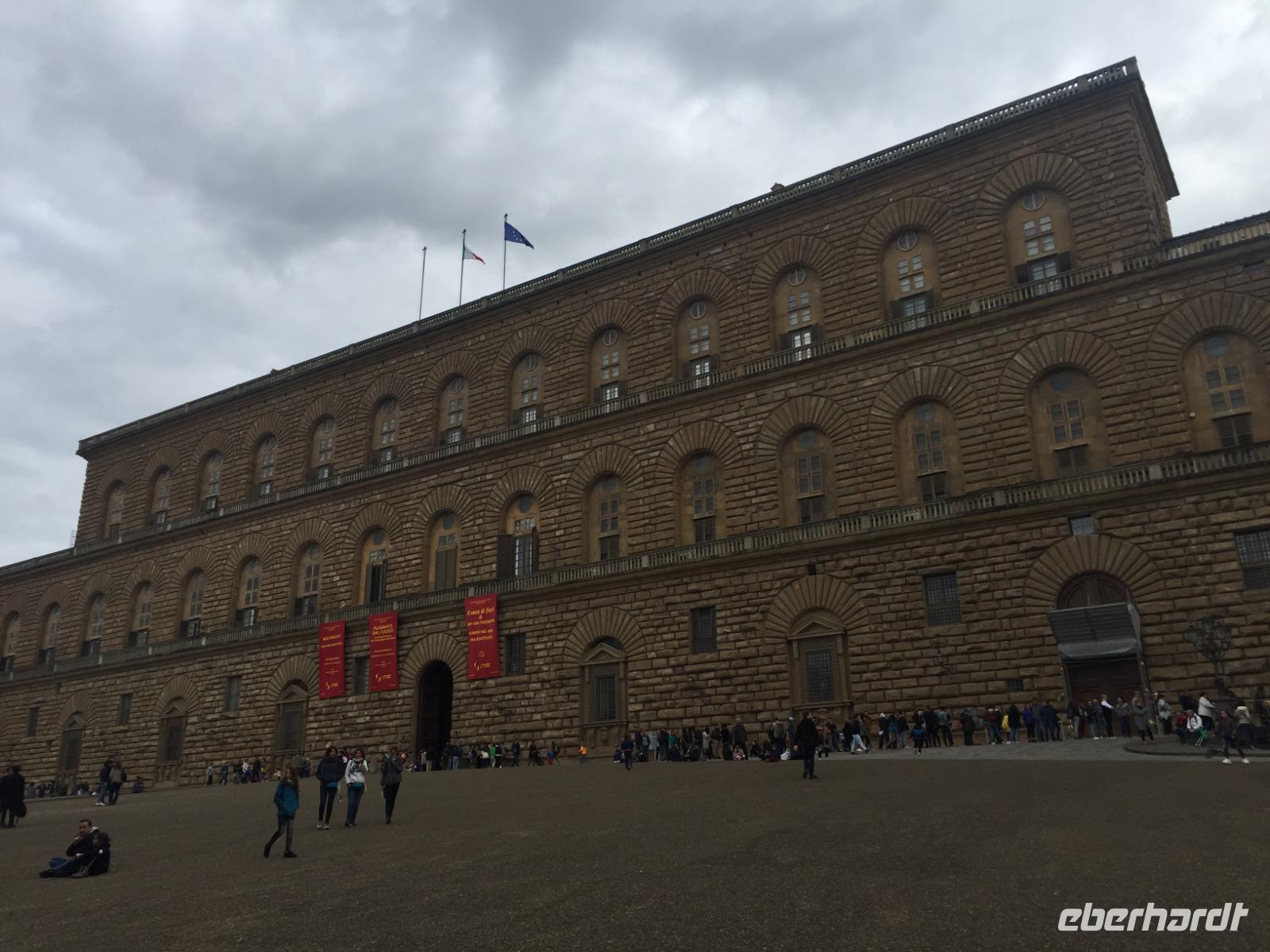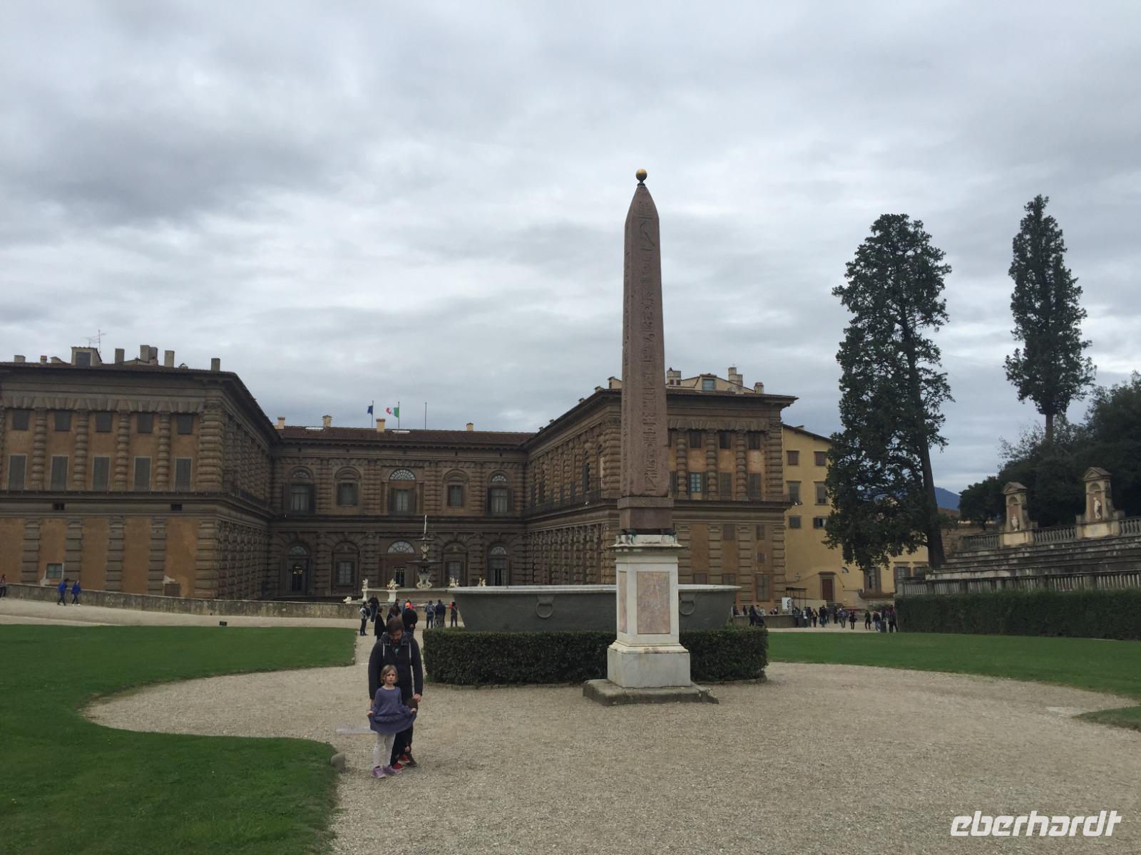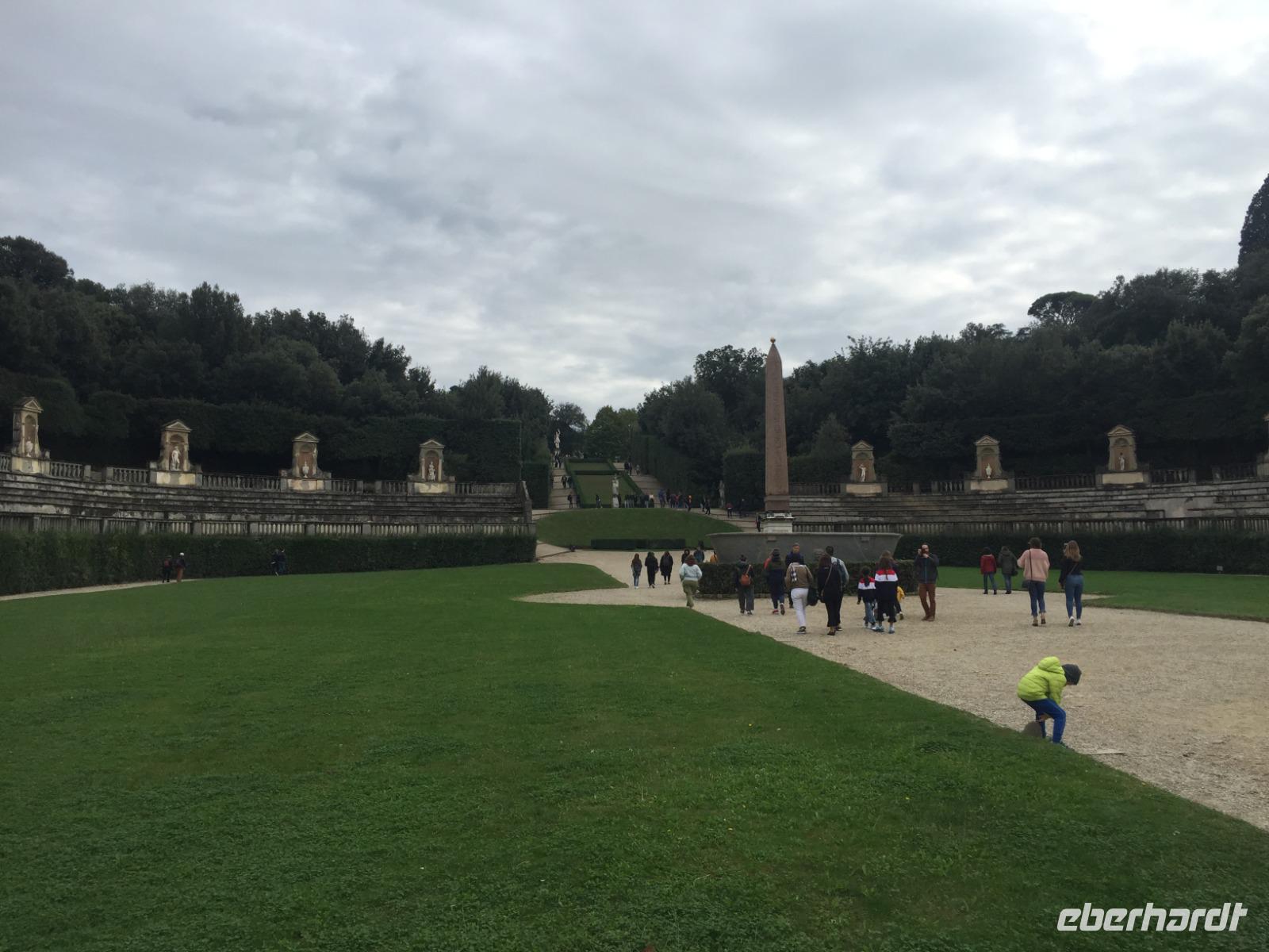 Wir spazieren nun weiter und erreichen schon bald den Palazzo Pitti, den Endpunkt des Vasari- Korridors, der im Palazzo Vecchio beginnt. Ups - die Warteschlange ist länger als gedacht...Angela verschwindet kurz und dann haben wir die Tickets für die Gärten auch schon. Schon praktisch, wenn man einen stadtbekannten Guide dabei hat! Der imposante Palazzo Pitti wurde von Eleonora da Toledo (Frau von Cosimo I. de Medici) gekauft und so restauriert und umgebaut, wie man ihn heute sieht. Nach dem Untergang der Medici ging der Palast in den Besitz des Hauses Habsburg-Lothringen über und diente auch als Wohnsitz für Napoleon während seiner Herrschaft über Italien. Heute ist der Palazzo ein monumentaler Museumskomplex mit Skulpturen, Gemälden, Kunstobjekten, Kostümen und Porzellan. Wir nutzen den Palazzo, um in den dahinterliegenden Boboli-Garten zu gelangen - der bekannteste Garten der Stadt. Wir durchstreifen dieses Freilichtmuseum aus Statuen aus der Antike und der Renaissance, sehen das Nymphäum, das Theater, den Neptunbrunnen und die Statue der Göttin Fortuna. Oben angekommen, werden wir mit einem schönen Blick hinunter auf den Palast und die uns zu Füßen liegende Stadt Florenz belohnt.