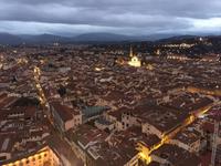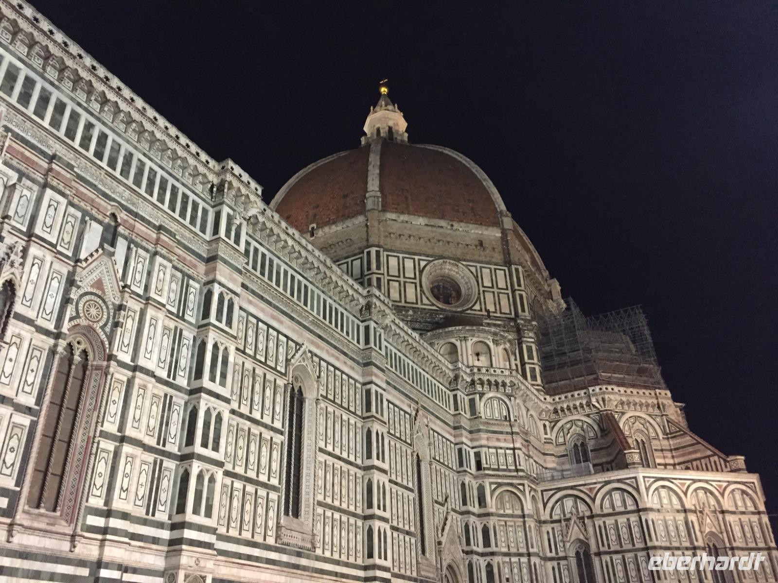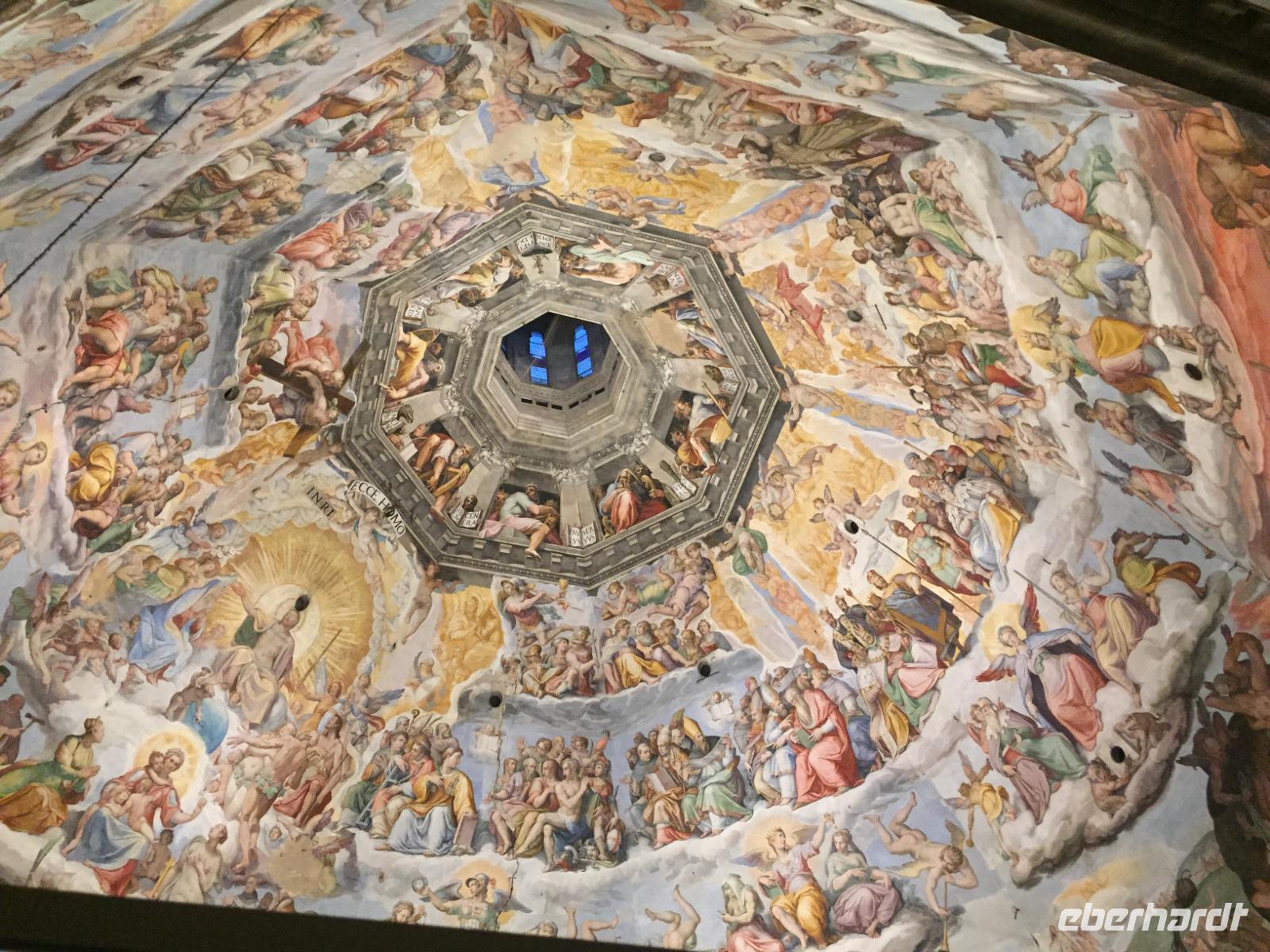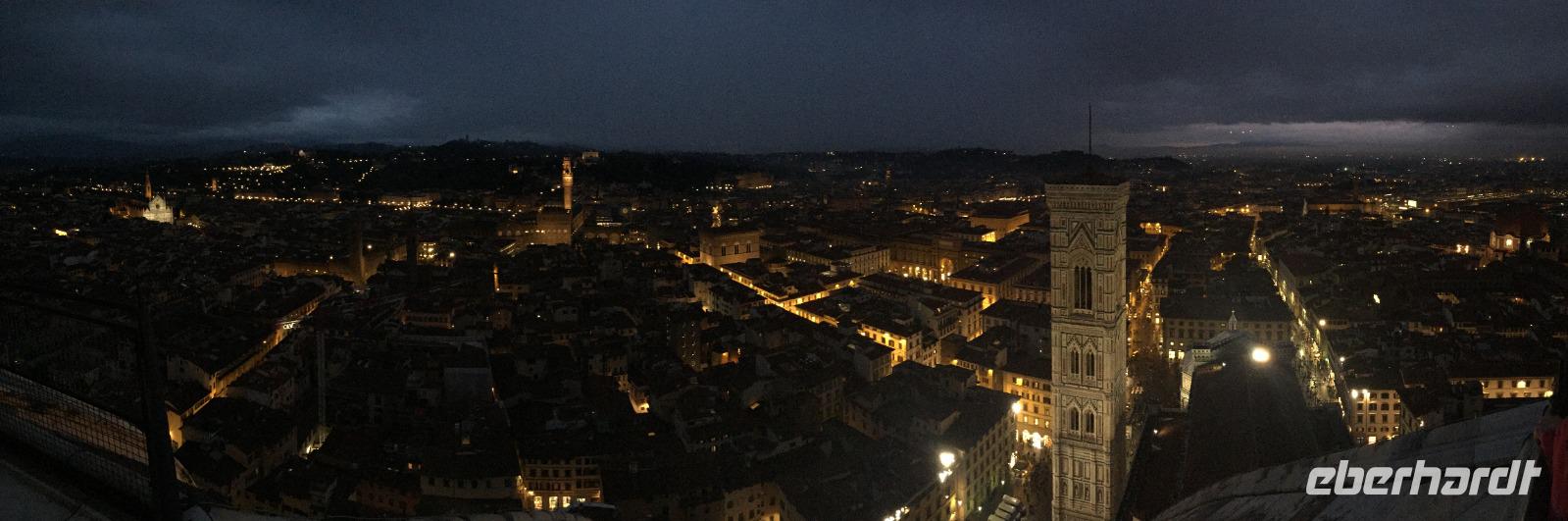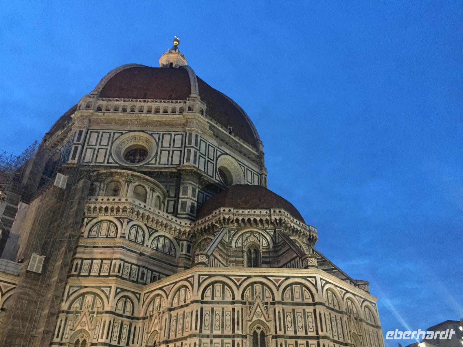 Auch diese Zeit verstreicht wie im Fluge und nun steigen wir Stufe für Stufe hinauf in die Kuppel - ein Wunder der Technik, wie uns Angela erzählt. Denn eigentlich war es im 15. Jahrhundert unmöglich, solch eine gigantische Kuppel zu errichten. Doch Filippo Brunelleschi schaffte das, was niemand für möglich hielt. Zum Glück, denn sonst hätten wir dieses Highlight verpasst! Eine Verschnaufpause am unteren Ring der Kuppel, deren Durchmesser 45 Meter und Höhe 107 Meter misst, ermöglicht uns, das 4000 Quadratmeter große Fesko des Jüngsten Gerichts von Giorgio Vasari und Federico Zuccari zu bewundern. Oben in der Spitze angekommen, werden wir mit einem unbeschreiblichen Ausblick über die Dächer der bereits beleuchteten Stadt belohnt - Bella Firenze liegt uns zu Füßen und lässt uns staunen!