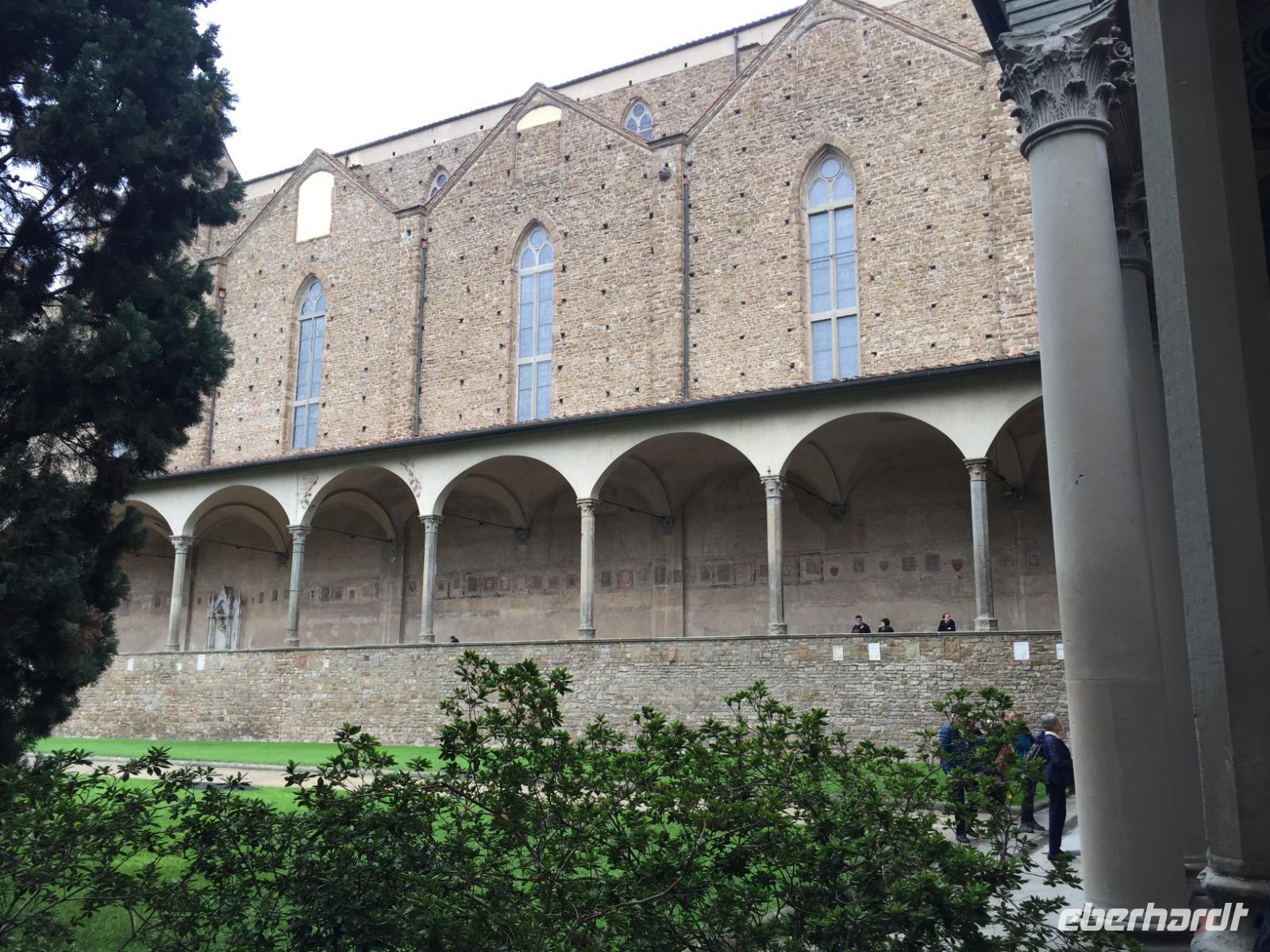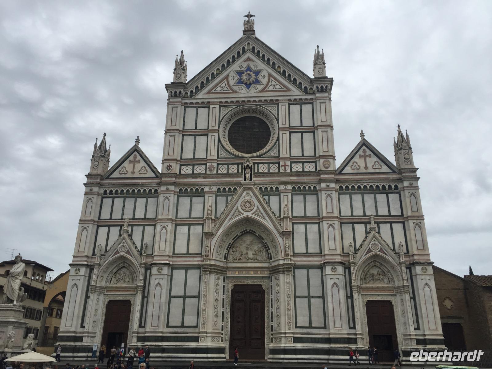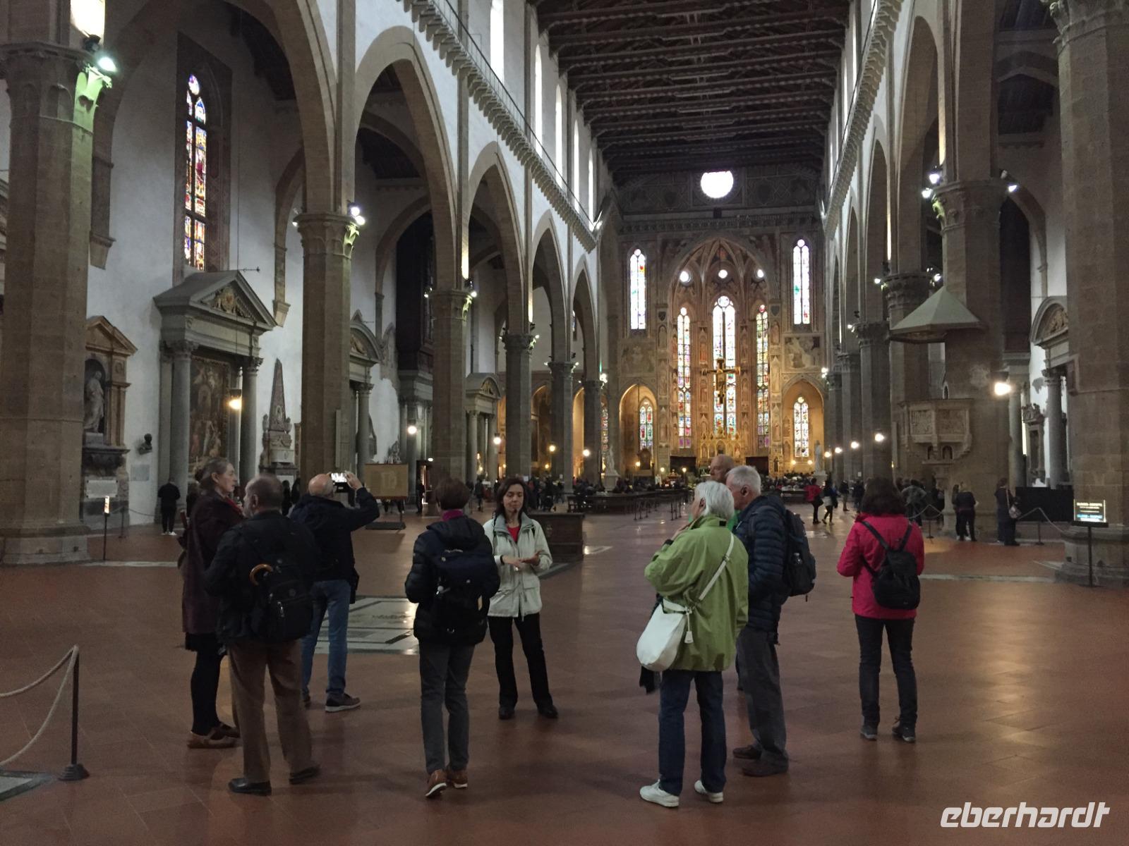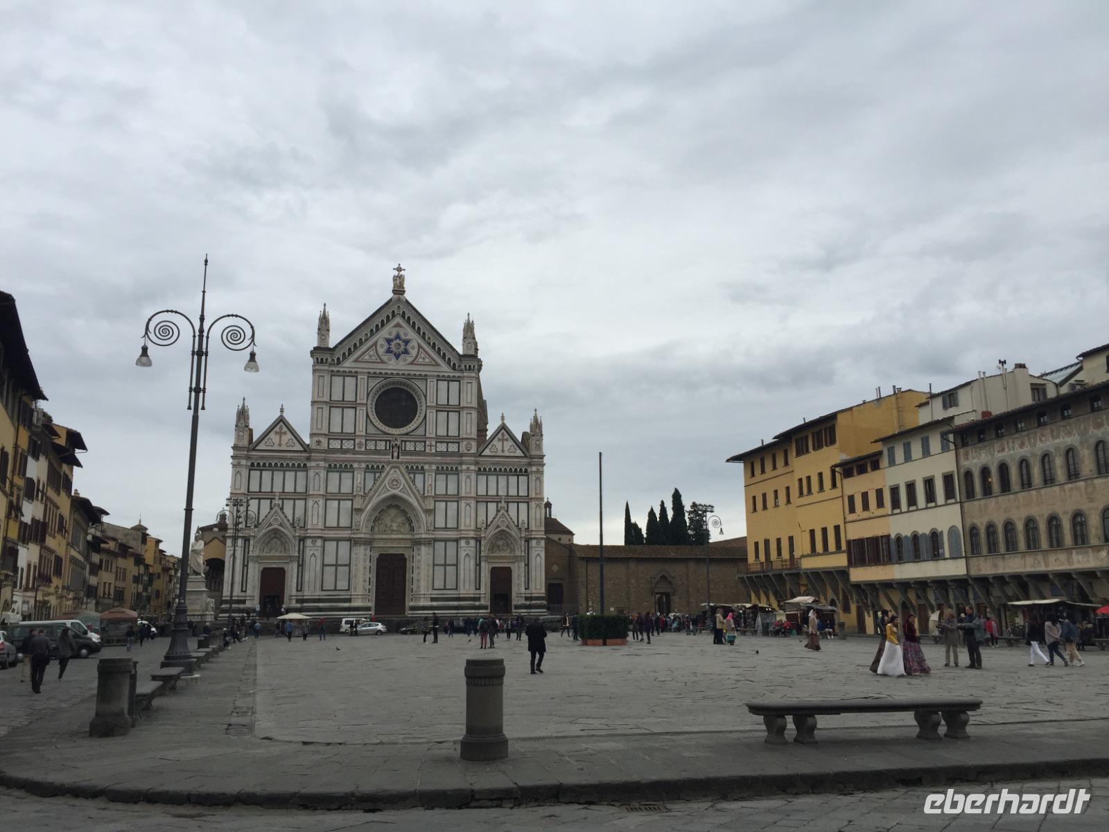 Gut gestärkt und mit unserem Knopf im Ohr starten wir heute zum Rundgang im religiösen Zentrum der Stadt Florenz. Unser Sonnenschein Angela schlängelt uns durch die Gassen und schon stehen wir auf der Piazza di Santa Croce und vor der gleichnamigen Basilika. Diese Franziskanerkirche steht nicht im regulären Programm, aber man sollte sie schon gesehen haben! Immerhin ist sie nach dem Dom die zweitwichtigste Kirche der Stadt und beherbergt die Gräber von Michelangelo, Galileo Galilei und Dante - äußerst wichtige Persönlichkeiten der Weltgeschichte. Nach der ausführlichen Innenbesichtigung schlendern wir noch durch den hübschen Kreuzgang und nun beginnt es wieder zu regnen. Gewappnet mit Schirmen spazieren wir nun zum Domplatz - in der Hoffnung, es stehen nicht so viele an der Taufkirche an. Fehlanzeige! Nun gut, wir suchen uns ein nettes Lokal für einen Mittagsimbiss und genießen Pasta, Salat und/oder eine leckere Bruschetta.