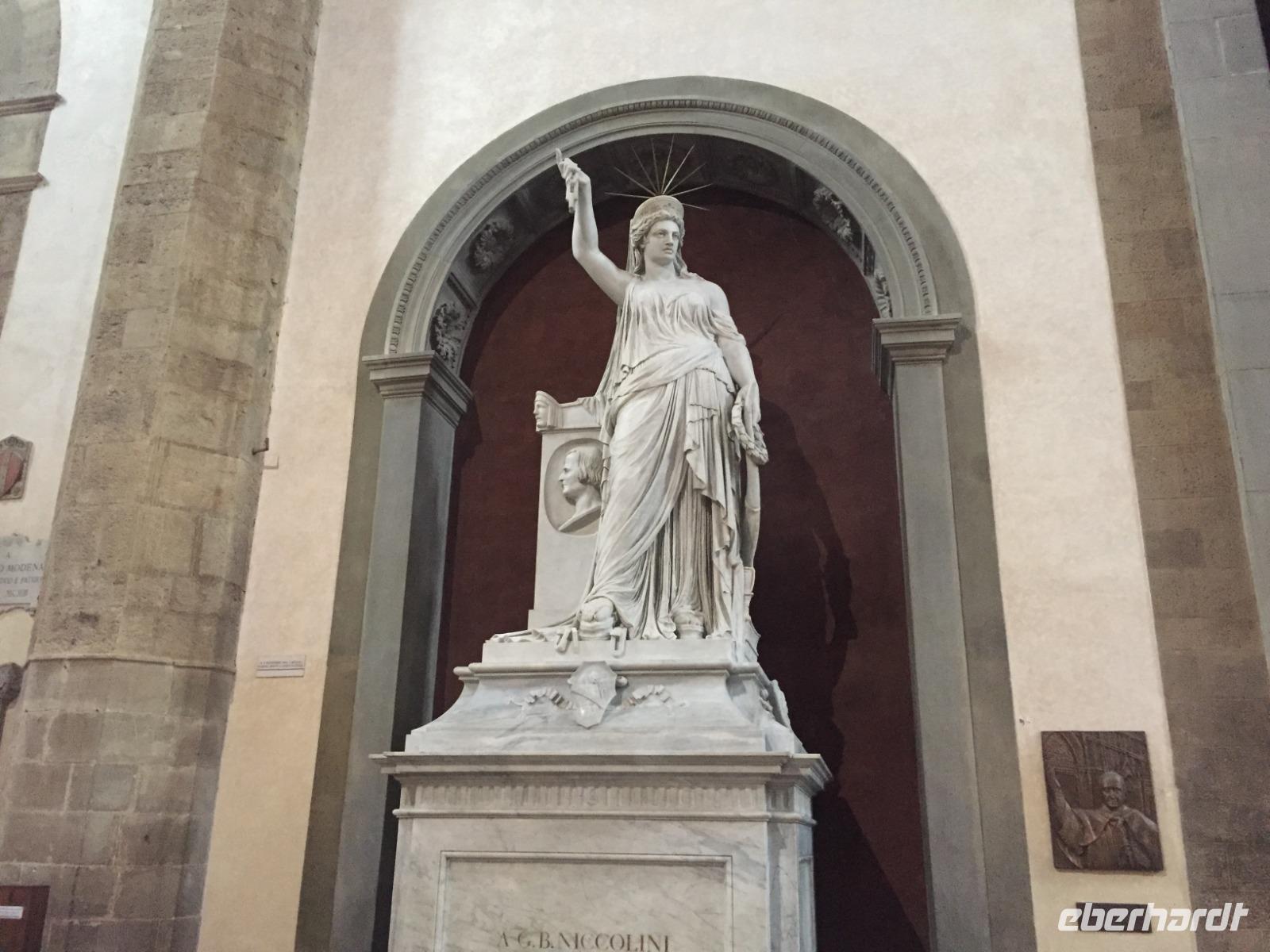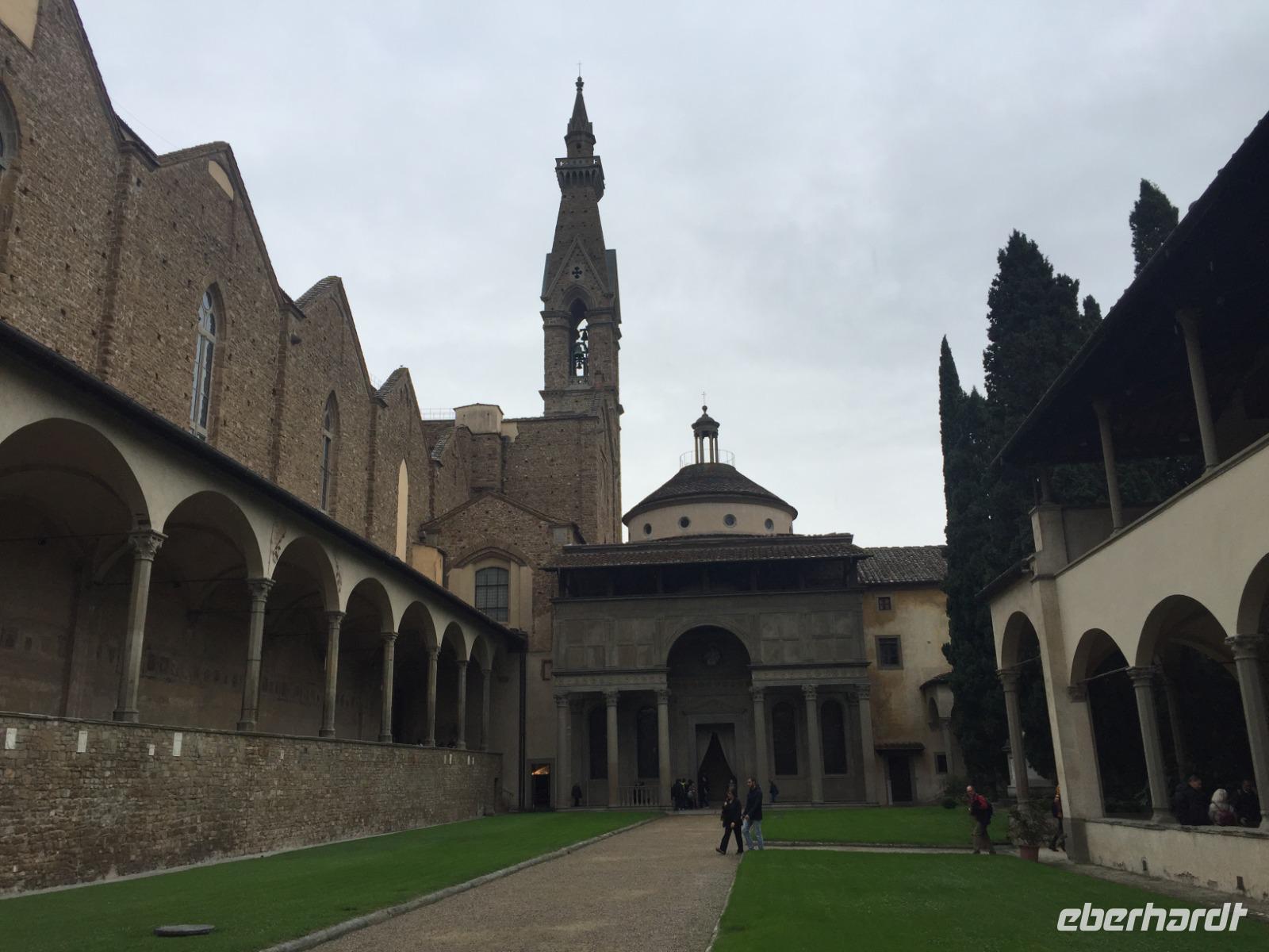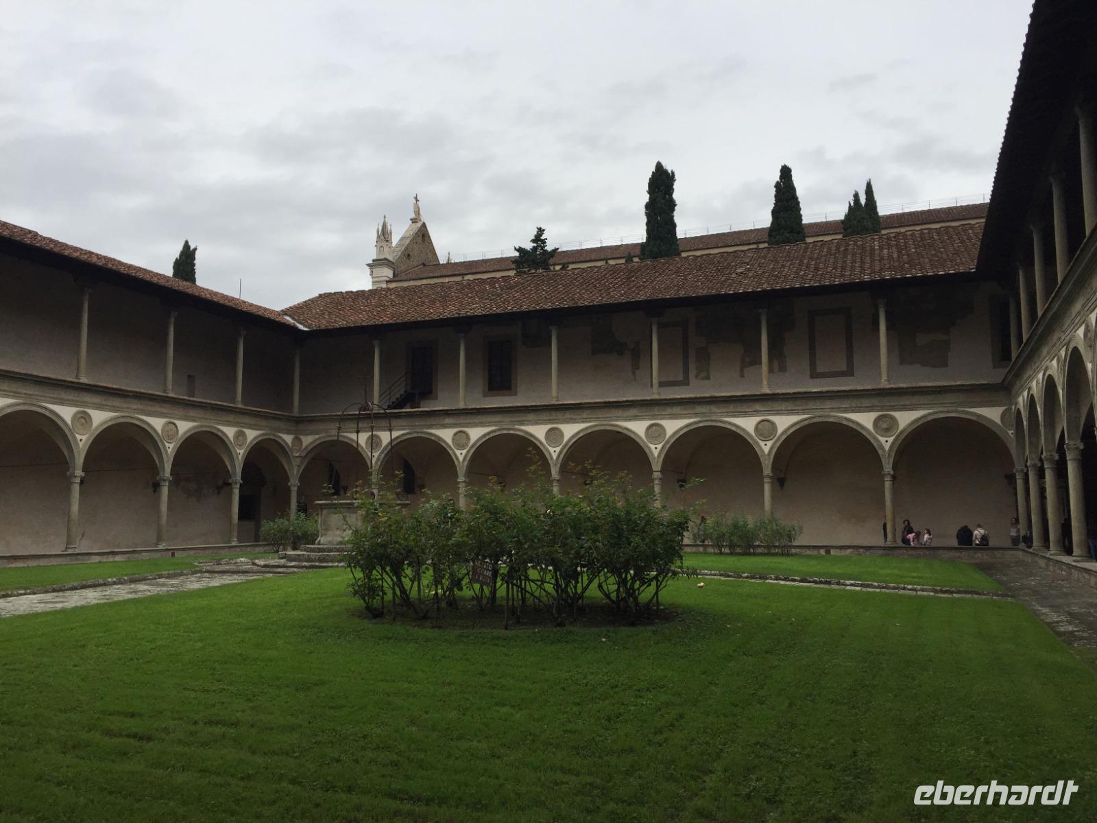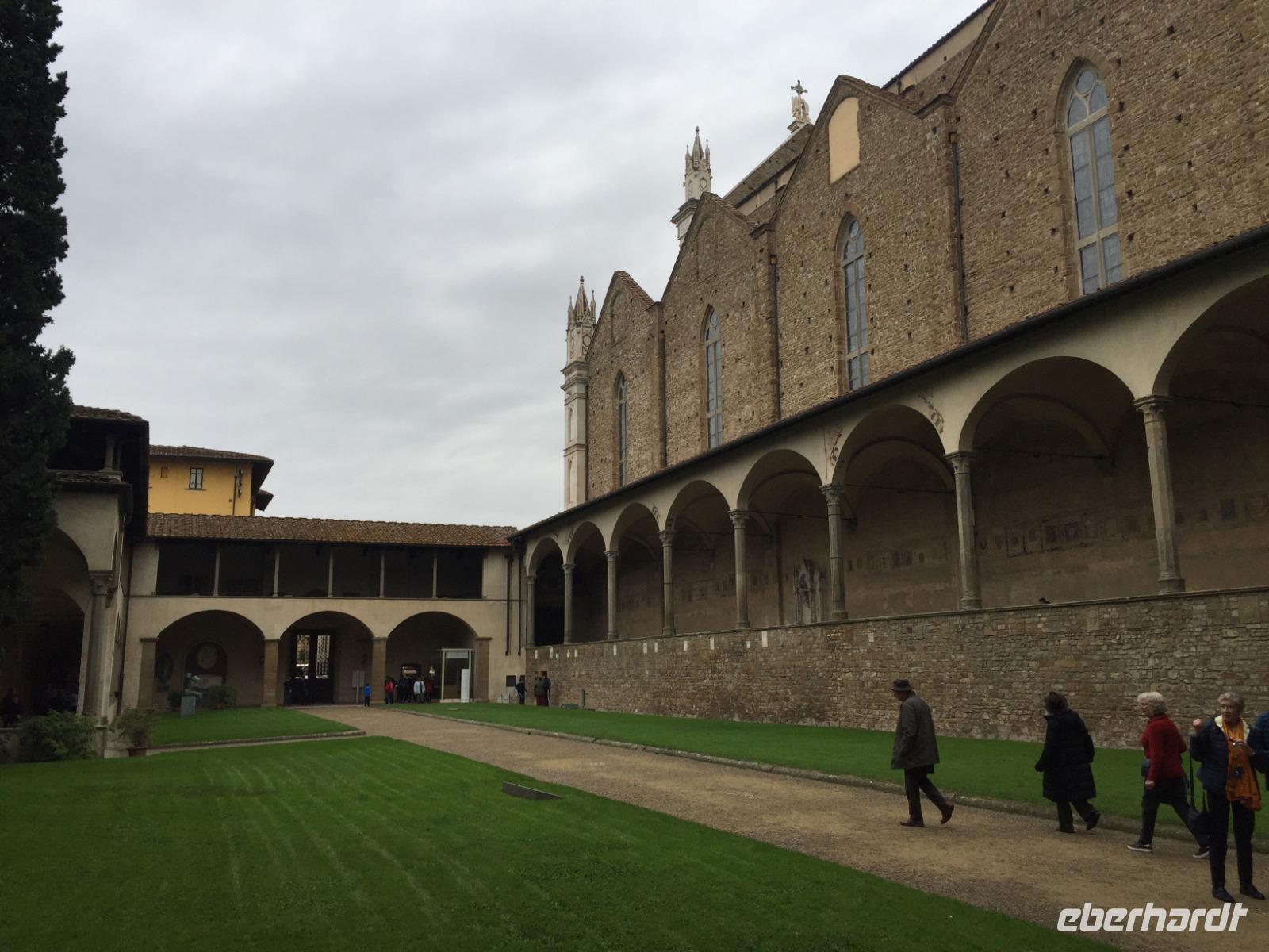 Gut gestärkt und mit unserem Knopf im Ohr starten wir heute zum Rundgang im religiösen Zentrum der Stadt Florenz. Unser Sonnenschein Angela schlängelt uns durch die Gassen und schon stehen wir auf der Piazza di Santa Croce und vor der gleichnamigen Basilika. Diese Franziskanerkirche steht nicht im regulären Programm, aber man sollte sie schon gesehen haben! Immerhin ist sie nach dem Dom die zweitwichtigste Kirche der Stadt und beherbergt die Gräber von Michelangelo, Galileo Galilei und Dante - äußerst wichtige Persönlichkeiten der Weltgeschichte. Nach der ausführlichen Innenbesichtigung schlendern wir noch durch den hübschen Kreuzgang und nun beginnt es wieder zu regnen. Gewappnet mit Schirmen spazieren wir nun zum Domplatz - in der Hoffnung, es stehen nicht so viele an der Taufkirche an. Fehlanzeige! Nun gut, wir suchen uns ein nettes Lokal für einen Mittagsimbiss und genießen Pasta, Salat und/oder eine leckere Bruschetta.