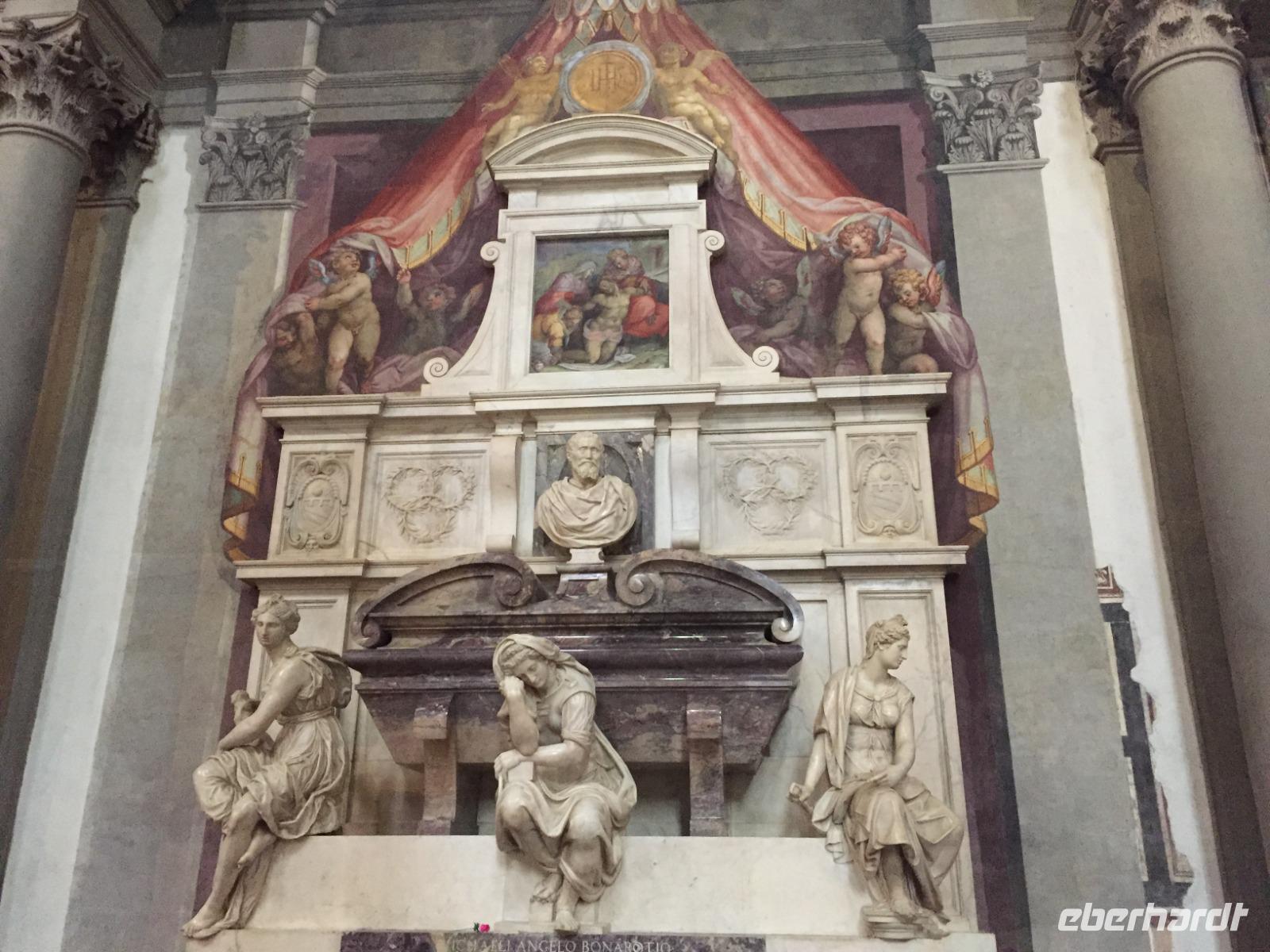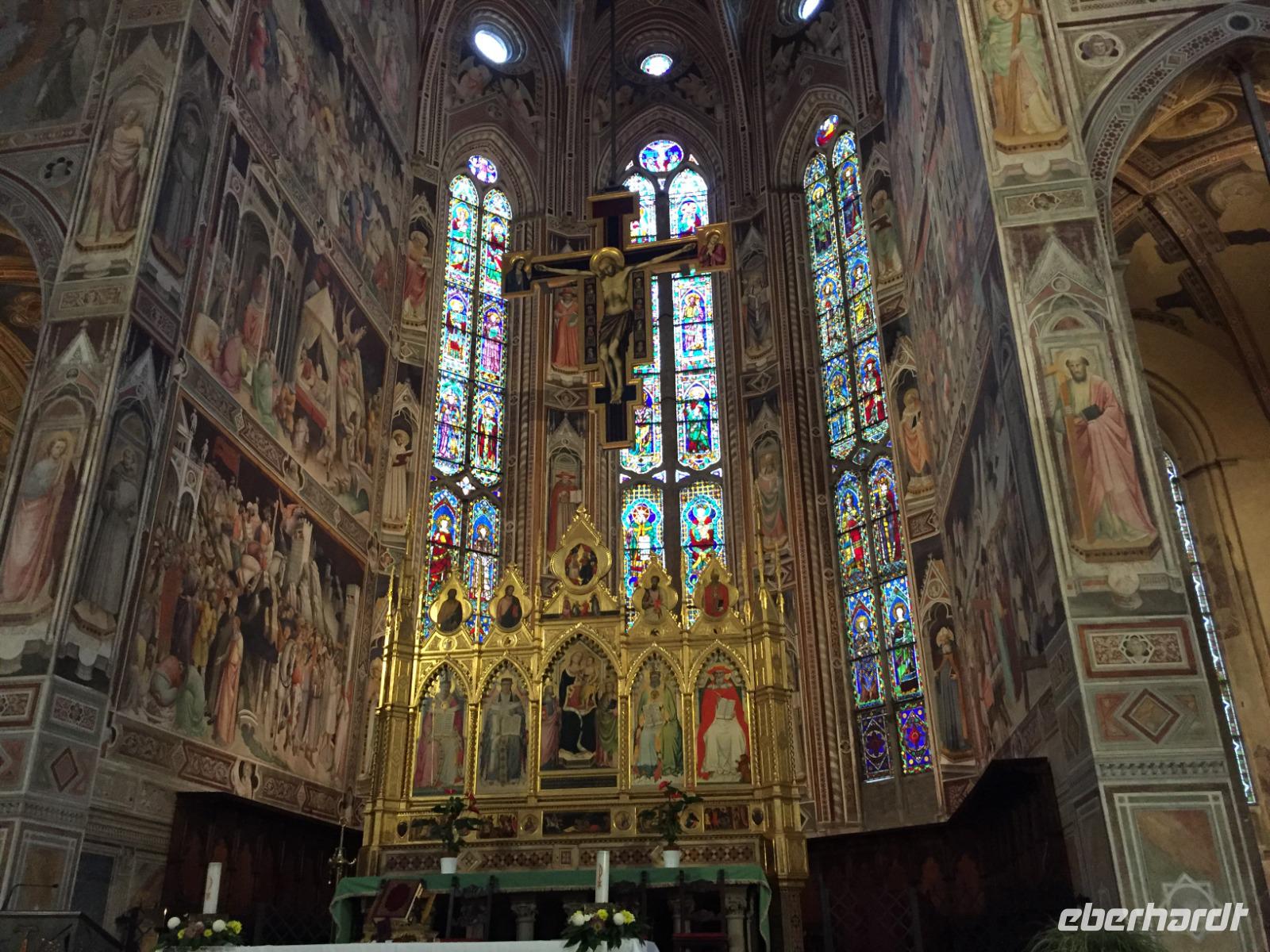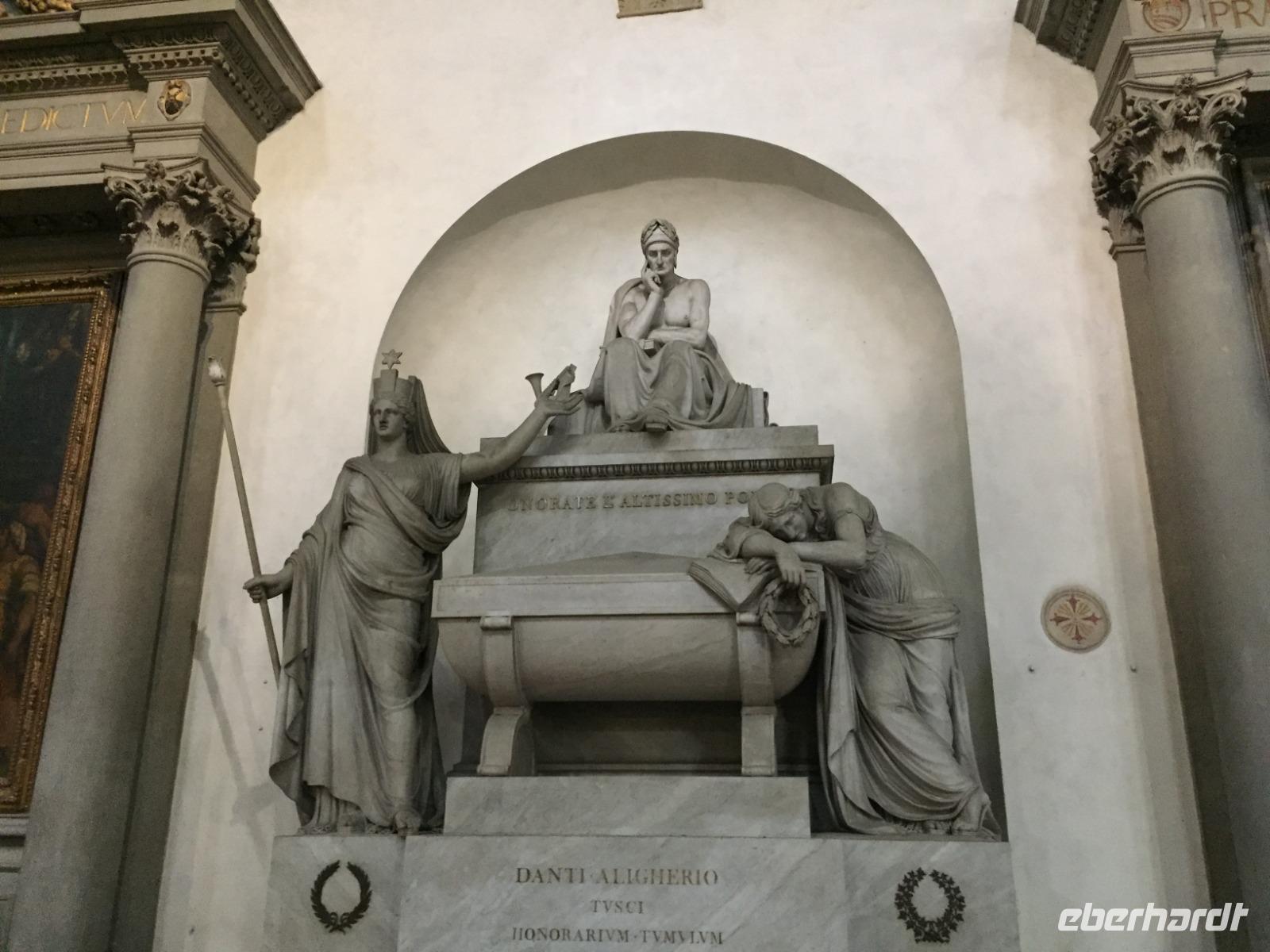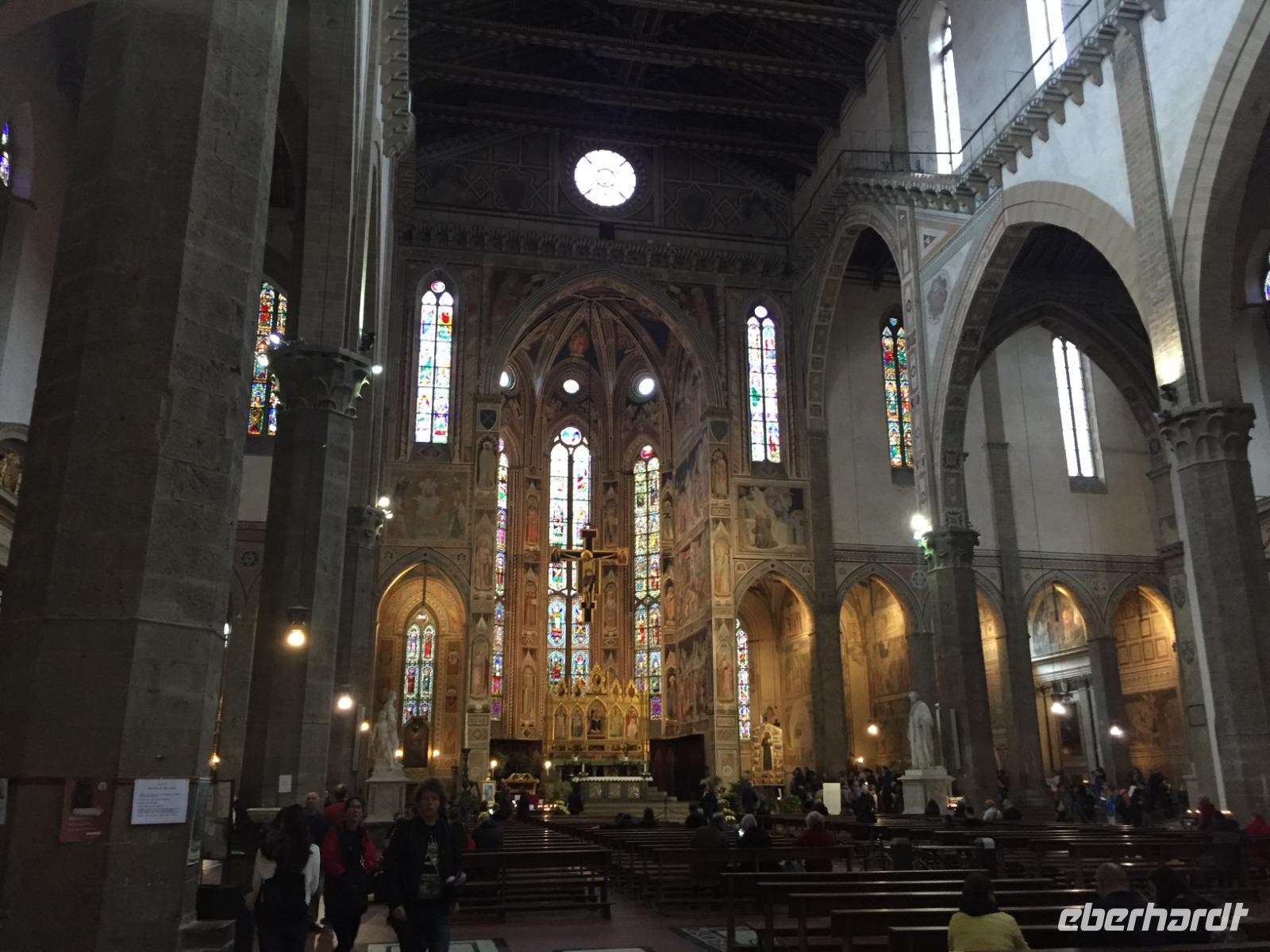 Gut gestärkt und mit unserem Knopf im Ohr starten wir heute zum Rundgang im religiösen Zentrum der Stadt Florenz. Unser Sonnenschein Angela schlängelt uns durch die Gassen und schon stehen wir auf der Piazza di Santa Croce und vor der gleichnamigen Basilika. Diese Franziskanerkirche steht nicht im regulären Programm, aber man sollte sie schon gesehen haben! Immerhin ist sie nach dem Dom die zweitwichtigste Kirche der Stadt und beherbergt die Gräber von Michelangelo, Galileo Galilei und Dante - äußerst wichtige Persönlichkeiten der Weltgeschichte. Nach der ausführlichen Innenbesichtigung schlendern wir noch durch den hübschen Kreuzgang und nun beginnt es wieder zu regnen. Gewappnet mit Schirmen spazieren wir nun zum Domplatz - in der Hoffnung, es stehen nicht so viele an der Taufkirche an. Fehlanzeige! Nun gut, wir suchen uns ein nettes Lokal für einen Mittagsimbiss und genießen Pasta, Salat und/oder eine leckere Bruschetta.