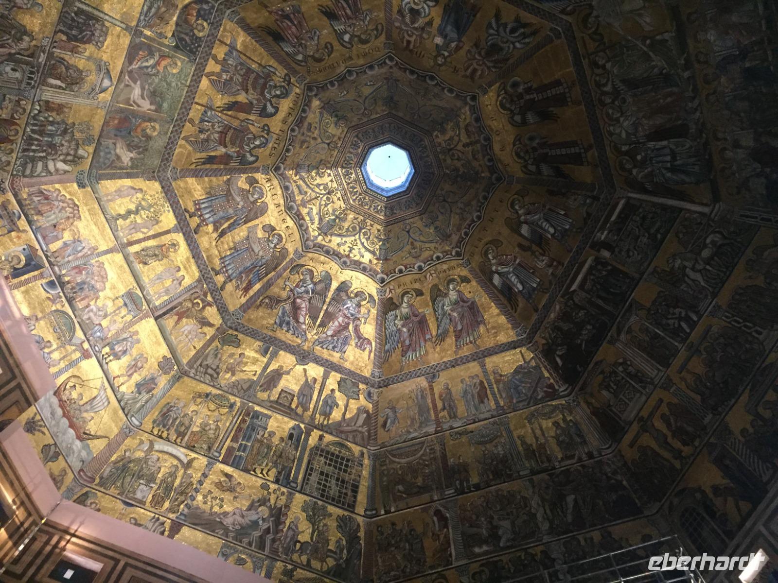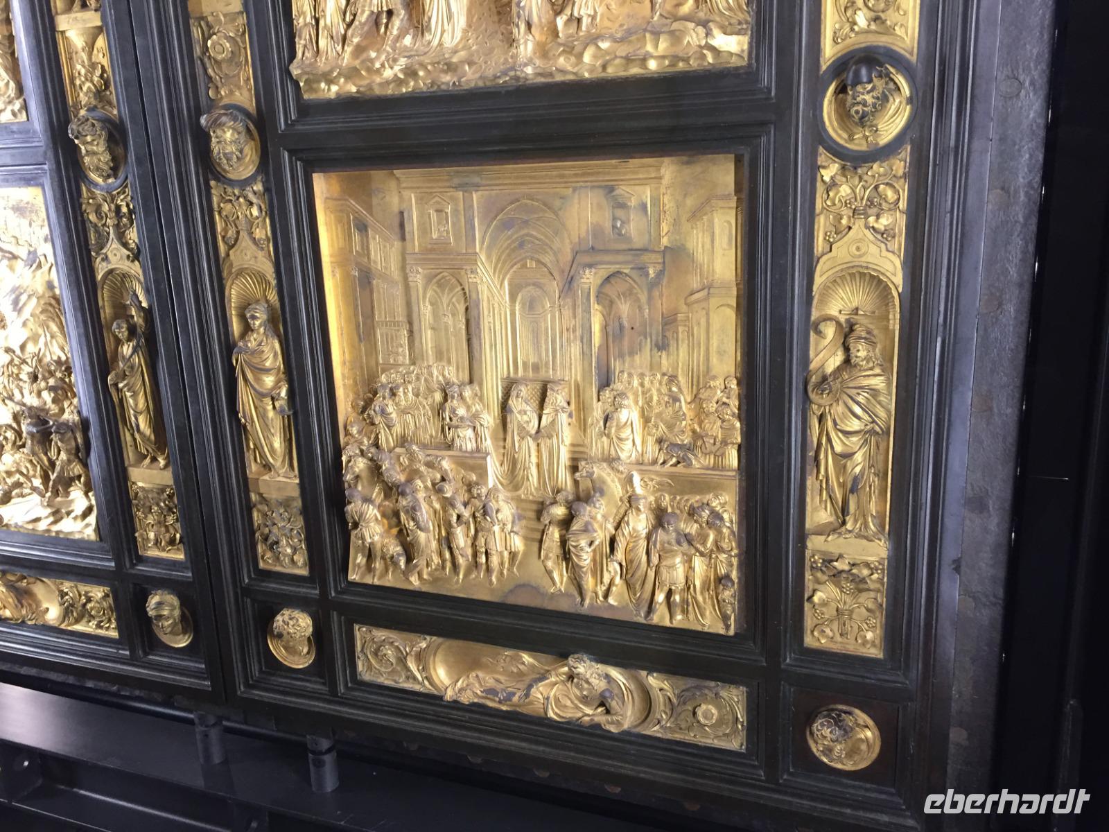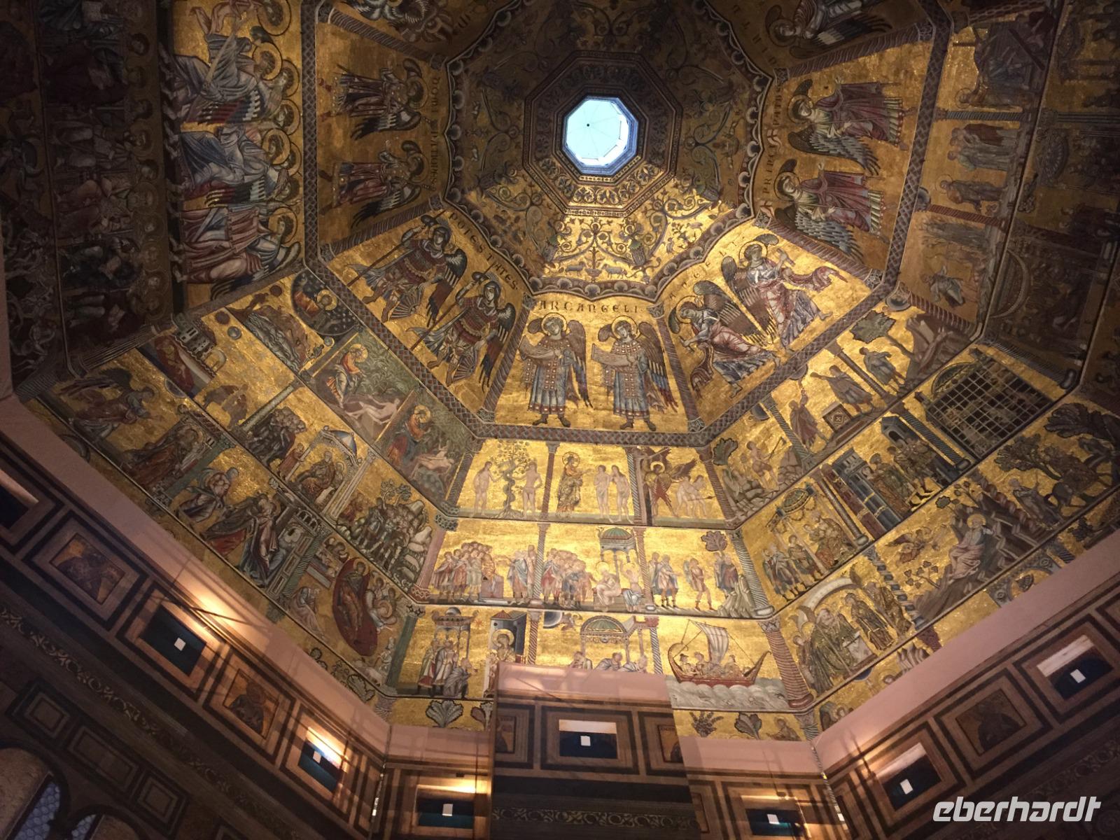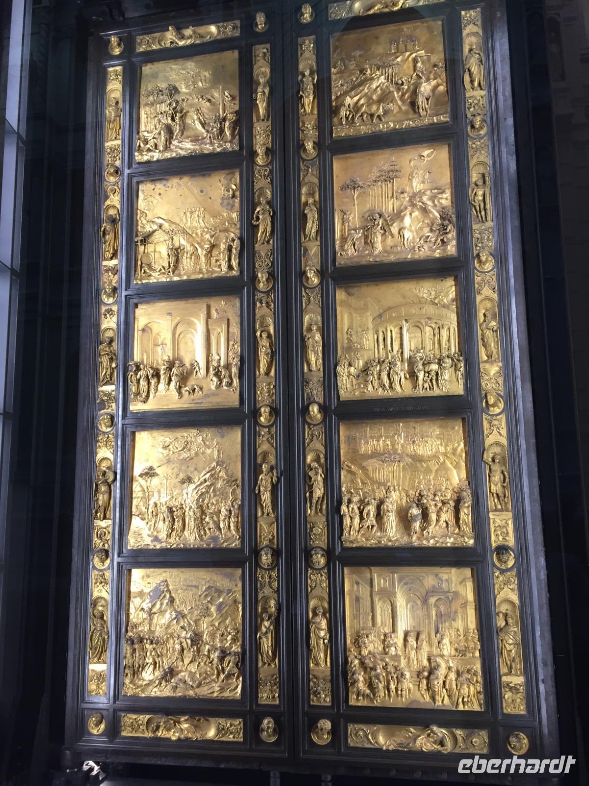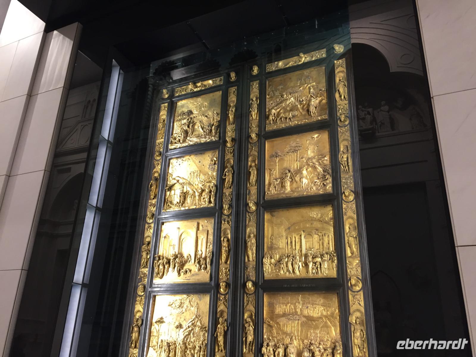 Die Schlange hat sich dann auch etwas gelichtet und wir besuchen das Battistero di San Giovanni (Taufkirche), die gemeinsam mit dem Campanile (Glockenturm) und dem Dom Santa Maria del Fiore das Zentrum von Florenz bildet und ein einmaliges Ensemble darstellt. Die achteckige Taufkirche ist wohl eines der ältesten Gebäude von Florenz und Johannes dem Täufer geweiht. Die typische Marmorverkleidung außen, die mächtigen Bronzeportale und die Mosaikkuppel faszinieren! Höhepunkt der Bildhauerkunst der Gotik und der Renaissance ist das Hauptwerk von Ghiberti: die Paradiespforte (Porta del Paradiso), die wir später im Dommuseum (Museo dell'Opera del Duomo) im Original bewundern können. Selbiges befindet sich in einem recht unscheinbaren Gebäude hinter dem Dom. Ursprünglich 1891 gegründet, wurde es nach umfänglichen Umbauarbeiten 2015 der Öffentlich wieder zugänglich gemacht und wir bestaunen eine umfangreiche Sammlung Florentiner Kunst (750 Exponate in 25 Sälen), darunter die original Paradiespforte der Taufkirche, eine Vielzahl an Statuen und Gemälden. Nachdem wir uns sattgesehen haben, blieb Zeit für eine kleine Cappuccino- und Gelato-Pause, denn die Reservierung für den Kuppelaufstieg haben wir erst für 16:30 Uhr.