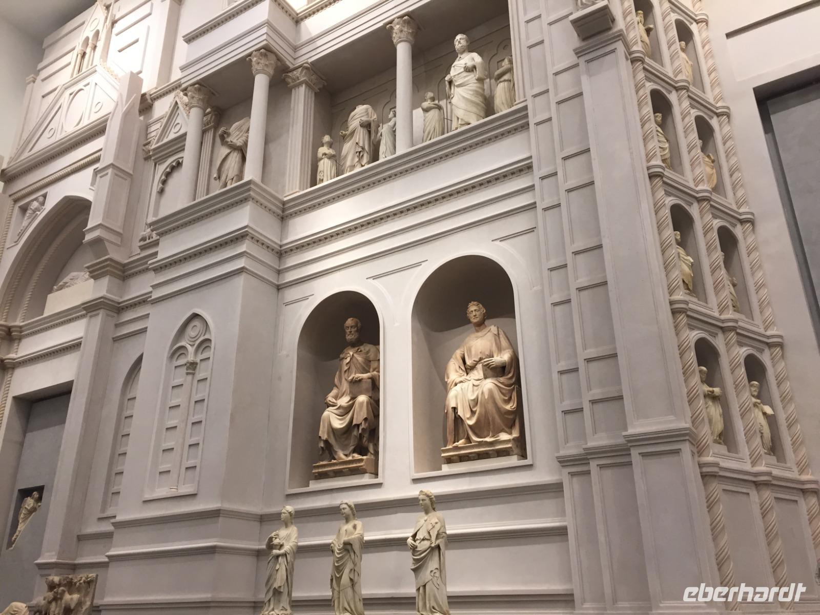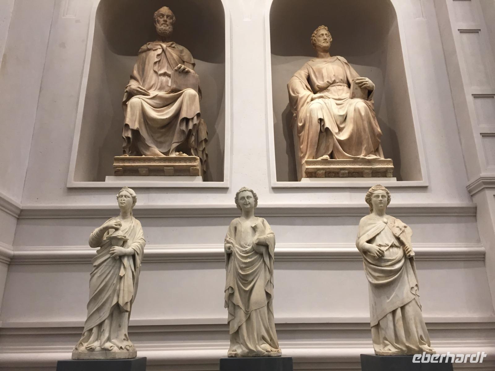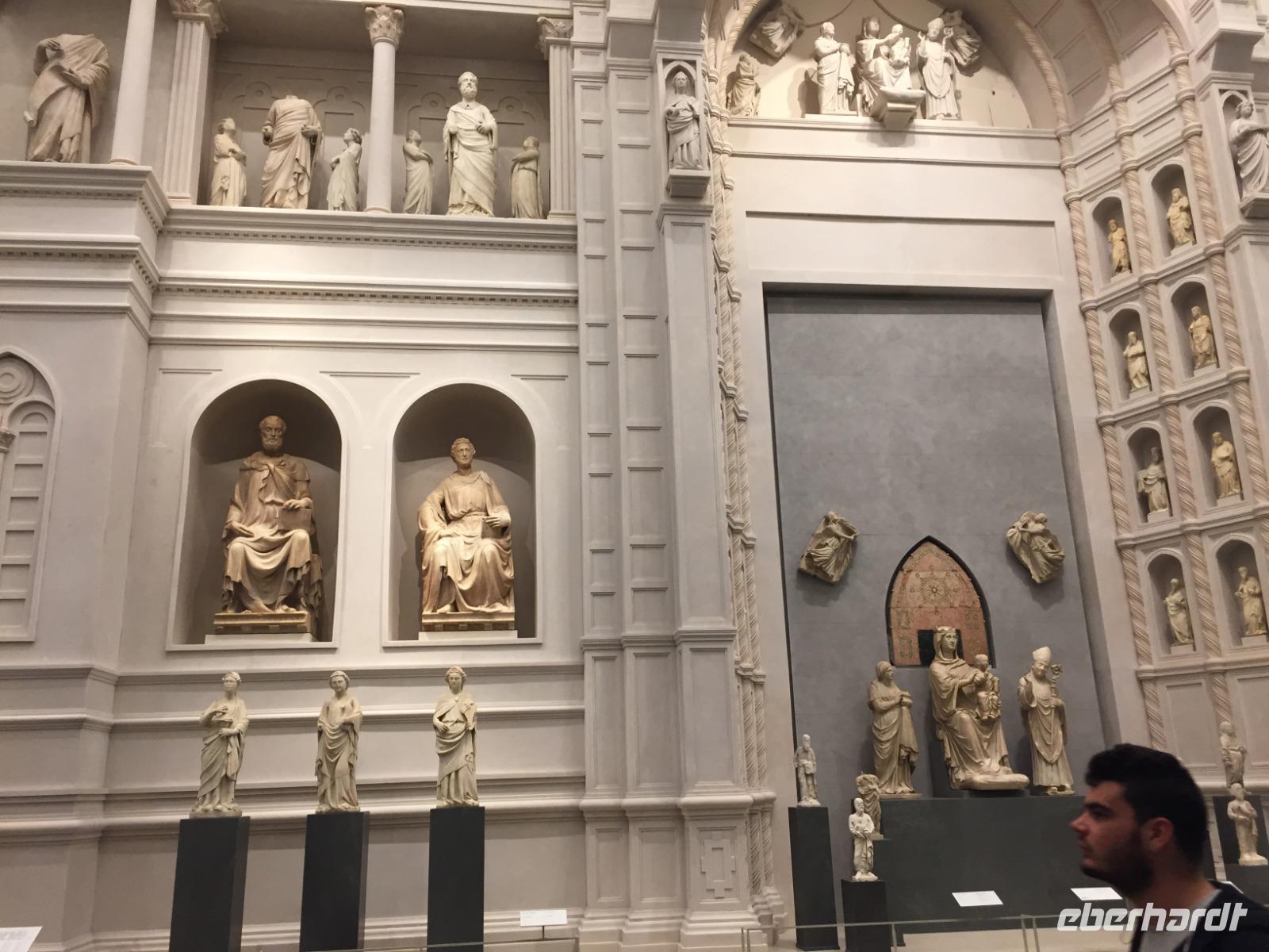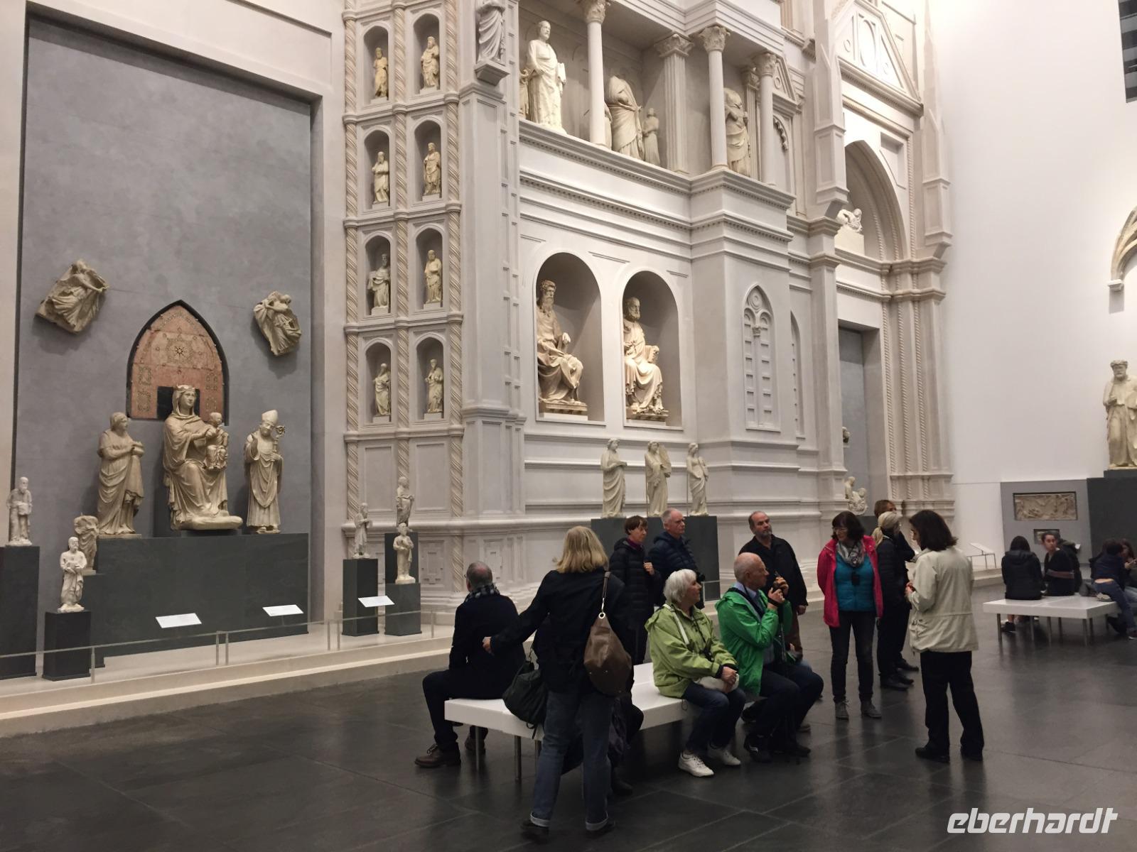 Die Schlange hat sich dann auch etwas gelichtet und wir besuchen das Battistero di San Giovanni (Taufkirche), die gemeinsam mit dem Campanile (Glockenturm) und dem Dom Santa Maria del Fiore das Zentrum von Florenz bildet und ein einmaliges Ensemble darstellt. Die achteckige Taufkirche ist wohl eines der ältesten Gebäude von Florenz und Johannes dem Täufer geweiht. Die typische Marmorverkleidung außen, die mächtigen Bronzeportale und die Mosaikkuppel faszinieren! Höhepunkt der Bildhauerkunst der Gotik und der Renaissance ist das Hauptwerk von Ghiberti: die Paradiespforte (Porta del Paradiso), die wir später im Dommuseum (Museo dell'Opera del Duomo) im Original bewundern können. Selbiges befindet sich in einem recht unscheinbaren Gebäude hinter dem Dom. Ursprünglich 1891 gegründet, wurde es nach umfänglichen Umbauarbeiten 2015 der Öffentlich wieder zugänglich gemacht und wir bestaunen eine umfangreiche Sammlung Florentiner Kunst (750 Exponate in 25 Sälen), darunter die original Paradiespforte der Taufkirche, eine Vielzahl an Statuen und Gemälden. Nachdem wir uns sattgesehen haben, blieb Zeit für eine kleine Cappuccino- und Gelato-Pause, denn die Reservierung für den Kuppelaufstieg haben wir erst für 16:30 Uhr.