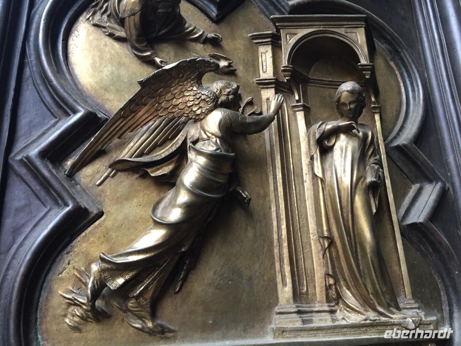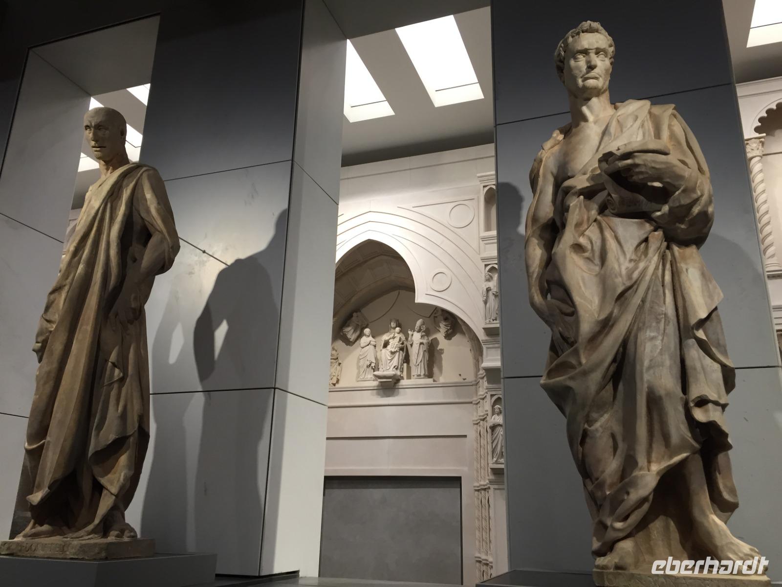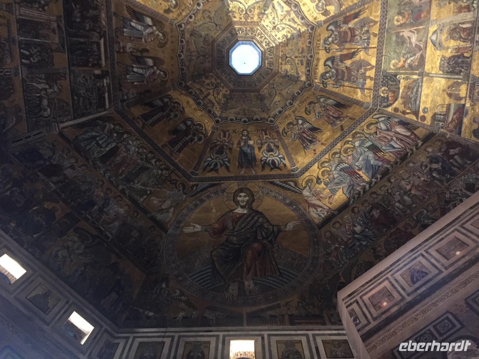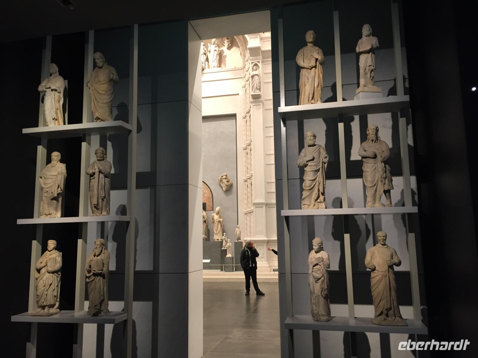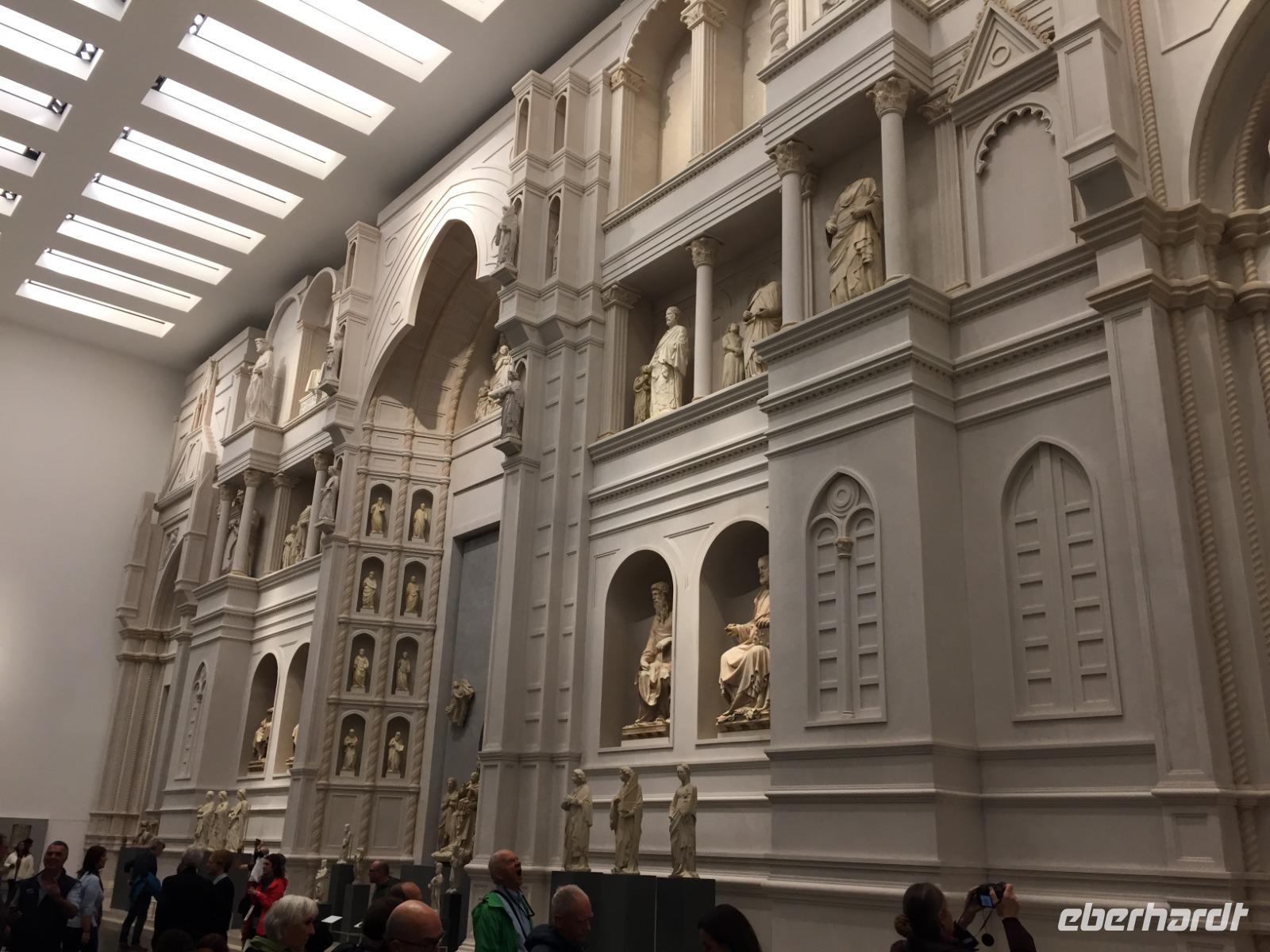 Die Schlange hat sich dann auch etwas gelichtet und wir besuchen das Battistero di San Giovanni (Taufkirche), die gemeinsam mit dem Campanile (Glockenturm) und dem Dom Santa Maria del Fiore das Zentrum von Florenz bildet und ein einmaliges Ensemble darstellt. Die achteckige Taufkirche ist wohl eines der ältesten Gebäude von Florenz und Johannes dem Täufer geweiht. Die typische Marmorverkleidung außen, die mächtigen Bronzeportale und die Mosaikkuppel faszinieren! Höhepunkt der Bildhauerkunst der Gotik und der Renaissance ist das Hauptwerk von Ghiberti: die Paradiespforte (Porta del Paradiso), die wir später im Dommuseum (Museo dell'Opera del Duomo) im Original bewundern können. Selbiges befindet sich in einem recht unscheinbaren Gebäude hinter dem Dom. Ursprünglich 1891 gegründet, wurde es nach umfänglichen Umbauarbeiten 2015 der Öffentlich wieder zugänglich gemacht und wir bestaunen eine umfangreiche Sammlung Florentiner Kunst (750 Exponate in 25 Sälen), darunter die original Paradiespforte der Taufkirche, eine Vielzahl an Statuen und Gemälden. Nachdem wir uns sattgesehen haben, blieb Zeit für eine kleine Cappuccino- und Gelato-Pause, denn die Reservierung für den Kuppelaufstieg haben wir erst für 16:30 Uhr.
