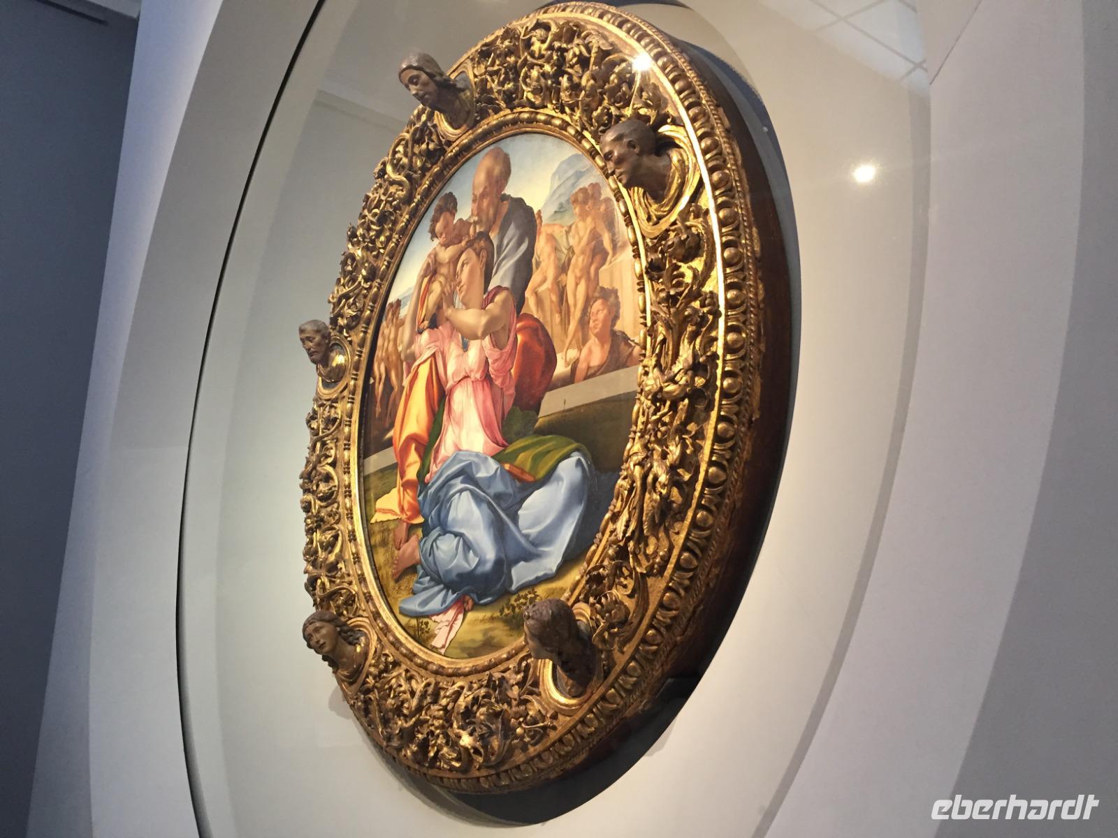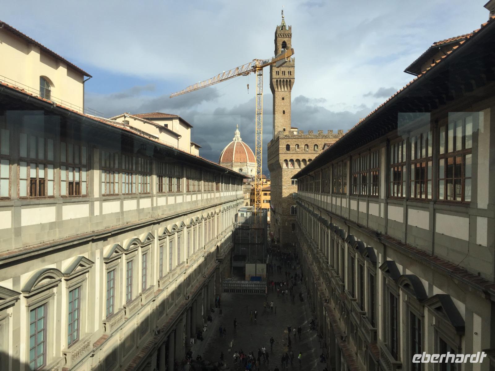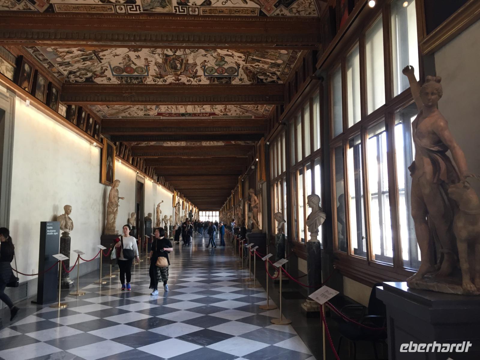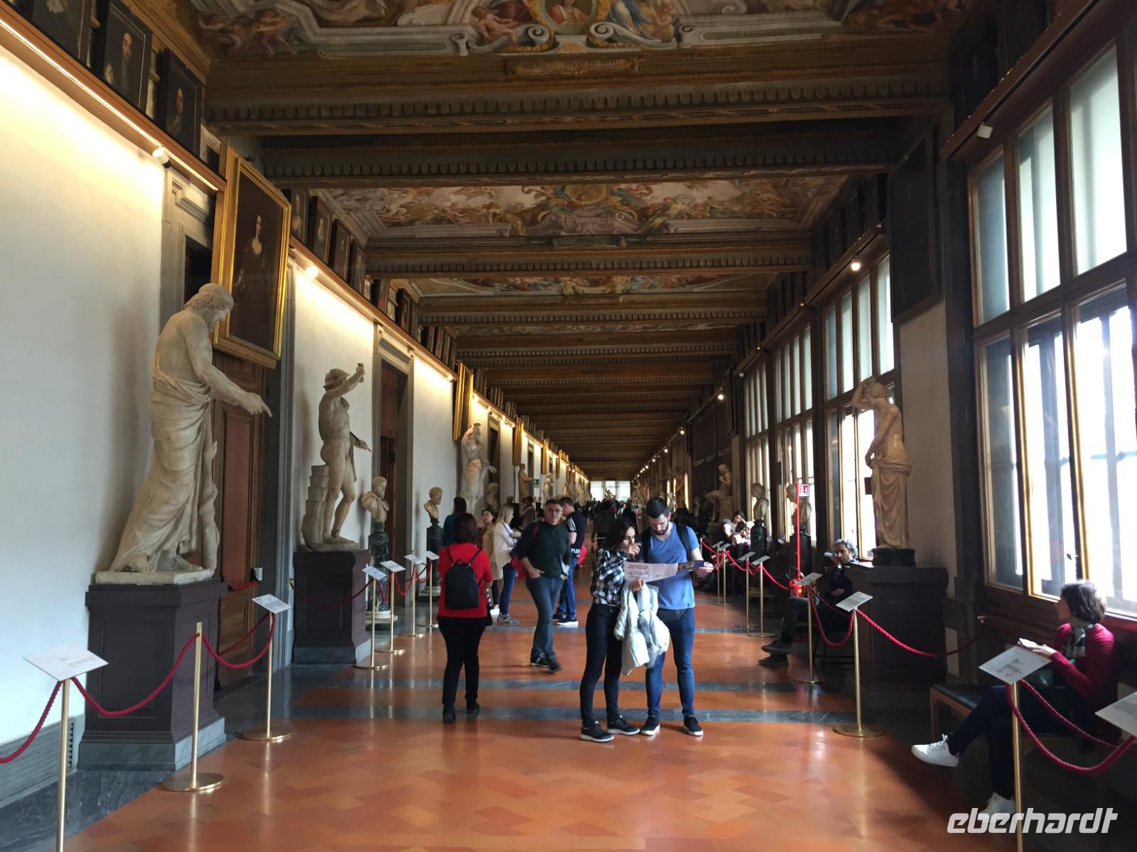 Wie schon die Tage zuvor, haben wir uns am super Frühstücksbuffet im Hotelrestaurant gestärkt. Leider müssen wir heute schon auschecken, doch wir haben noch viel vor, bevor es zum Flughafen geht. Die Koffer stellen wir wohl behütet beim Concierge ab und warten sehnsüchtig auf unsere Angela. Sie hat sich in unserem Sinne („weil sie einfach sooo gut ist") schon zeitig in die lange Schlange der Uffizien gestellt, um die Tickets zu holen. Denn heute ist der erste Sonntag im Monat und dadurch sind alle staatlichen Museen frei und eine vorherige Reservierung ist auch gegen Bezahlung nicht möglich. Wir bekommen unsere Wunsch-Einlasszeit und spazieren die wenigen Meter zum Eingang der Uffizien. Relativ zügig kommen wir durch die Kontrollen, geben die größeren Rucksäcke ab und rattern mit dem alten Fahrstuhl hinauf ins Obergeschoss der einst als Büros für Ministerien und Ämter (ital. uffici) gebauten Räumlichkeiten. Der Komplex wurde unter anderem vom Architekten Giorgio Vasari gebaut. Seit 1580 befindet sich hier die Kunstsammlung Galleria degli Uffizi und ist mit Werken der Malerei und Bildhauerei eines der bekanntesten Museen der Welt mit ca. 2 Millionen jährlich. Aktuell wird die Galleria von einem deutschen Kunsthistoriker geleitet. Wir können diese heute, auch wenn der Eintritt frei ist, wirklich in Ruhe und ohne großes Gedränge besuchen. Angela ist in ihrem Element und reist mit uns durch die Kunstgeschichte von der Antike bis zum Spätbarock. Natürlich müssen wir selektieren und uns auf das Wesentliche beschränken - die Zeit reicht einfach nicht.