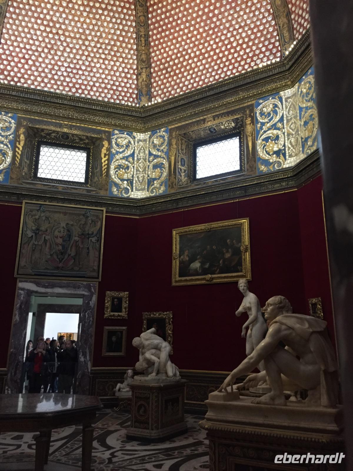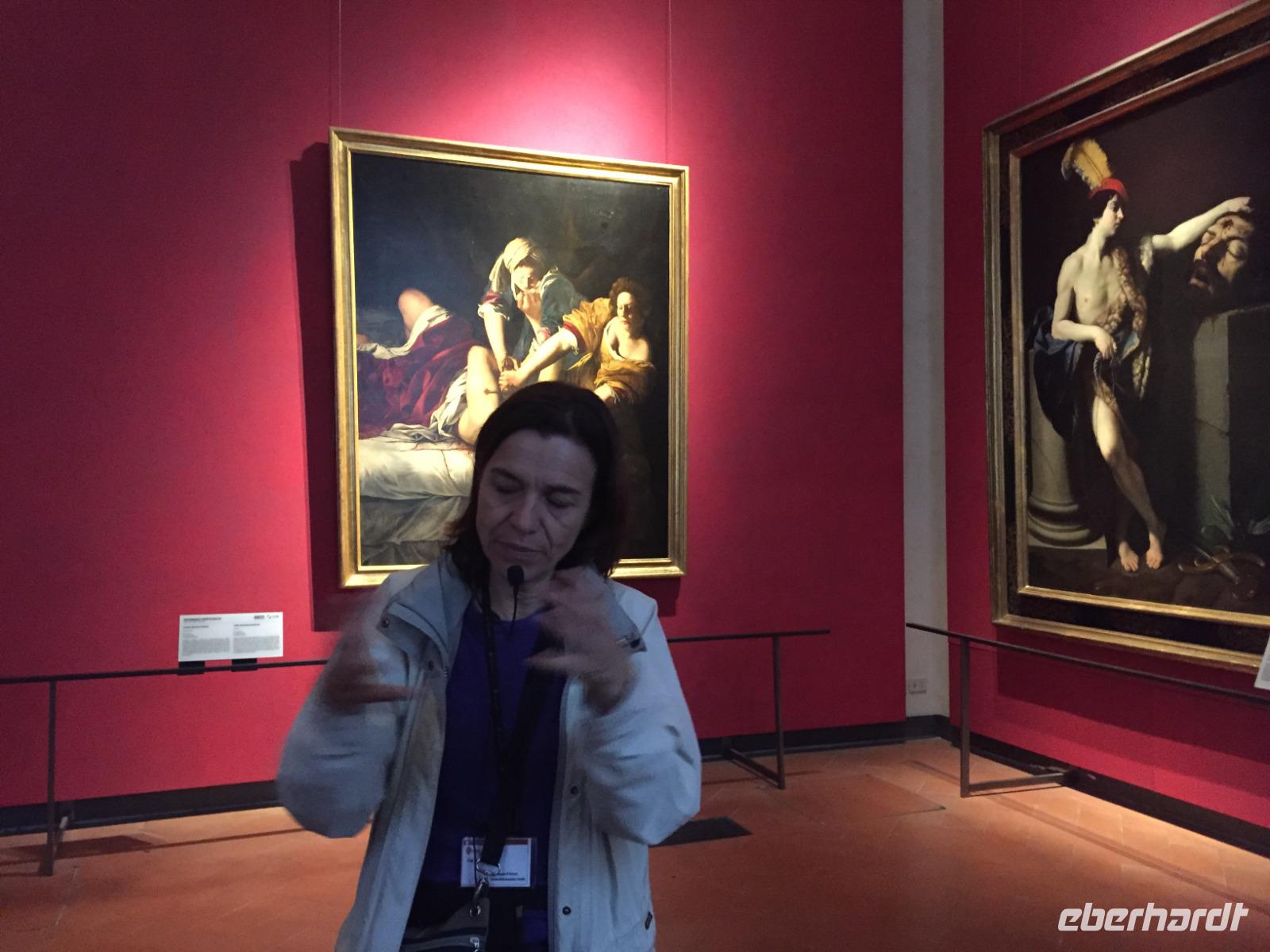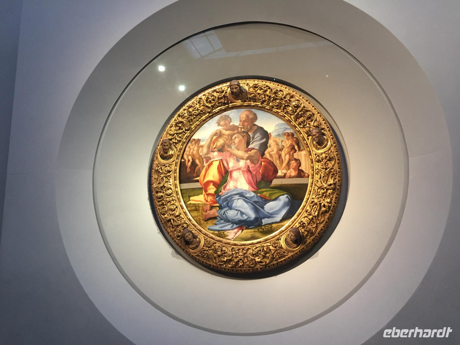 Wie schon die Tage zuvor, haben wir uns am super Frühstücksbuffet im Hotelrestaurant gestärkt. Leider müssen wir heute schon auschecken, doch wir haben noch viel vor, bevor es zum Flughafen geht. Die Koffer stellen wir wohl behütet beim Concierge ab und warten sehnsüchtig auf unsere Angela. Sie hat sich in unserem Sinne („weil sie einfach sooo gut ist") schon zeitig in die lange Schlange der Uffizien gestellt, um die Tickets zu holen. Denn heute ist der erste Sonntag im Monat und dadurch sind alle staatlichen Museen frei und eine vorherige Reservierung ist auch gegen Bezahlung nicht möglich. Wir bekommen unsere Wunsch-Einlasszeit und spazieren die wenigen Meter zum Eingang der Uffizien. Relativ zügig kommen wir durch die Kontrollen, geben die größeren Rucksäcke ab und rattern mit dem alten Fahrstuhl hinauf ins Obergeschoss der einst als Büros für Ministerien und Ämter (ital. uffici) gebauten Räumlichkeiten. Der Komplex wurde unter anderem vom Architekten Giorgio Vasari gebaut. Seit 1580 befindet sich hier die Kunstsammlung Galleria degli Uffizi und ist mit Werken der Malerei und Bildhauerei eines der bekanntesten Museen der Welt mit ca. 2 Millionen jährlich. Aktuell wird die Galleria von einem deutschen Kunsthistoriker geleitet. Wir können diese heute, auch wenn der Eintritt frei ist, wirklich in Ruhe und ohne großes Gedränge besuchen. Angela ist in ihrem Element und reist mit uns durch die Kunstgeschichte von der Antike bis zum Spätbarock. Natürlich müssen wir selektieren und uns auf das Wesentliche beschränken - die Zeit reicht einfach nicht.