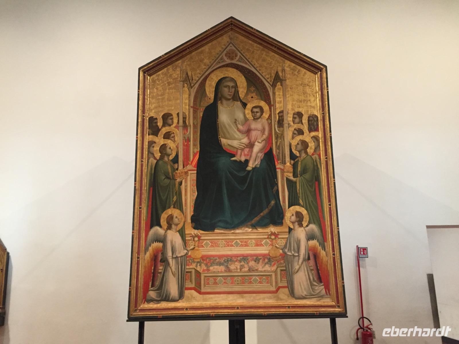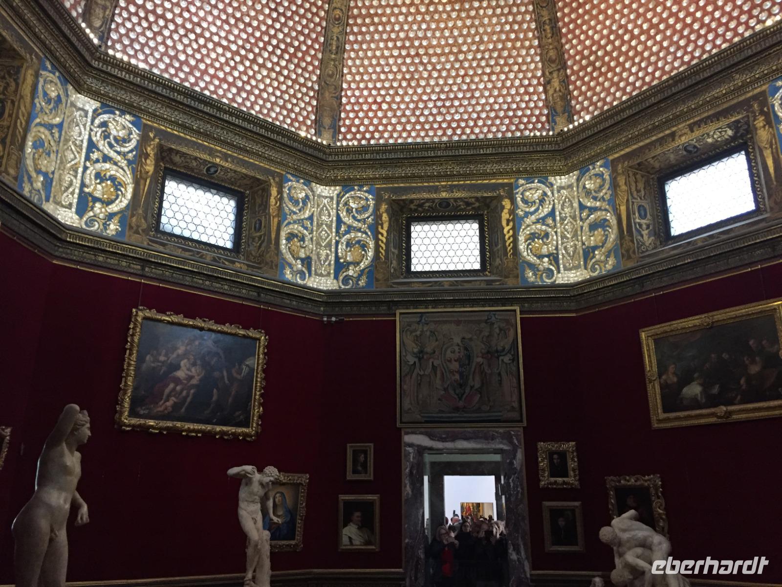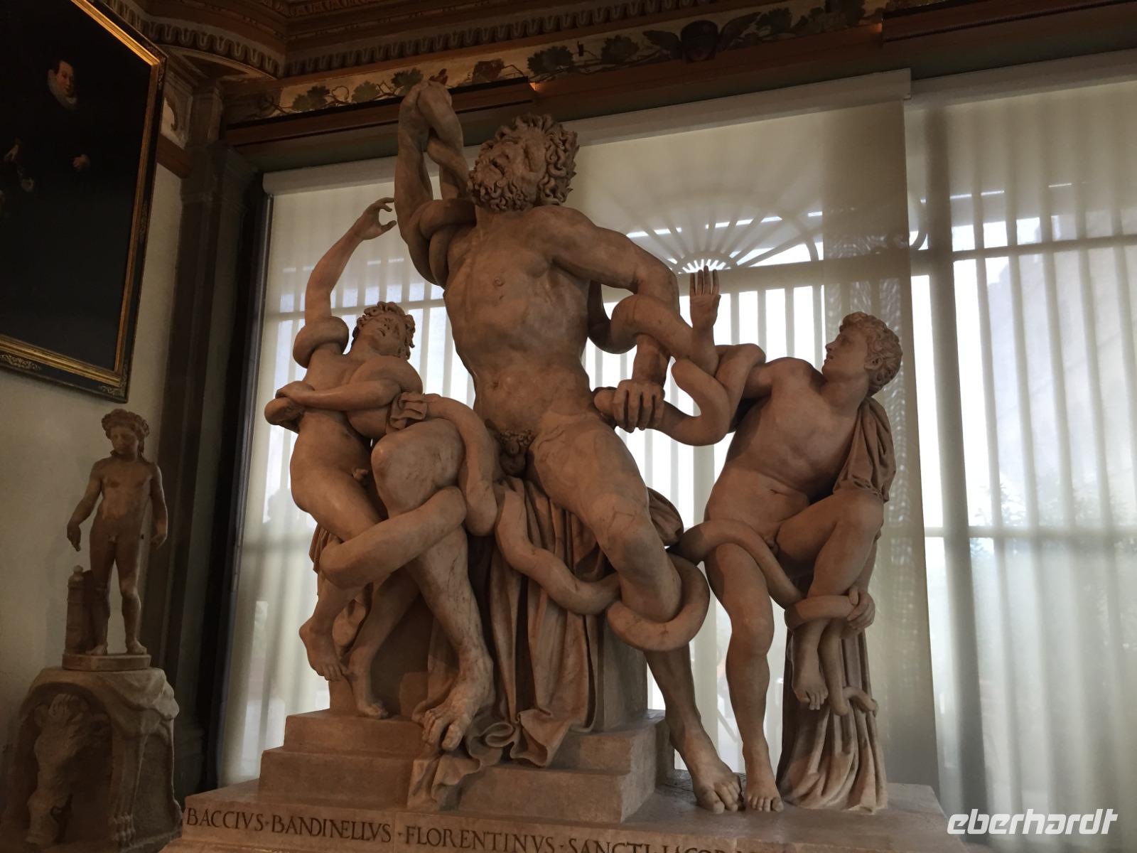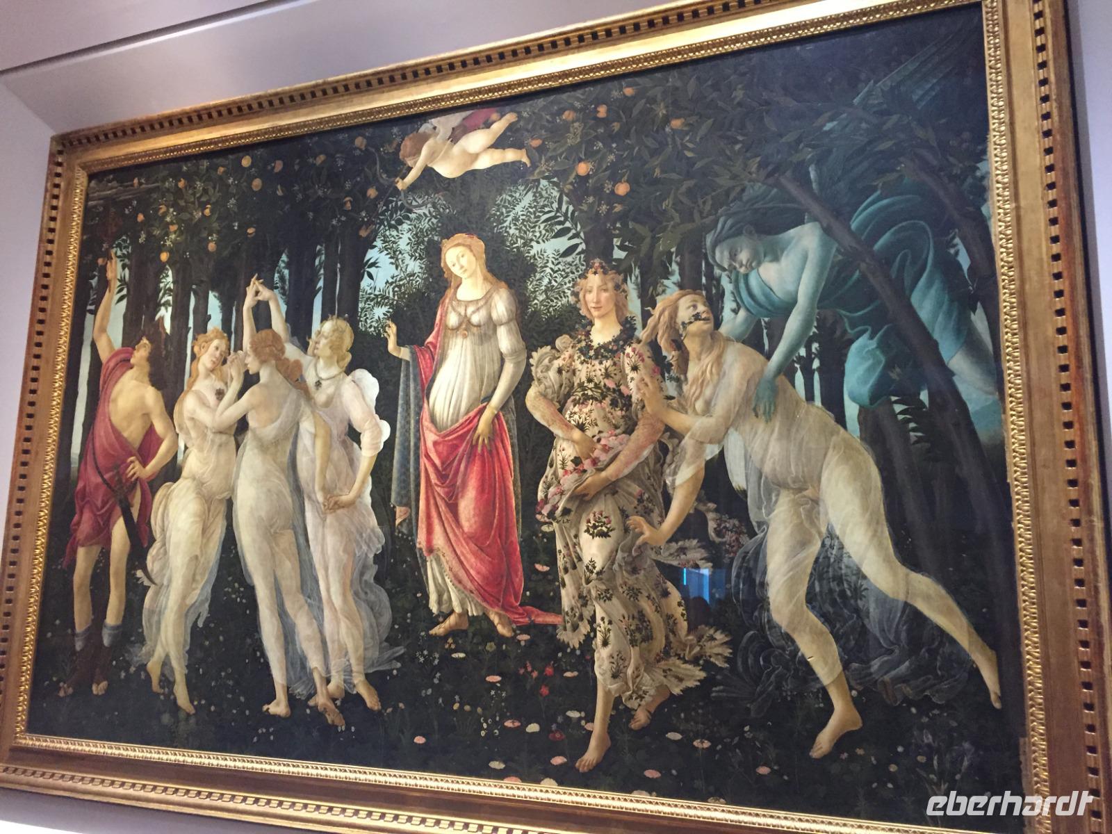 Wie schon die Tage zuvor, haben wir uns am super Frühstücksbuffet im Hotelrestaurant gestärkt. Leider müssen wir heute schon auschecken, doch wir haben noch viel vor, bevor es zum Flughafen geht. Die Koffer stellen wir wohl behütet beim Concierge ab und warten sehnsüchtig auf unsere Angela. Sie hat sich in unserem Sinne („weil sie einfach sooo gut ist") schon zeitig in die lange Schlange der Uffizien gestellt, um die Tickets zu holen. Denn heute ist der erste Sonntag im Monat und dadurch sind alle staatlichen Museen frei und eine vorherige Reservierung ist auch gegen Bezahlung nicht möglich. Wir bekommen unsere Wunsch-Einlasszeit und spazieren die wenigen Meter zum Eingang der Uffizien. Relativ zügig kommen wir durch die Kontrollen, geben die größeren Rucksäcke ab und rattern mit dem alten Fahrstuhl hinauf ins Obergeschoss der einst als Büros für Ministerien und Ämter (ital. uffici) gebauten Räumlichkeiten. Der Komplex wurde unter anderem vom Architekten Giorgio Vasari gebaut. Seit 1580 befindet sich hier die Kunstsammlung Galleria degli Uffizi und ist mit Werken der Malerei und Bildhauerei eines der bekanntesten Museen der Welt mit ca. 2 Millionen jährlich. Aktuell wird die Galleria von einem deutschen Kunsthistoriker geleitet. Wir können diese heute, auch wenn der Eintritt frei ist, wirklich in Ruhe und ohne großes Gedränge besuchen. Angela ist in ihrem Element und reist mit uns durch die Kunstgeschichte von der Antike bis zum Spätbarock. Natürlich müssen wir selektieren und uns auf das Wesentliche beschränken - die Zeit reicht einfach nicht.