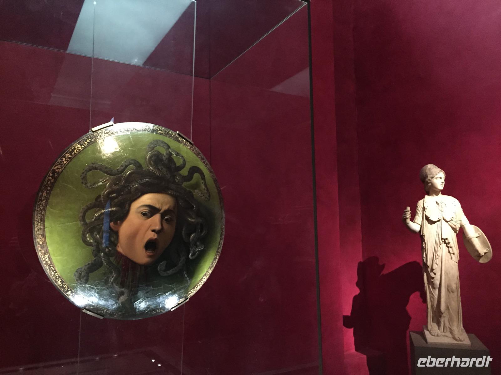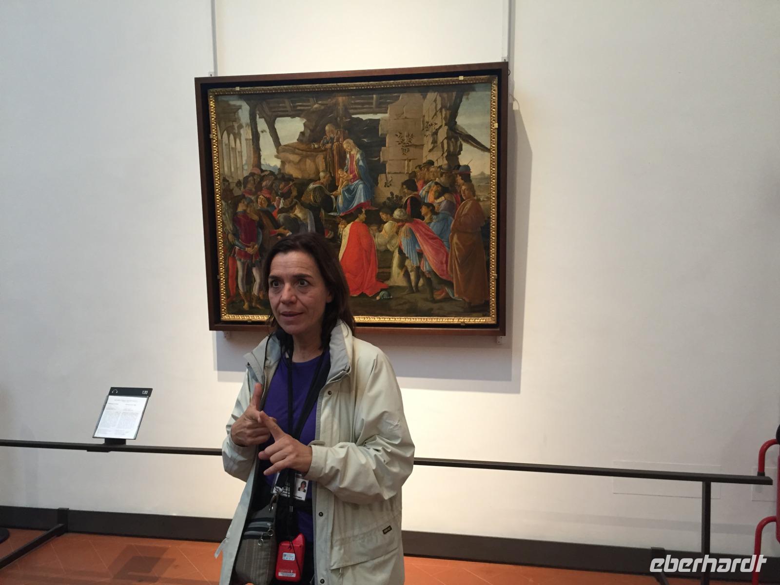 Unsere Reise durch die Kunstgeschichte beginnen wir nach den griechischen und römischen Skulpturen bei der Kunst für religiöse Zwecke, gehen weiter zur Malerei der Renaissance (Befreiung von den Vorgaben der Kirche) und enden mit Werken der Neuzeit. Die wichtigsten Werke, die wir besichtigt haben: „Frühling", „die Geburt der Venus" sowie „die Anbetung der drei Heiligen Könige" von Botticelli, die achteckige Tribuna, „die Verkündigung an Maria" und „Tondo Doni" von Leonardo da Vinci, „die Madonna" von Raffaello und die Medusa von Carravaggio.