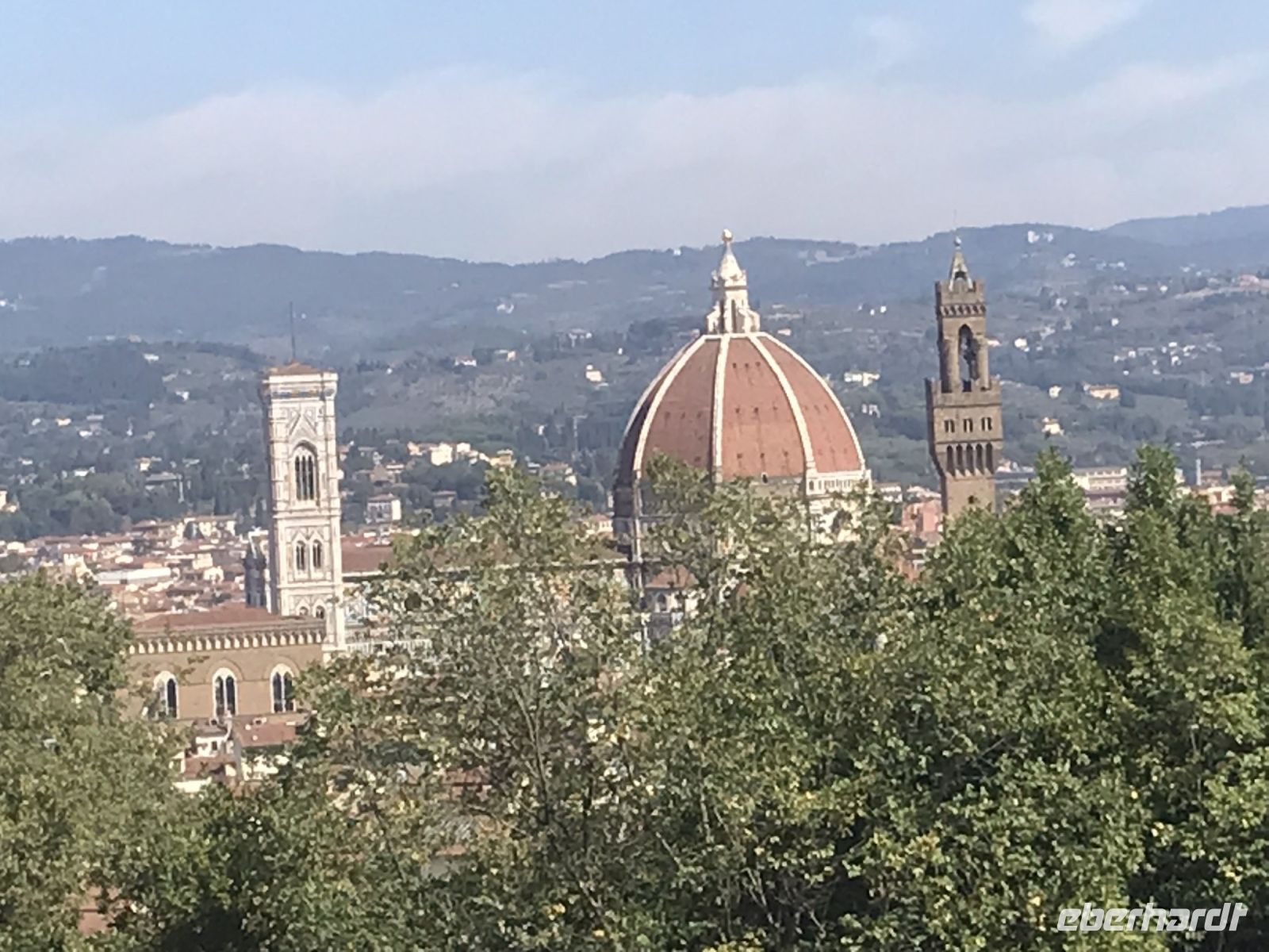 Nach dem letzten Treppenanstieg kommt man an auf der Piazzale Michelangelo, auch sie zu der Zeit von Florenz als Italiens Hauptstadt entstanden. Eine Bronzekopie des Davids steht in der Mitte und er schaut wie wir von oben über die Stadt. Der Arno leuchtet im Licht, Kuppeln und Türme ragen aus dem rötlichen Ganz der Ziegeldächer hervor und auf dem gegenüberliegenden Hügel erkennt man Fiesole.