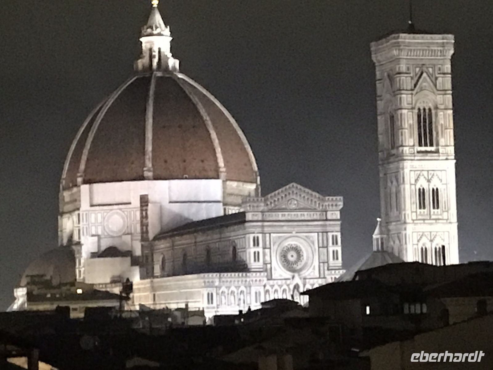 Jetzt rast die Zeit, nur noch wenige Stunden bis zum Beginn eines neuen Jahres. Um 20 Uhr treffen wir uns am festlich gedeckten Tisch im 5. Stock des Hotels. Alle haben sich fein gemacht, freudige Erwartung liegt in der Luft. Draußen hört man schon die Silvesterknaller, die in Florenz genau genommen verboten sind. Es gibt ein offfizielles Feuerwerk der Stadt.