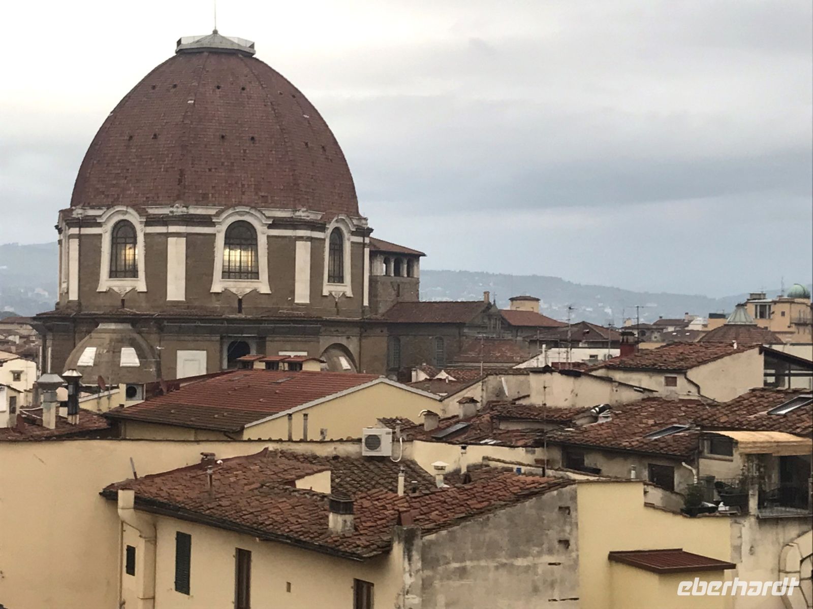 Unser Neujahrsspaziergang führt uns vor die Tor der Stadt, durch den Rosengarten hinauf zur Piazzale Michelangelo. Hier liegt einem Florenz wie bei der perfekten Postkartenansicht zu Füßen, es ist alles da, der Arno im Licht, die Brücken, die Kirchtürme und die große Kuppel. Nch ein Stück höher leuchtet die Fassade von San Miniato del Monte im Licht. Die Kirche ist eine der ältesten der Stadt, mit wunderbarem Kosmatenboden, einem Mosaik mit dem Weltenherrscher in der Apsis und einer Krypta. Zwischen den Besuchern der Messe können wir einen Blick ins Innere riskieren, dann geht es zurück zum Hotel und pünktlich um 15.00 Uhr zum Flughafen. Na