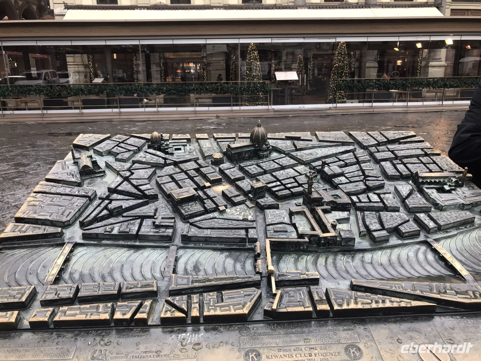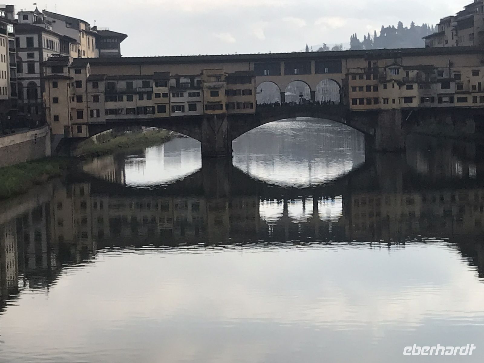 An Silvester keine Besichtigung von Kirchen, hatte unsere Stadtführerin Angela als Parole ausgegeben und daran haben wir uns gehalten Zu sehen gab es gleichwohl mehr als genug. Den mächtigen Palazzo Strozzi, die vornehmen Geschäfte in den Via Tournabuoni, die römische Stadtstruktur von Florenz mit Blick auf den Stadtplan an der Piazza Repubblica und dann natürlich die Brücken über den Arno. Von Ponte Santa Trinita bietet die Ponte Vecchio ein gutes Fotomotiv und auf der alten Brücke erkennt man ganz deutlich den berühmten Korridor, der von den Uffizien bis zum Palazzo Pitti führt. Gebaut wurde er von Giorgio Vasari, als Fluchtweg hat er den Medici nicht dienen müssen, doch demnächst wird er wohl als neue Attraktion das ohnehin reiche Museumsangebot erweitern.