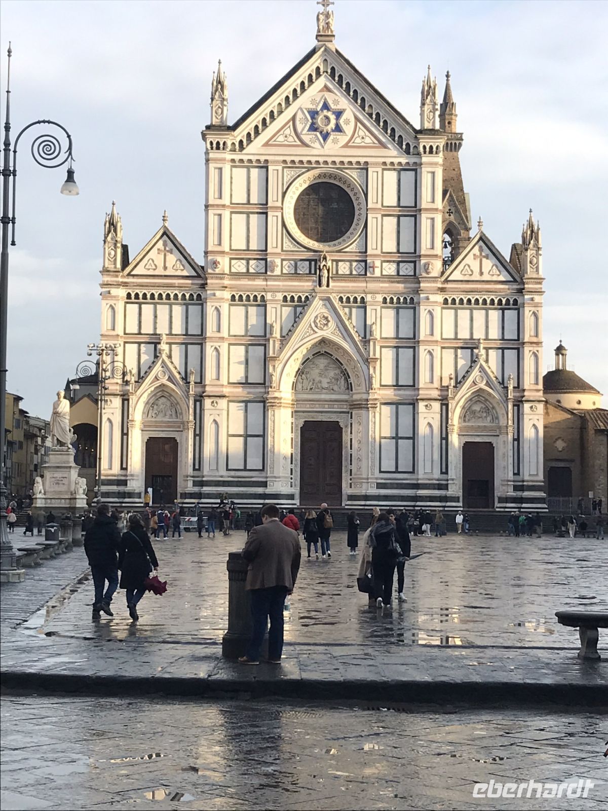 Nach der Mittagspause geht es zur Kirche Santa Croce, die sicherlich das wichtigste Gotteshaus in der Stadt ist. Diese Kirche wurde vom Bettelorden der Franziskaner erbaut, die sich dafür die finanzielen Zuwendungen von reichen florentiner Familien sicherten. Diese erwarben sich mit der Spende das Recht, hier auch ihre Grabstätten zu haben und heute ist Santa Croce eine Art Pantheon für die großen Persönlichkeiten der Stadt. Dante Alighieri ist in Ravenna gestorben und begrbane, doch die Florentiner haben ihm ein Grabmal errichtet, auch an Michelangelo Buoanarotti und Galileio Galilei wird hier mit prächtigen Grabmälern erinnert. In der Sakristei und im Museum sind noch die Spuren der verheerenden Überschwemmung des Arno im Jahr 966 zu erkennen.