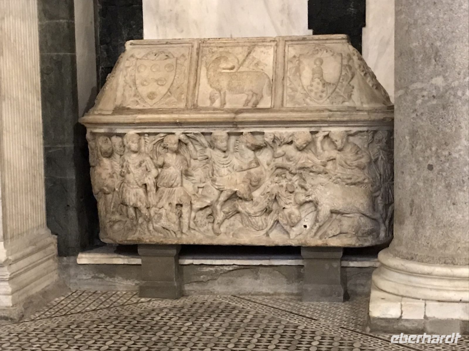 DIe Sonne macht sich rar, als wir zu unserer Erkundungstour im religiösen Zentrum von Florenz aufbrechen. Unsere erste Station ist allerdings keine der vielen Kirchen, sondern die Markthalle mit ihrem üppigen Angebt an Fisch, Obst, Fleisch und Gemüse. Die Stände mit dem florrentiner Leib- und Magengericht Trippa (Kutteln) und Lamperedotto gehören zur traditionsreichen Geschichte in Florenz. An den langen marmortischen herrscht schon am Morgen dichtes Gedränge und es duftet durchaus vielversprechend. Wir bestaunen das Gemüse, aus dem die Puntarelle gemacht werden, doch wir lassen Cantuccini und Nudeln zunächst links liegen. Die erste Besichtigung wartet und das ist die Taufkapelle gegenüber der Kathedrale. Überall stehen die Touristen in langen Schlangen, um auf Einlass zu warten. Auch wir müssen uns gedulden, ehe wir in die Taufkapelle mit ihren wunderbaren Mosaiken und dem herrlichen Marmorfußboden eintreten dürfen. Ein Gerüst verhindert den ungestörten Blick, doch Angela erklärt uns anhand einer großen Fotografie die Ikongrafie der Kuppel und wir bekommen einen guten Eindruck von der Schönheit und Pracht, die man hier einst geschaffen hat.