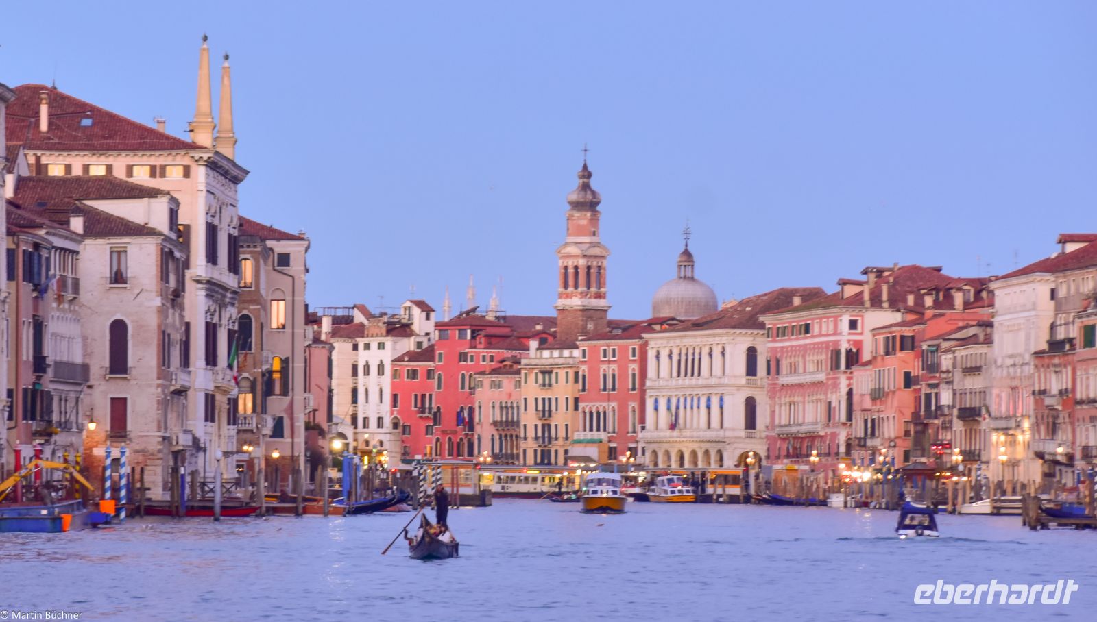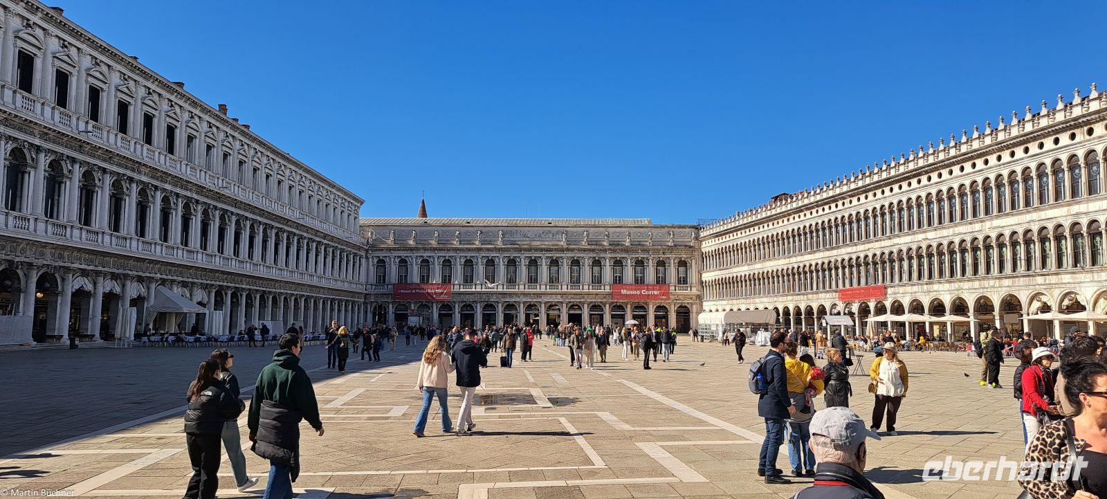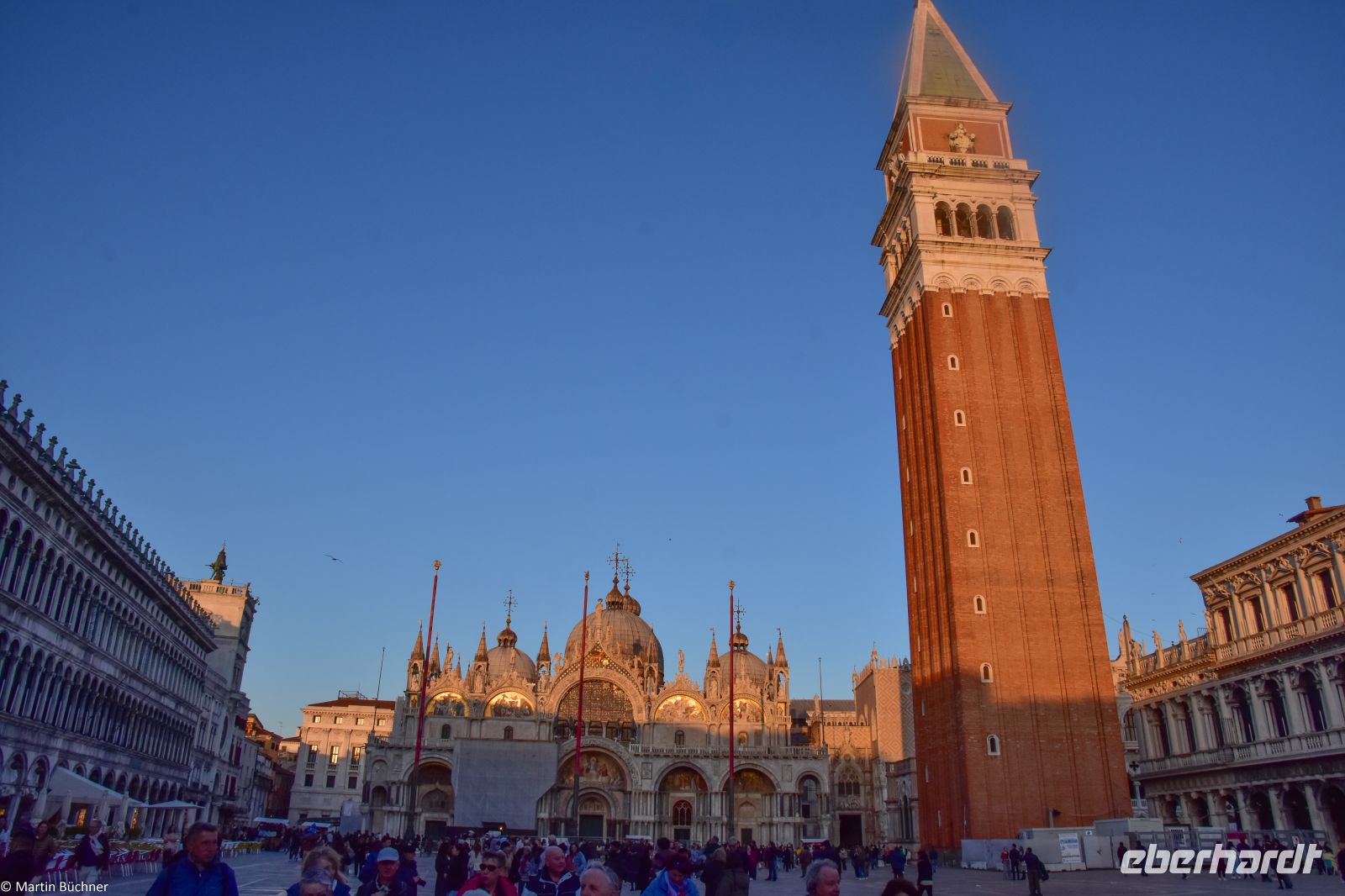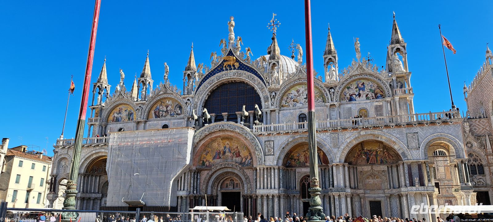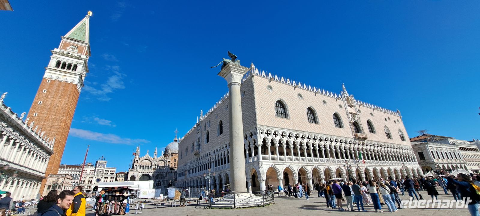 Am Morgen reisen wir mit dem Zug von San Trovaso nach Venezia Santa Lucia, dem Hauptbahnhof der Stadt Venedig. Von dort wechseln wir auf das Vaporetto, den Wasserbus in Venedig. Mit der Linie 2 folgen wir dem Canal Grande vorbei an der Ponte Rialto und der berühmten Filmterrasse des Inspektor Brunetti aus der Filmreihe Donna Leon und weiter bis zum Piazza San Marco, dem berühmten Markusplatz. Hier beginnt unsere Stadtführung in Venedig. Palazzo Ducale auch Dogenpalast genannt, Seufzerbrücke, Campanile, Piazetta di San Marco und natürlich Piazza San Marco mit der Basilica San Marco, in der die Gebeine des Heiligen Markus, Evangelist, liegen.