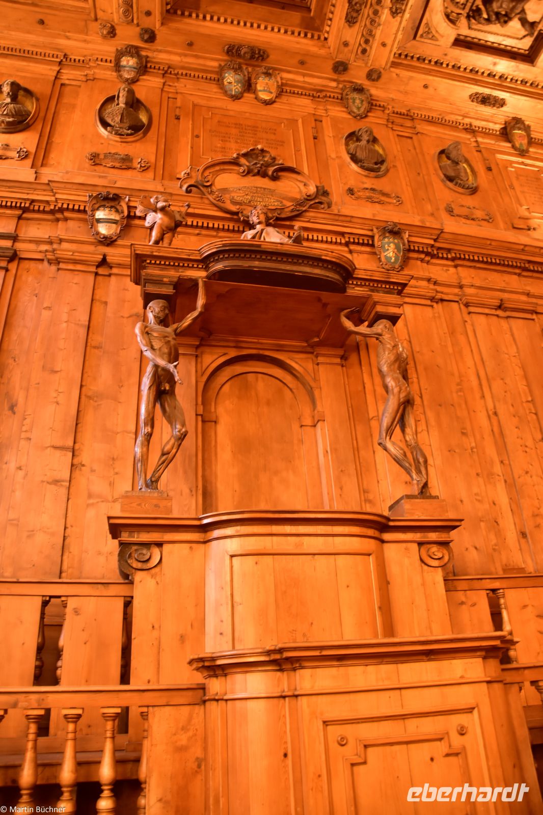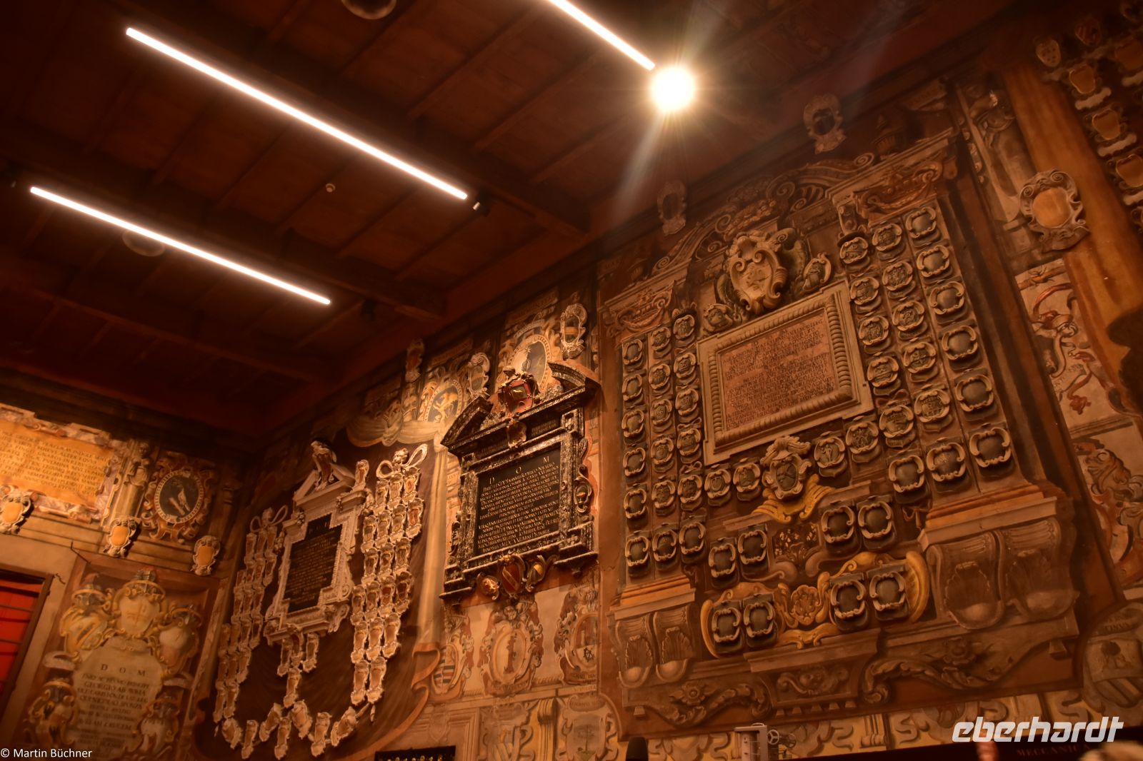 Bunt bemalte historische Gänge mit hunderten von farbigen Wappen, ein imposanter Hörsaal und Kilometer von Bibliotheksregalen.