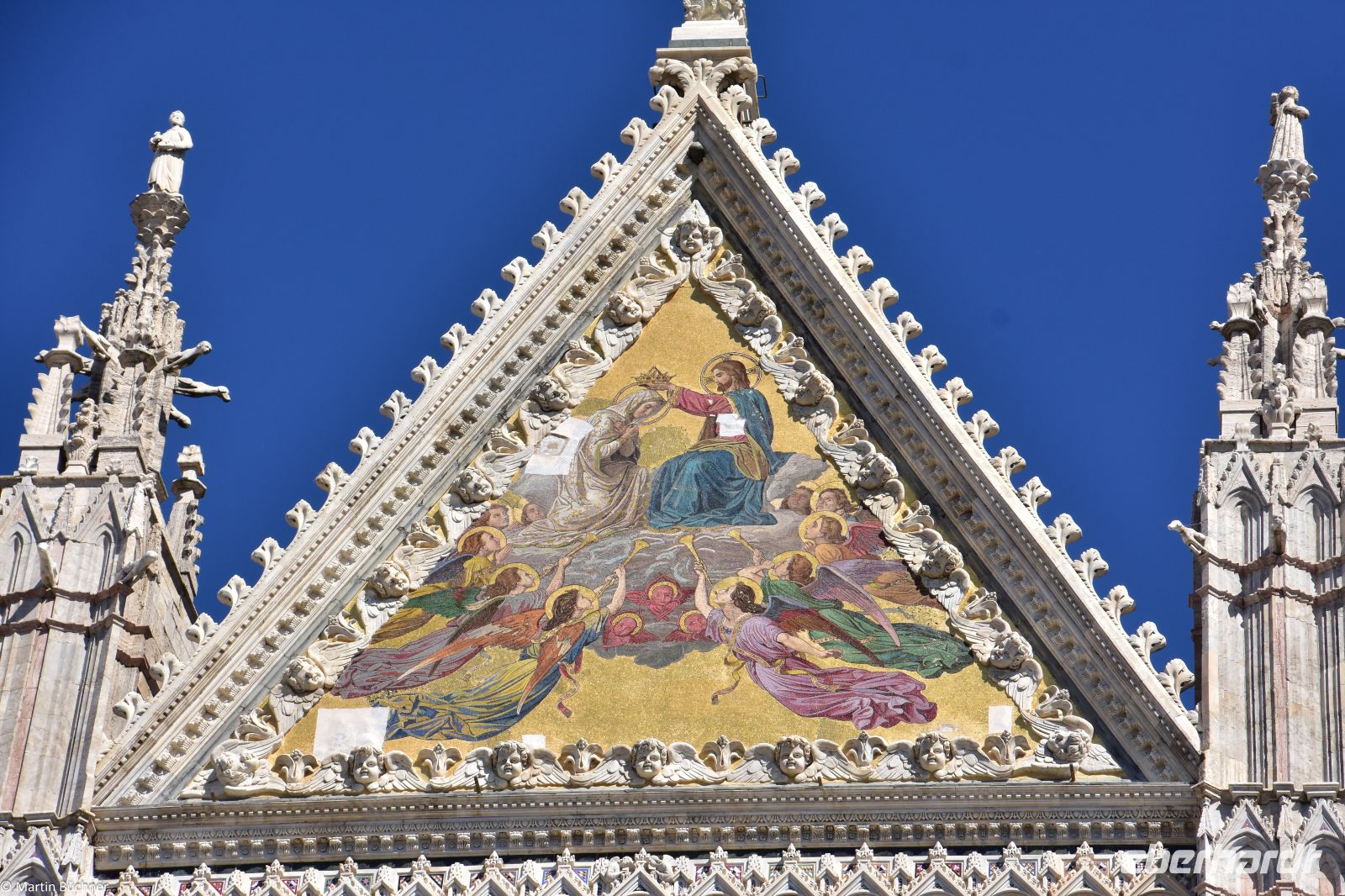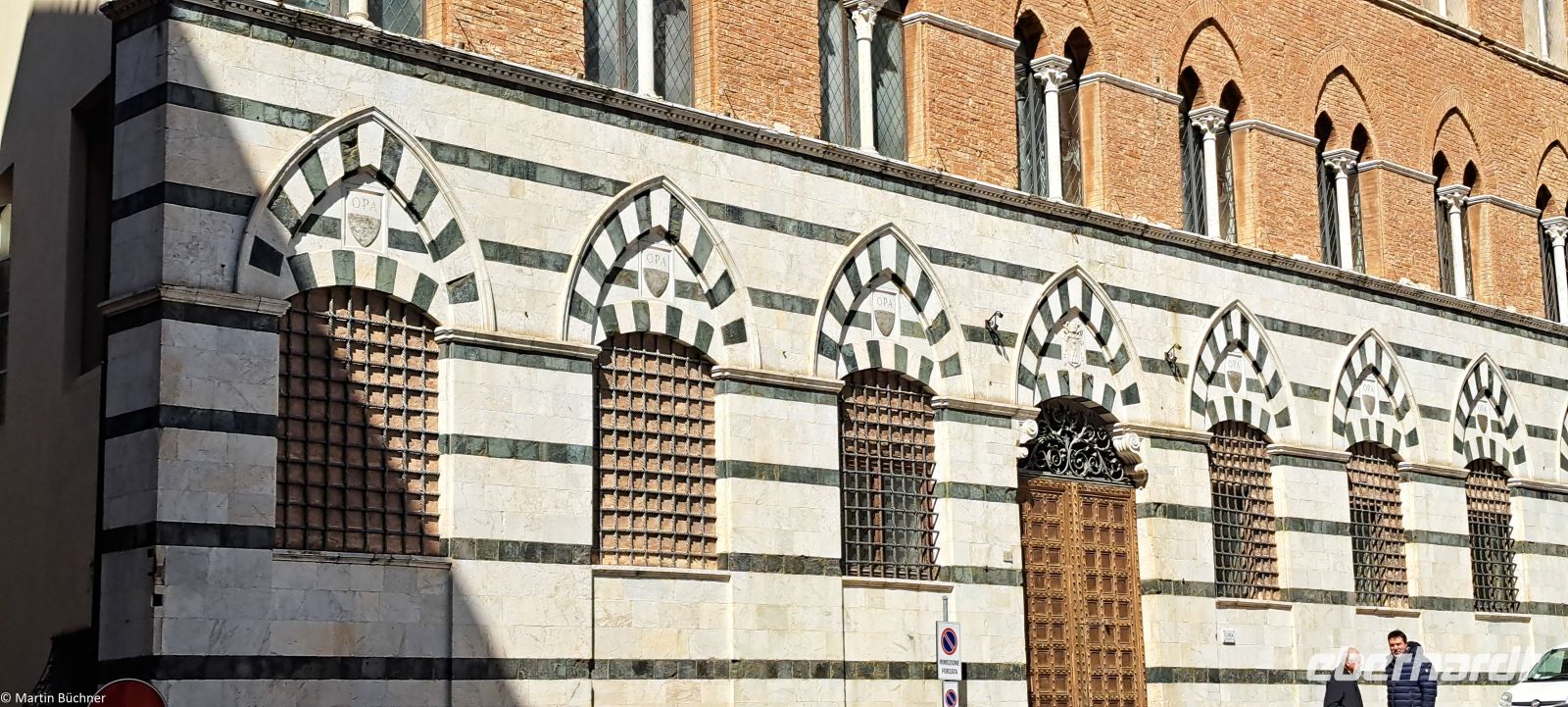 Siena, die große Konkurrentin von Florenz. Versteckt, geschützt inmitten von Hügeln ist sie kaum auszumachen. Contraden, die Stadtviertel von Siena, bilden das Herz und die Seele der Stadt. Alljährlich im August findet auf dem Rathausplatz der Paleo, das legendäre Pferderennen statt. Die Contraden wählen einen Jockey aus und bekommen wenige Stunden vor dem Rennen ein beliebiges Pferd zugelost. Dramatische Szenen spielen sich dann ab. Die gesamte Bevölkerung der Stadt versammelt sich im Zentrum des Rathausplatzes. Kreisförmig um die Menschenmenge wurde eine Sandbahn angelegt, auf der die Pferde um die Menschenmenge herumjagen. Wer denkt römische Spiele der Antike sind vorbei, der irrt. Ein Spektakel. Der Sieger des Rennens macht die entsprechende Contrade für ein Jahr glücklich. Unweit des Rathausplatzes liegt der berühmte Dom von Siena. Unvollendet, ein imposantes Bauwerk, dass sich sehr wohl mit dem Dom in Florenz messen kann. Außerdem steht Siena für eine Farbe, genau gesagt für zwei Farben, das eine ist Sienagelb und dass andere ist Sienarot. Ebenso hat die Stadt einen eigenen gotischen Bogen herausgebracht, den Siena Bogen, ein doppelter gotischer Bogen.