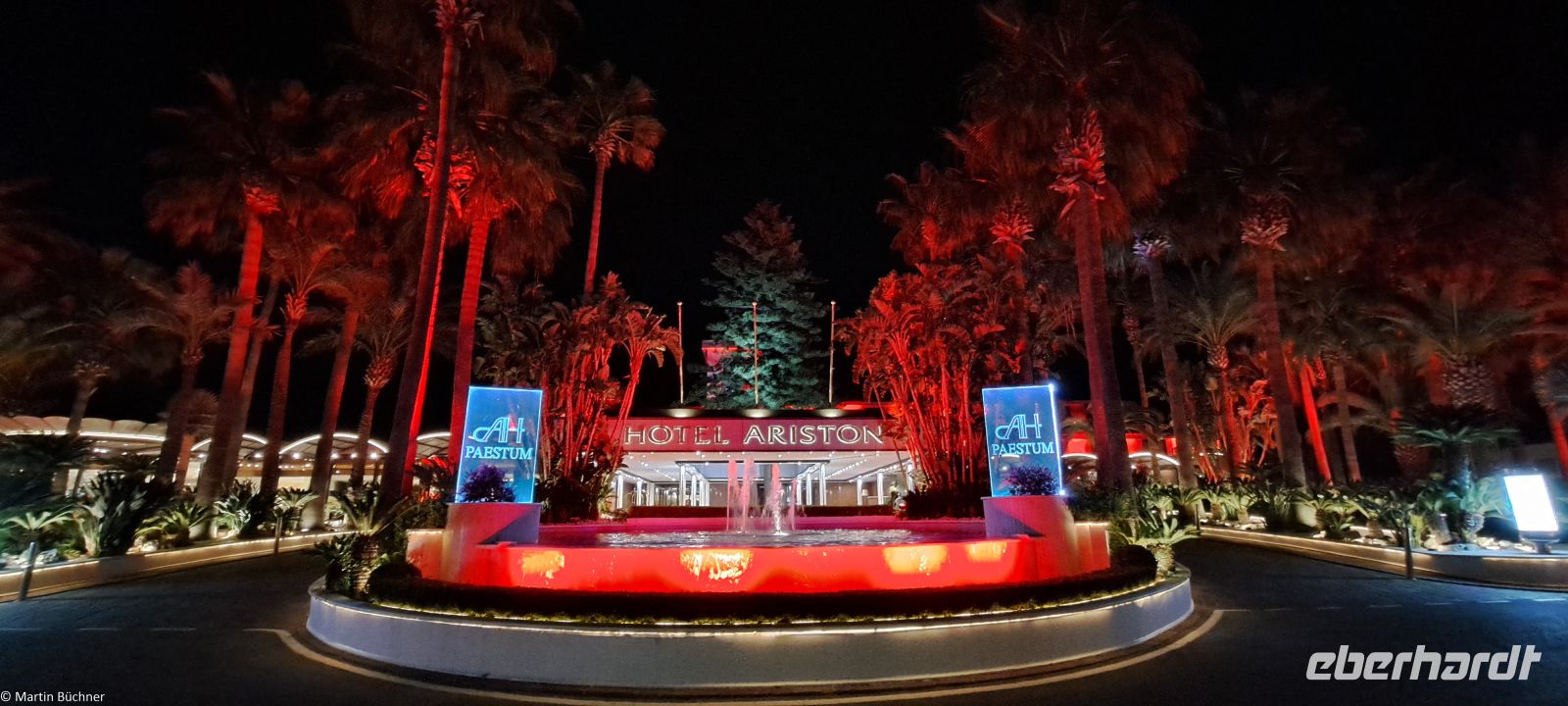 Wir lassen uns die Laune dennoch nicht verderben und erkunden die Stadt Taormina. Dazu zählt natürlich auch der Besuch des Teatro Greco, das berühmte griechisch-römische Theater. Etwas nördlich von Taormina liegt unser Hotel. Die Lage ist markant, benötigt man doch mehrere Aufzüge und Schrägseilbahnen, um zu seinem Hotelzimmer zu gelangen.
