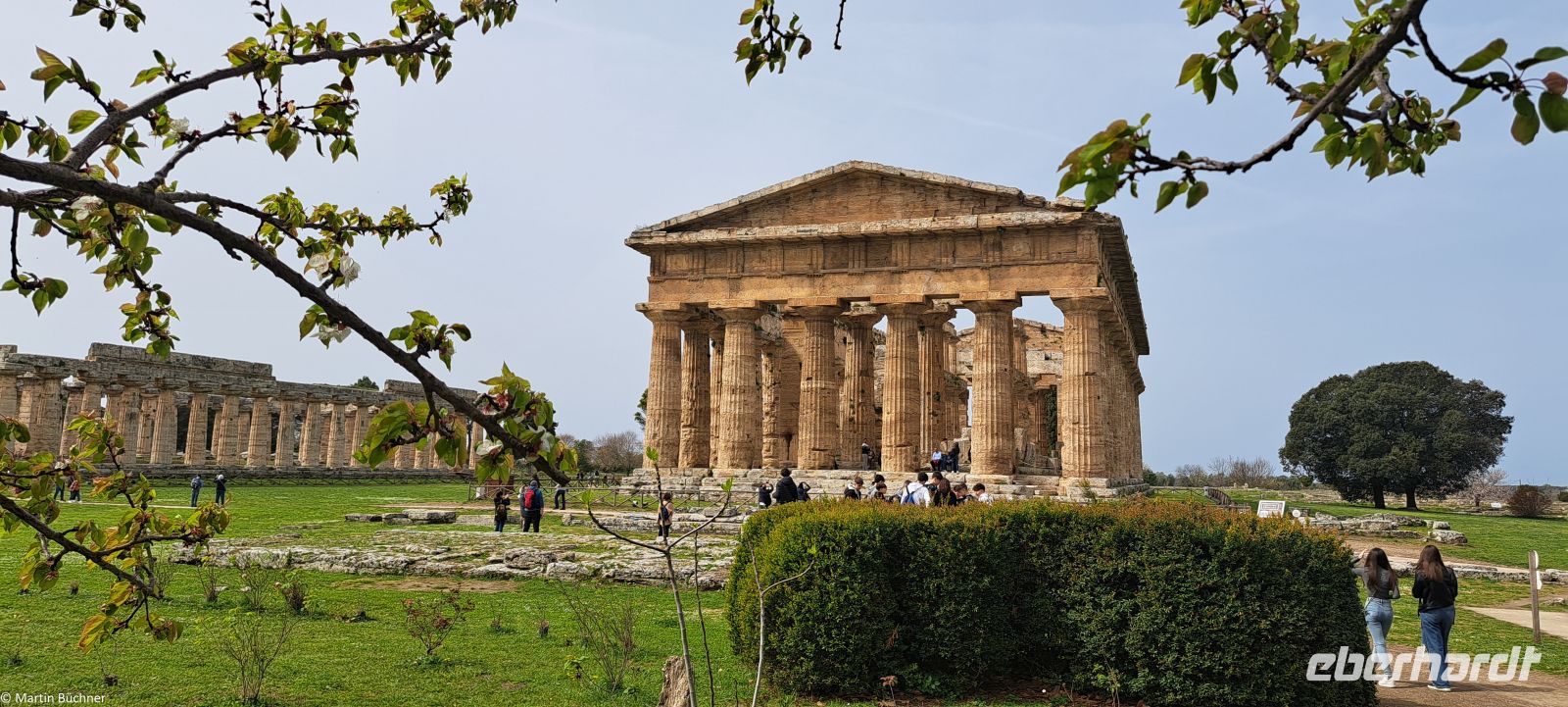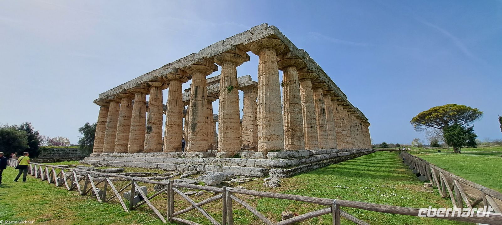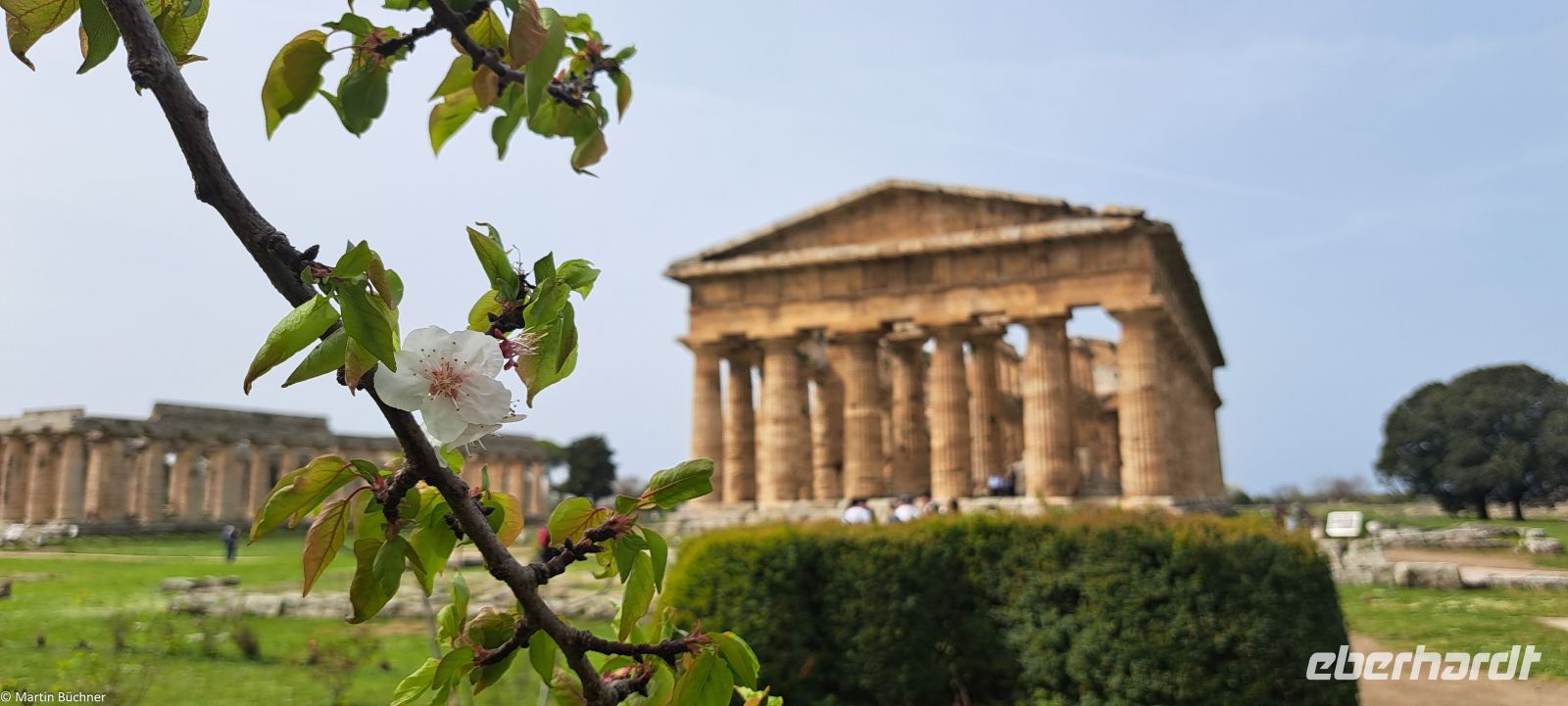 Wir verlassen die ewige Stadt Rom. Über die A1 bzw. E45 erreichen wir den Montecassino. Hoch oben auf dem Berg, gründete im 6. Jahrhundert Benedikt von Nursia den Benediktiner Klosterorden. Es ist bis heute das Mutterkloster aller Benediktiner Klöster in der Welt. Im Zweiten Weltkrieg tobte dort oben eine entsetzliche Schlacht, in der das Kloster völlig zerstört wurde. In nur wenigen Jahren nach dem Zweiten Weltkrieg wurde das Kloster vollständig wiederaufgebaut. Kriegsgräber erinnern an diese schreckliche Schlacht. Vom Berg selbst hat man einen fantastischen Ausblick auf die schneebedeckten Berge des Apennins. Von Monte Casino folgen wir der E45 in Richtung Süden, vorbei am antiken Capua bis nach Neapolis, Napoli, Neapel, die neue Stadt. Heute nennt man diese Straße A1 oder E45, früher hieß sie Via Appia, eine antike römische Straße. Sie verband die damals zwei größten Städte des Römischen Reiches, Rom und Capua im Süden. Auf ihr zog schon Hannibal aus Karthago, der im Zweiten Punischen Krieg mit seinen Elefanten über die Alpen kam, in Richtung Rom. Ferner ist die Via Appia bekannt vom Spartakusaufstand, dem Sklavenaufstand. Als dieser von den Römern blutig niedergeschlagen wurde, wurden über 6.000 Sklaven entlang der Via Appia gekreuzigt. Dies ist die Geschichte als „Spartakusaufstand“ eingegangen. Vorbei am Vesuv erreichten wir das antike Pompeji, 79 n. Chr. vom Vulkan total zerstört. Eine todbringende heiße pyroklastische Wolke vernichtete in kurzer Zeit alles Leben in der Stadt. Für die Menschen damals ein dramatisches Ereignis. Für uns ein Glücksfall, öffnet sie doch ein Fenster in eine völlig vergangene Zeit. Bei einer Führung erkunden wir die einzigen Ruinen. Am späten Nachmittag geht es weiter in Richtung Golf von Salerno und nach Paestum.