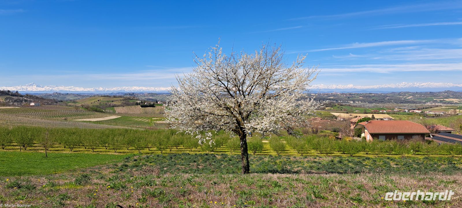 Asti, eine Kleinstadt in Piemont, liegt inmitten dieser Landschaft. Auch hier erkunden wir die Stadt bei einer Stadtführung, bevor es am frühen Nachmittag zu einer Weinverkostung geht. War es in Sizilien noch nebelig, werden wir heute für unsere Geduld belohnt. Heute ist „der Tag“ an dem alle Fotografen hinausfahren und die typischen Piemont-Impressionen einfangen. Ein 270 Grad Panoramabogen mit schneebedeckten Alpengipfeln zum Teil über 4.000 Meter hoch. Davor blühende Obstbäume – der Frühling ist angekommen im Piemont.
