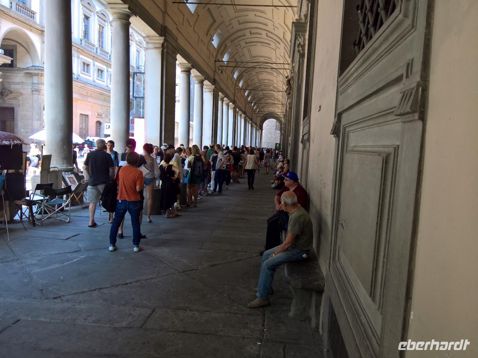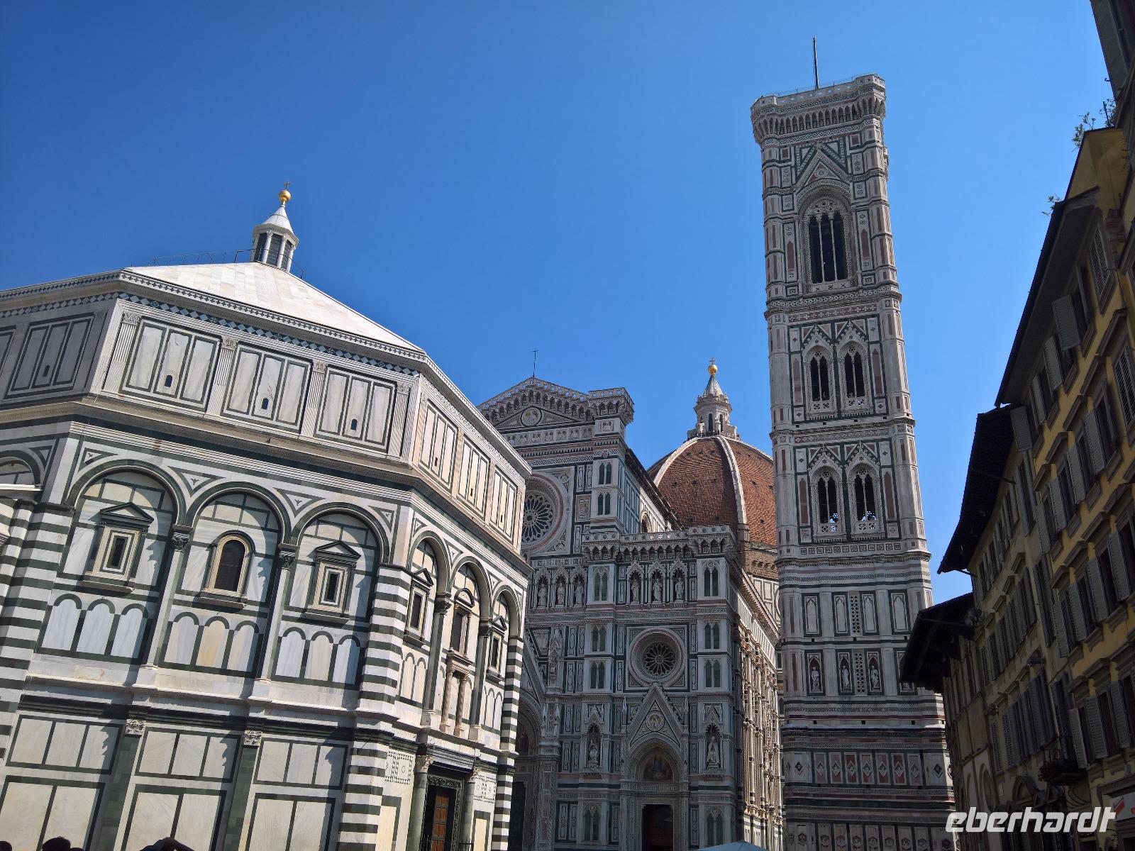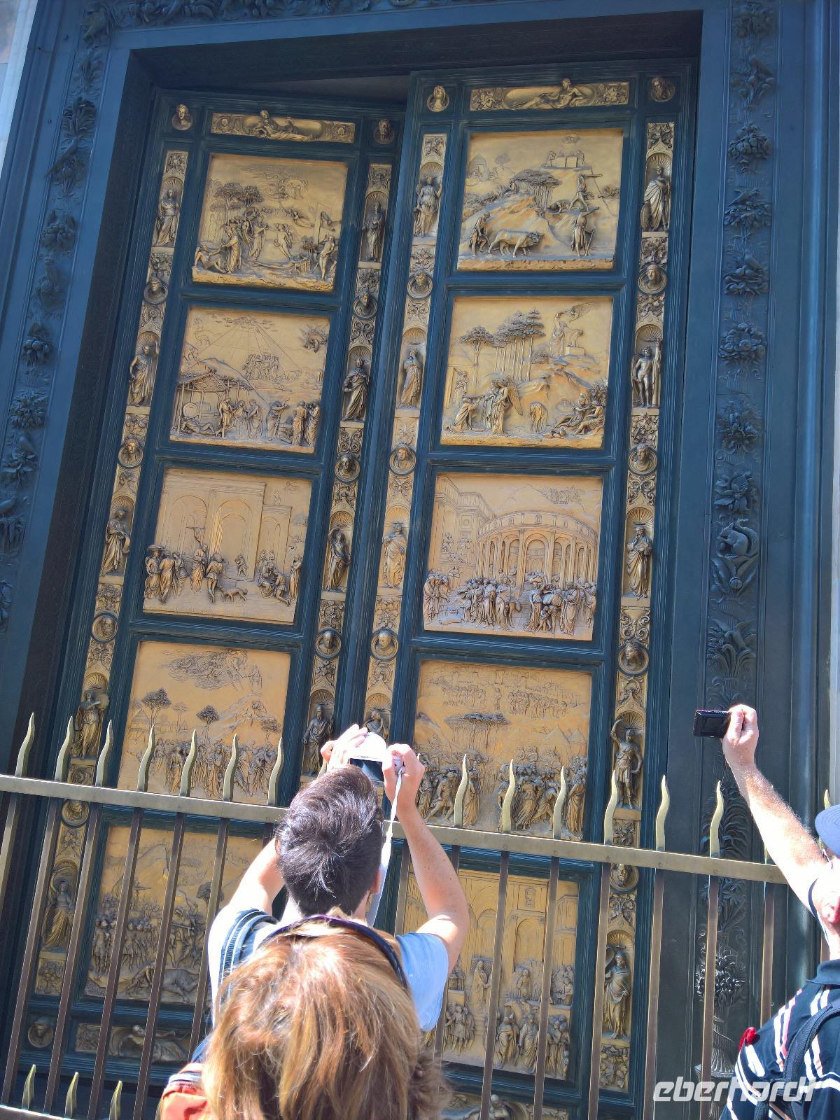 Zwischen dem Palazzo und der Loggia gelangt man zum Uffizienpalast. Dieser Palazzo, einst Verwaltungs- und Gerichtsgebäude, beherbergt heute eine der bedeutendsten Gemäldegalerien der Welt. Ich zähle ca 200 Menschen, die geduldig anstehen, um hineinzugehen. Für uns gilt: vielleicht ein Andermal. Nun ein Blick zur berühmten Brücke "Ponte Vecchio" aus dem Jahre 1333, auf der heute Goldschmiede und Juweliere ihre wertvollen Preziosen zum Kauf anbieten. Danach gehen wir zur Kirche Santa Maria dei Fiore, dem Dom von Florenz. Wir erfahren von Herrn Feldmann, dass sie nach der Peterskirche in Rom die zweitgrößte Kirche Italiens ist. Gleich daneben der 82 m hohe Campanile, einer der schönsten Glockentürme der Welt. Wiederum daneben befindet sich das Baptisterium, die Taufkapelle, mit ihren herrlichen Bronzetüren, die schon Michelangelo als die "Pforte des Paradieses" genannt hat.