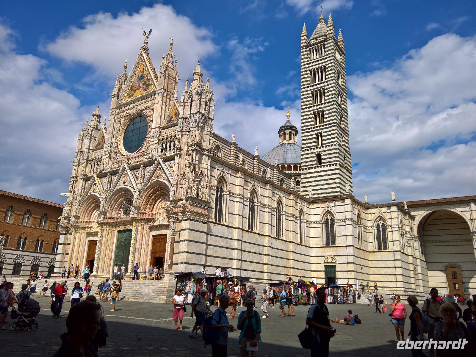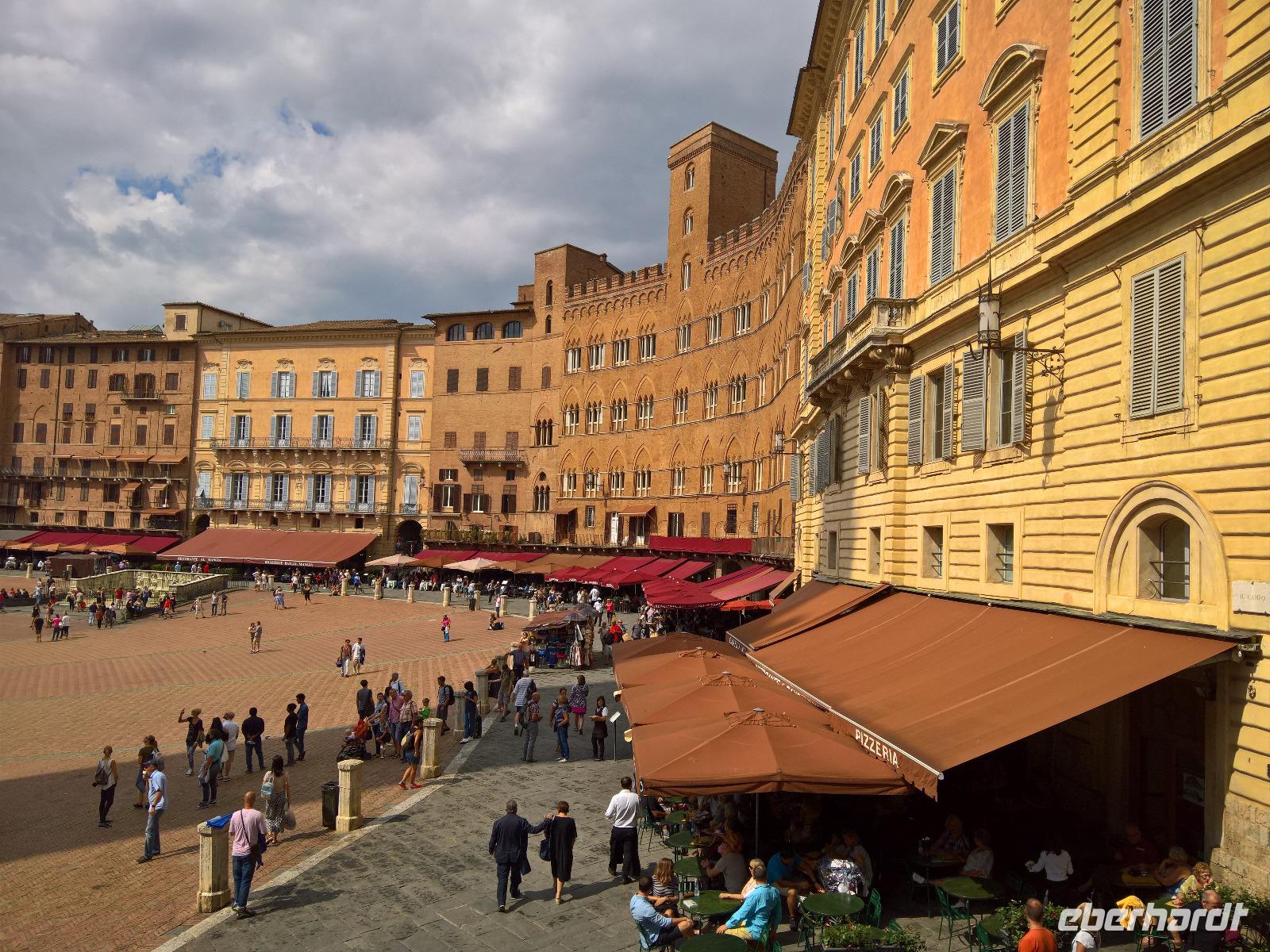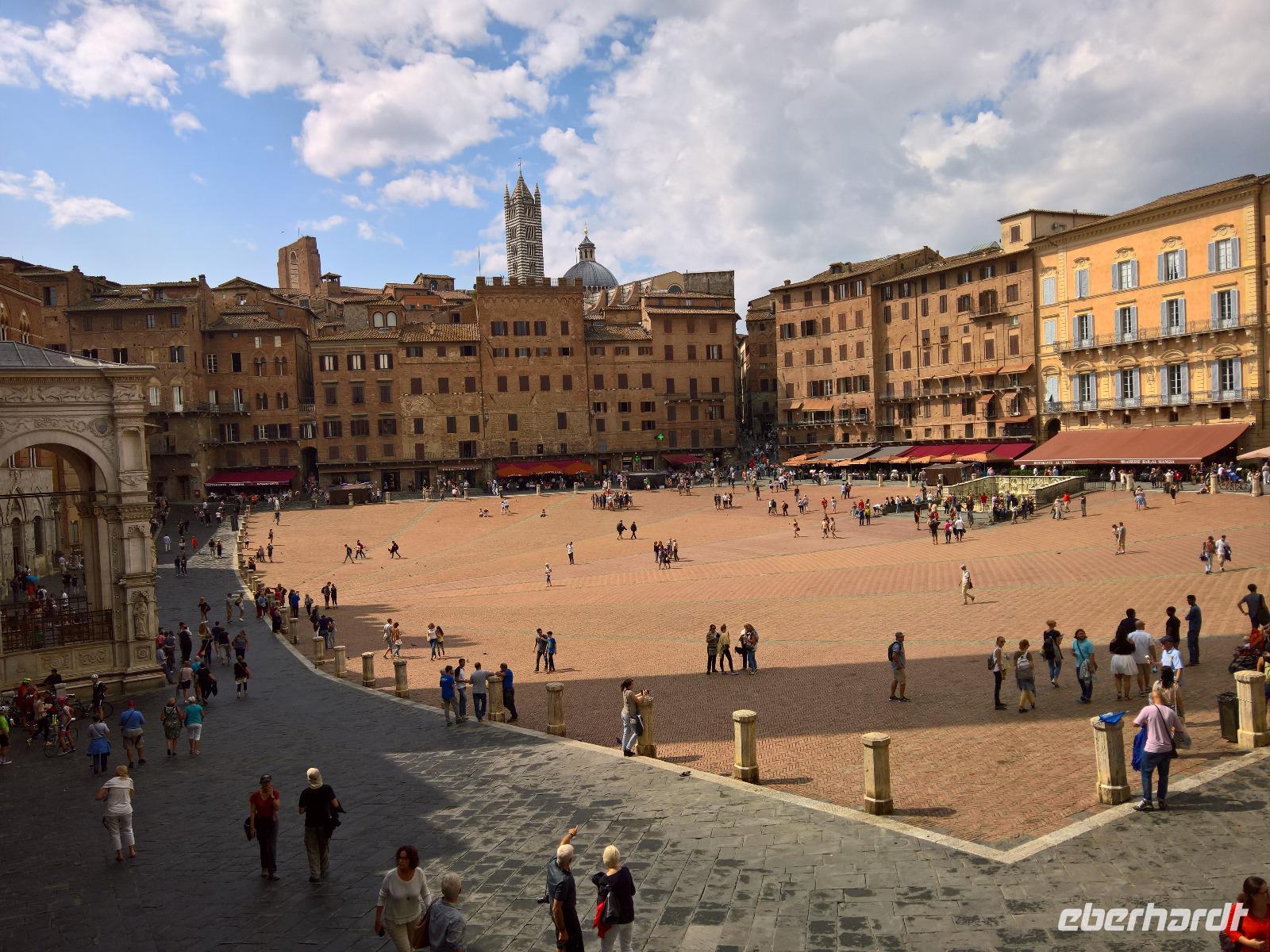 Kein Problem. Wir fahren nach Siena und mit unserem Bus hoch zur Festung. Von dort laufen wir an der Festungsmauer entlang und erst einmal am Dom vorbei, um zur Piazza del Campo zu gelangen. Hier findet seit dem 13. Jh. der berühmte Palio statt, das Pferderennen der 17 Bezirke (Contrade) der Stadt. Das Rennen der Stadtteile gegeneinander soll an die eigene Stärke der Stadt und besonders an den Sieg über das mächtige Florenz im September 1260 erinnern. Es begegnet uns der mittelalterliche Charakter der italienischen Gotik auf Schritt und Tritt und gipfelt dann in der Betrachtung des Domes aus schwarzem und weißem Marmor und einer sechseckigen romanischen Kuppel, die Ausdruck davon ist, dass der Bau bereits im 13. Jh. begonnen wurde und sich dann bis ins 14. Jh. hinein hinzog.