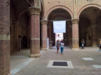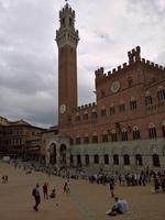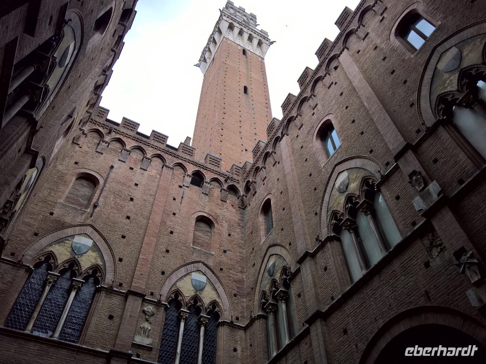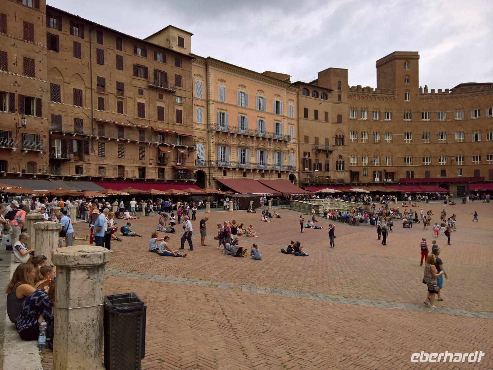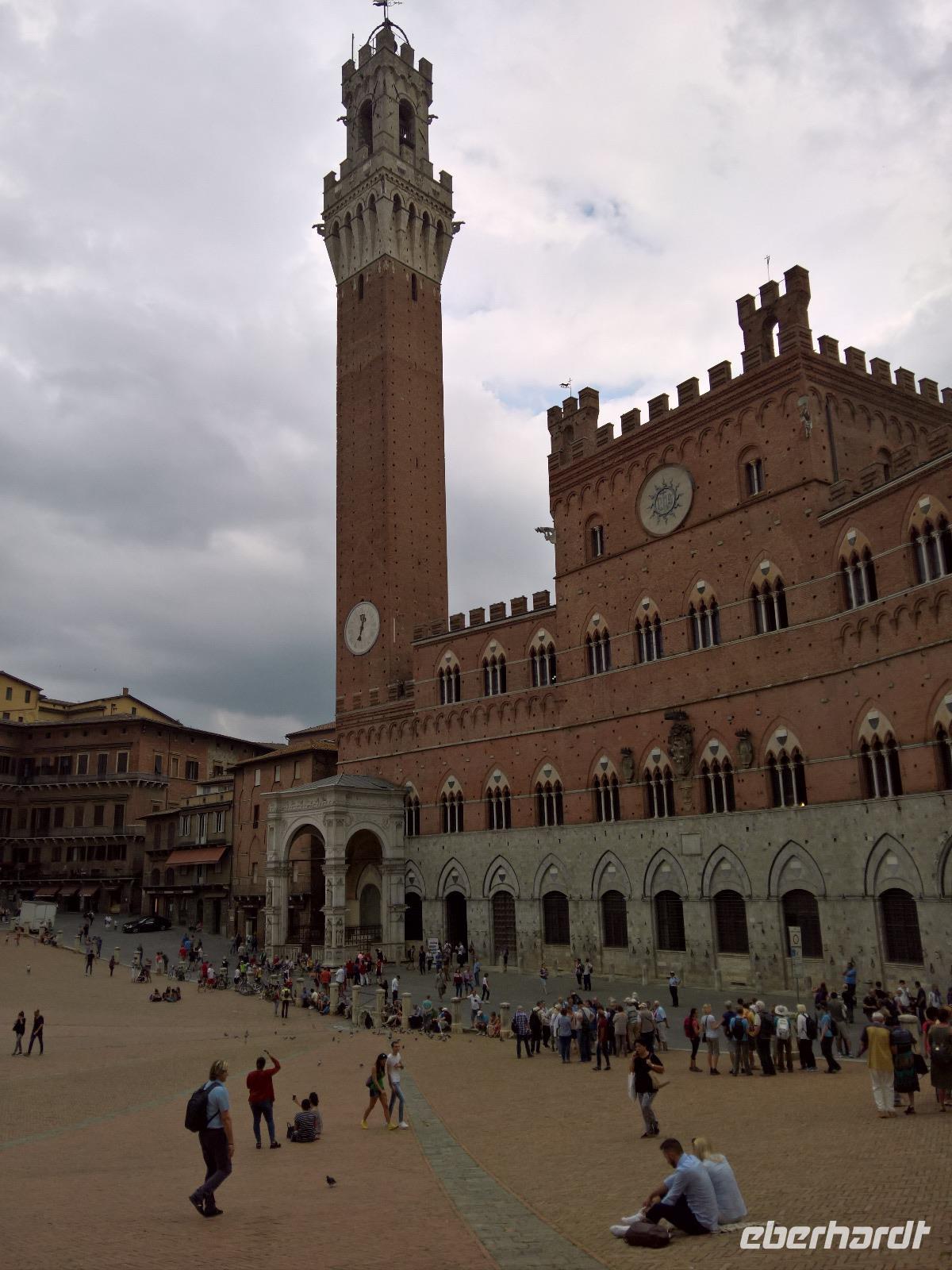 Kein Problem. Wir fahren nach Siena und mit unserem Bus hoch zur Festung. Von dort laufen wir an der Festungsmauer entlang und erst einmal am Dom vorbei, um zur Piazza del Campo zu gelangen. Hier findet seit dem 13. Jh. der berühmte Palio statt, das Pferderennen der 17 Bezirke (Contrade) der Stadt. Das Rennen der Stadtteile gegeneinander soll an die eigene Stärke der Stadt und besonders an den Sieg über das mächtige Florenz im September 1260 erinnern. Es begegnet uns der mittelalterliche Charakter der italienischen Gotik auf Schritt und Tritt und gipfelt dann in der Betrachtung des Domes aus schwarzem und weißem Marmor und einer sechseckigen romanischen Kuppel, die Ausdruck davon ist, dass der Bau bereits im 13. Jh. begonnen wurde und sich dann bis ins 14. Jh. hinein hinzog.