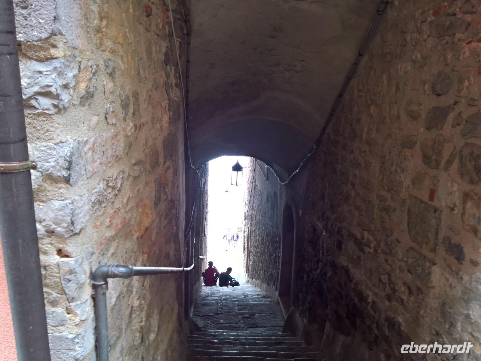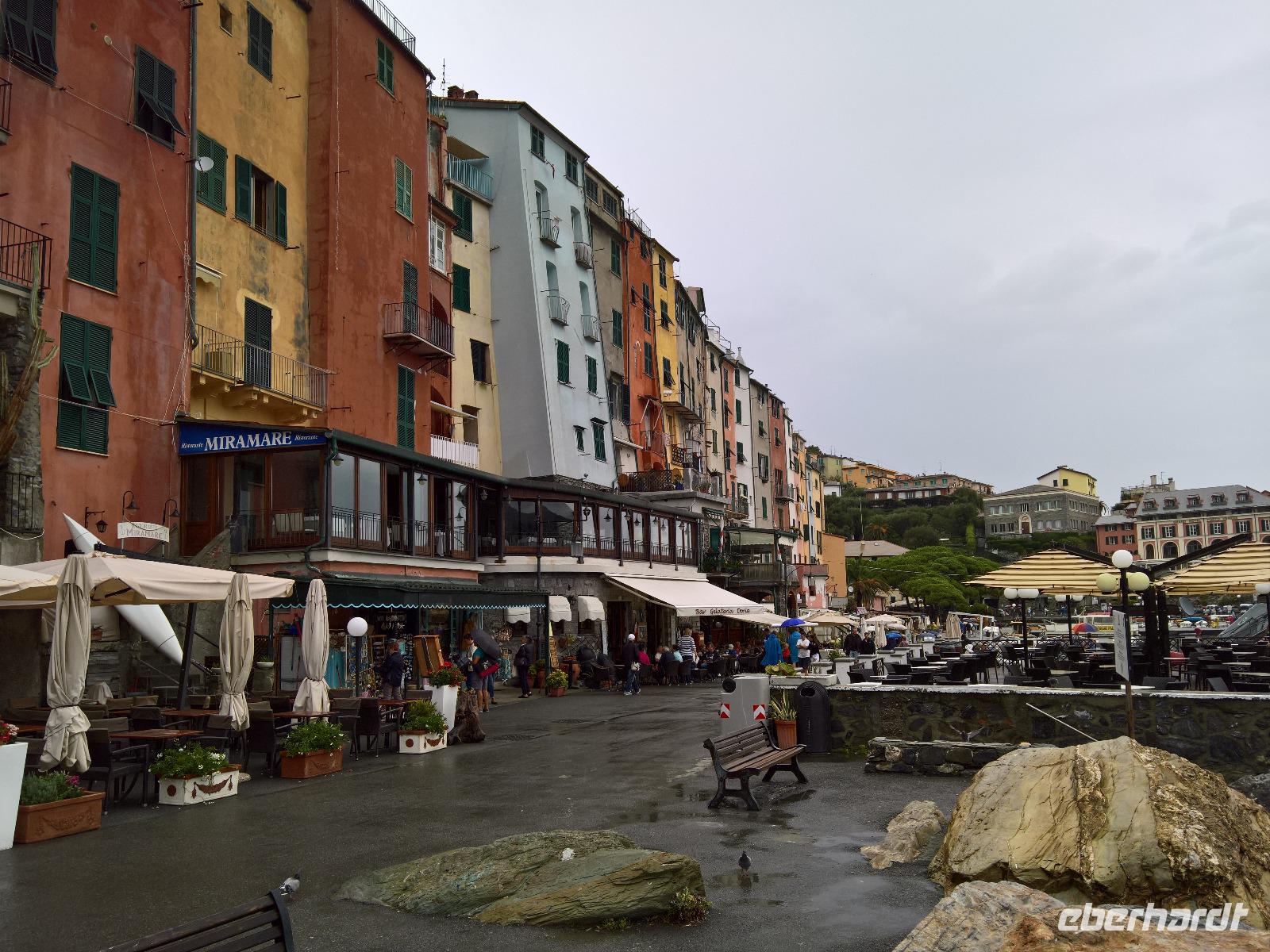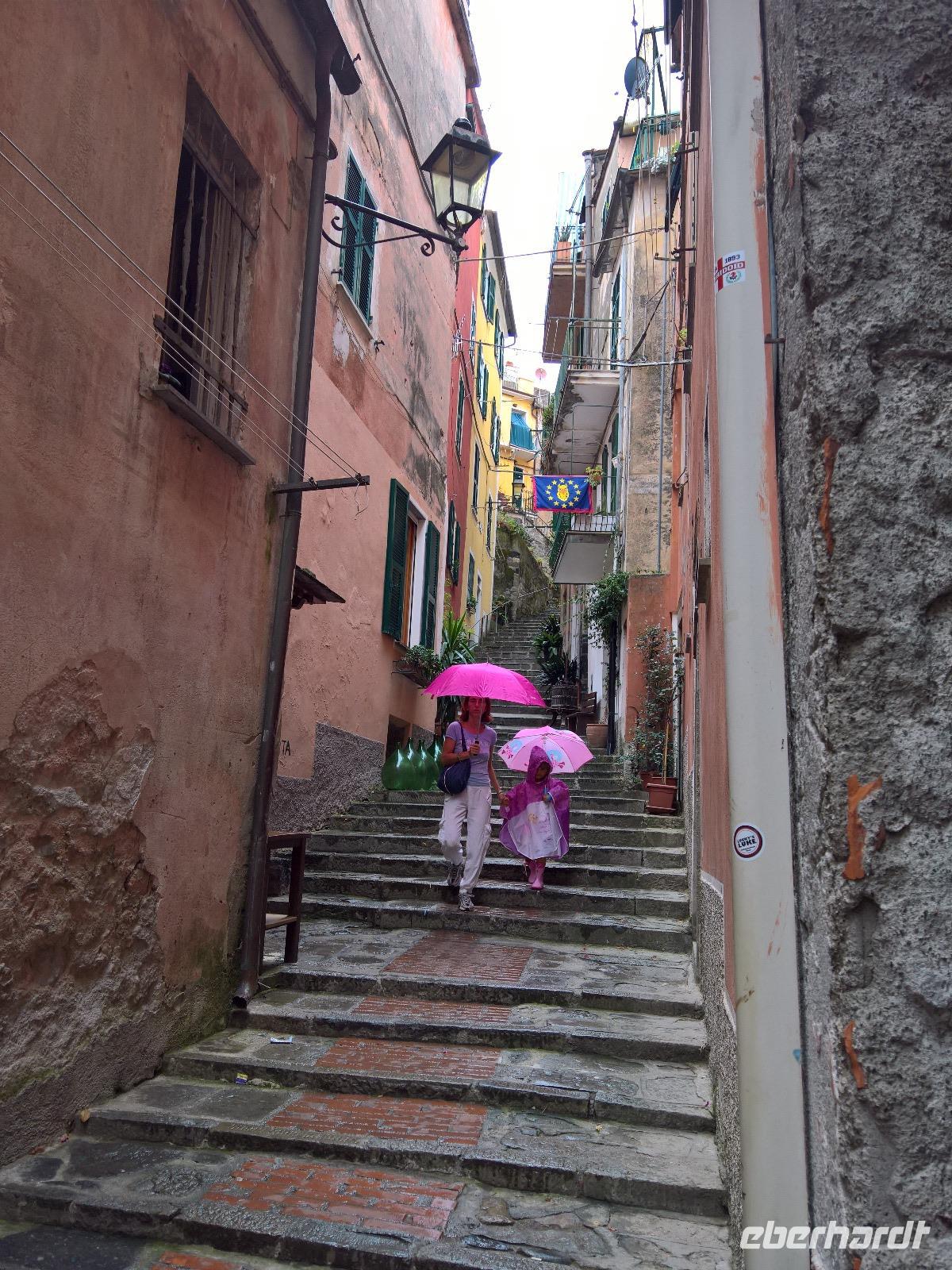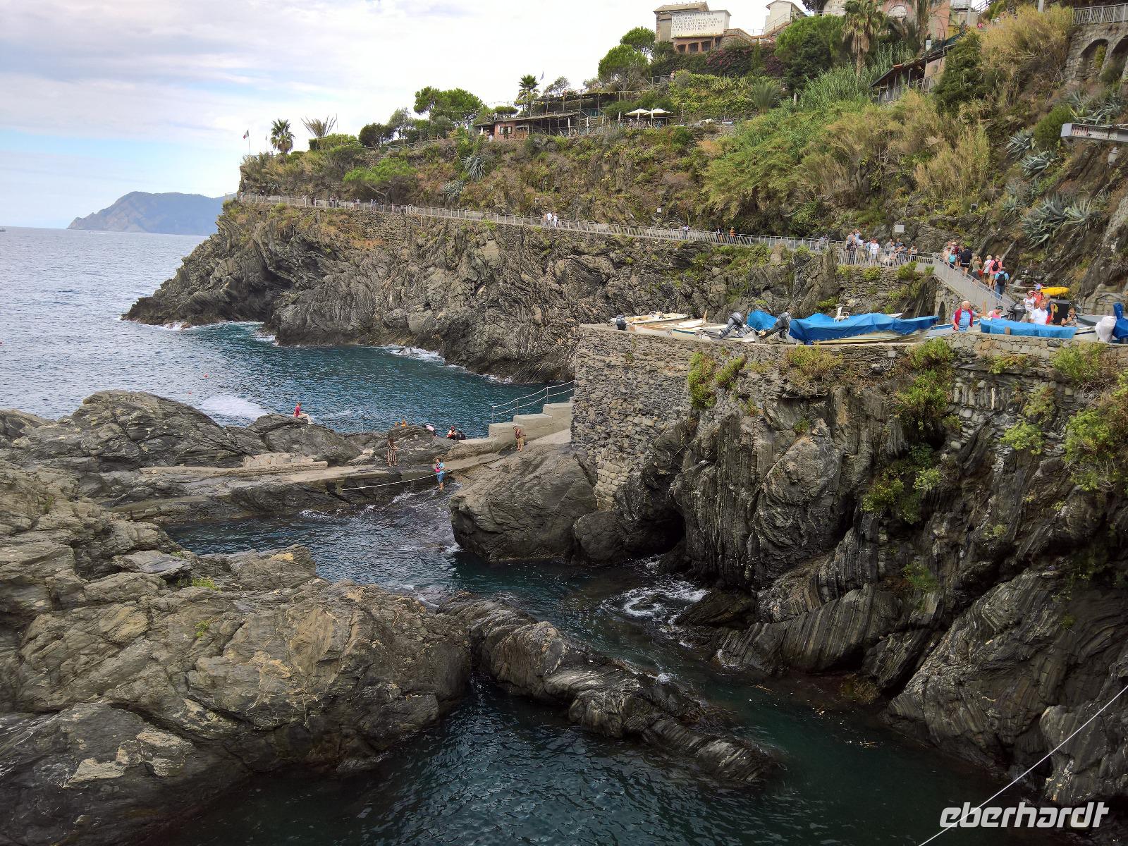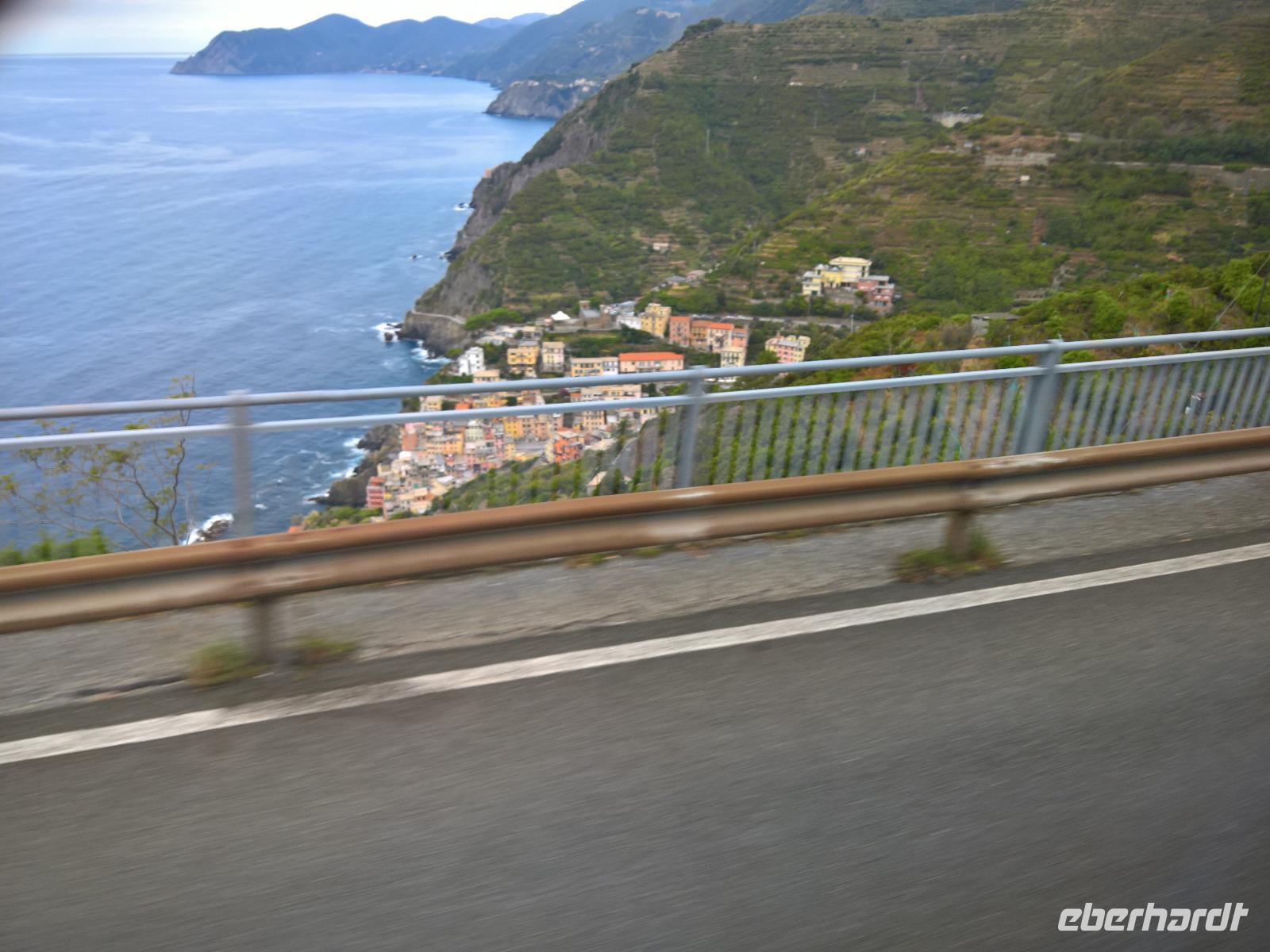 Gut, dass wir den Tag getauscht hatten, denn Britta unsere Reiseführerin durch den heutigen Tag, erzählte uns von 3 Stunden Dauerregen am Vortag. Heute scheint immer wieder die Sonne und so fahren wir mit unserem Bus nach La Spezia, wo Britta zusteigt. Auf der Fahrt über eine Höhenstrasse nach Manarola können wir auf die Hafenstadt La Spezia hinabsehen und erkennen den größten Militärhafen Italiens am Mittelmeer. In Manarola verabschieden wir uns von Lutz, unserem Busfahrer, für die nächsten Stunden und es geht per pedes ordentlich bergab, eine Treppe hinunter in das Dorf Manarola, wo es eine Ansammlung pastellfarbener Häuser über einem winzigen Hafen in einer Felsbucht zu bewundern gibt.