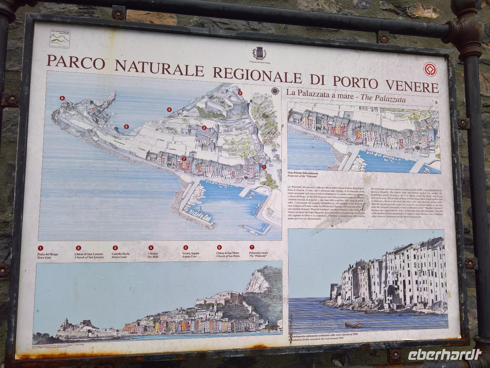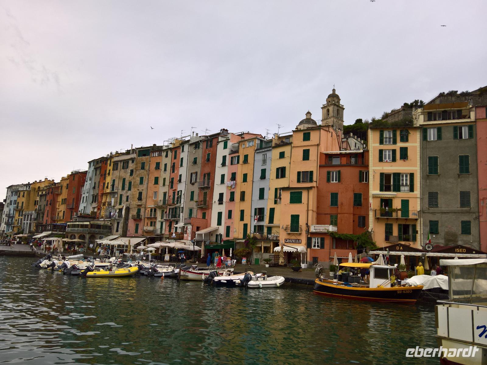 In Portovénere zeigt uns Britta die Kirche San Pietra auf einem Felsvorsprung und wir laufen zurück ins Stätdchen vorbei an wunderschöne bunten Häusern, von denen wir erfahren, dass sie bereits ein Alter von 8oo Jahren "auf dem Buckel" haben.