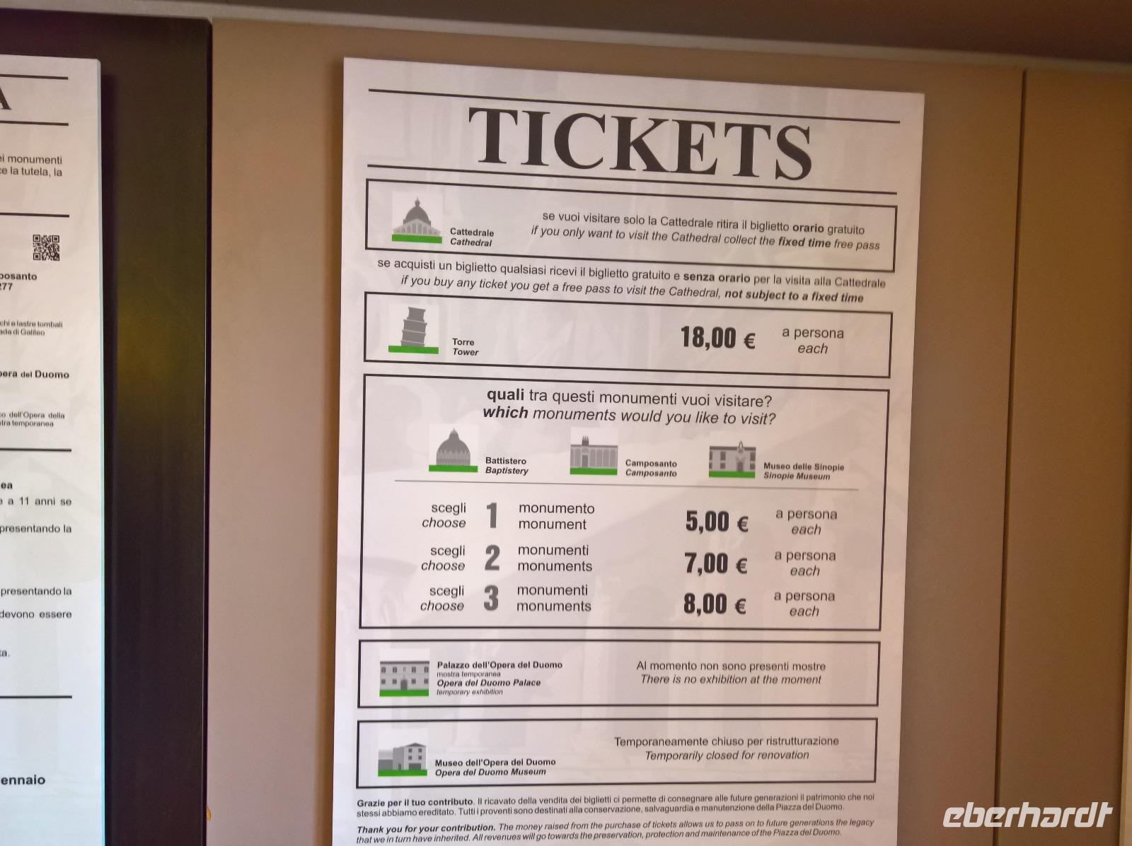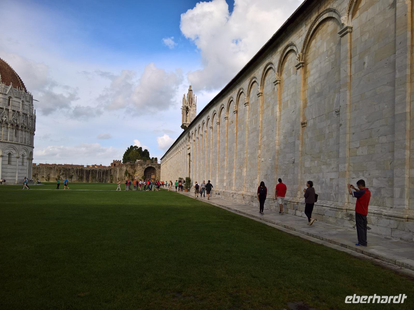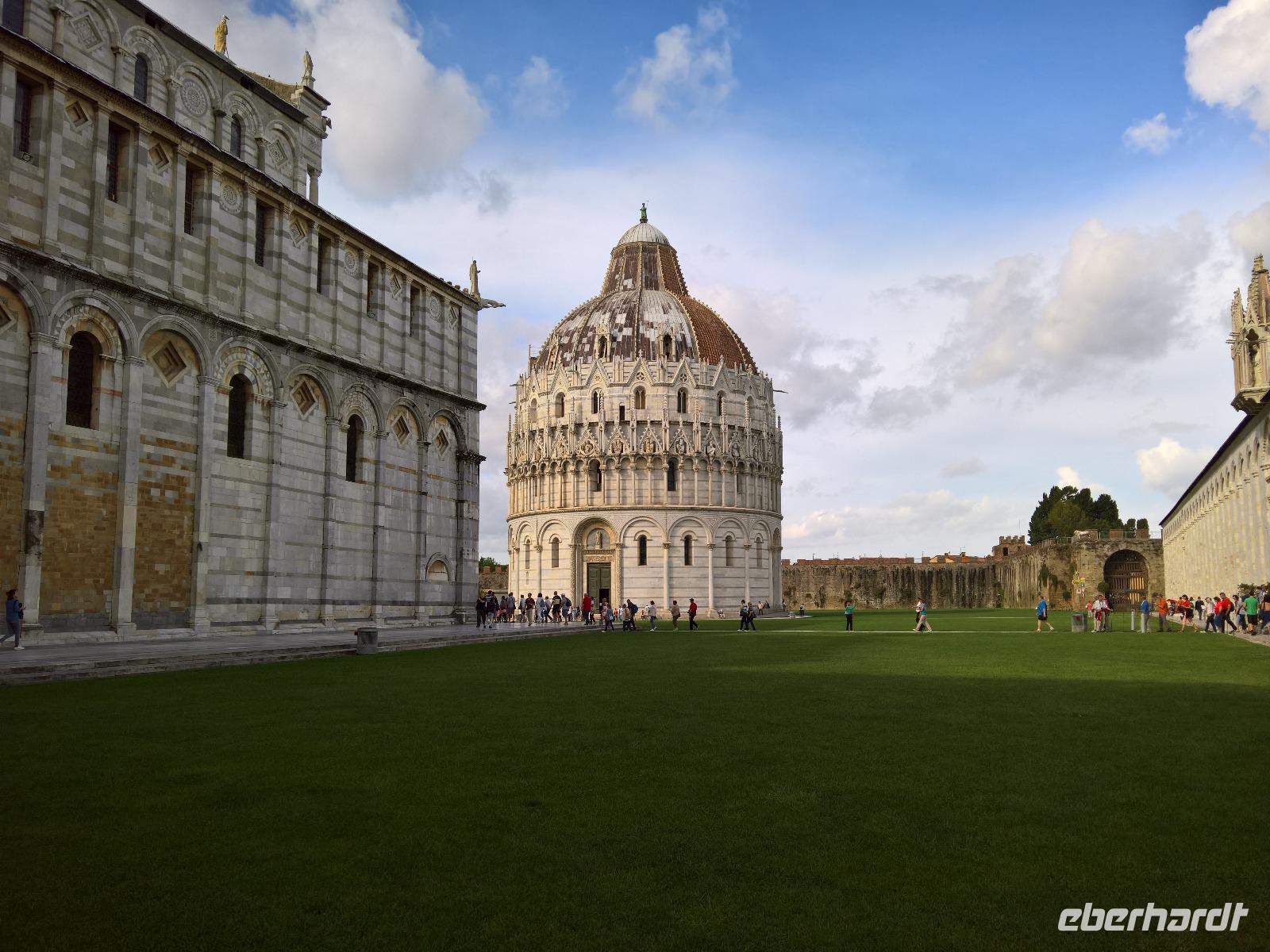 Unterwegs machen wir Halt in Pisa. Die Geburtsstadt Galileo Galilei ist weltberühmt durch ihn aber mehr noch durch den Schiefen Turm von Pisa aus dem 12. Jh. Und dieser gehört zu einem Ensemble auf der Piazza dei Miracoli, zu dem der Dom mit seiner beeindruckenden Fassade aus schwarzem und weißem Marmor zählt, genauso, wie das Baptisterium, die Taufkirche. Aber gleichsam großartig ist der Camposanto, der Monumentalfriedhof aus dem 13. Jh. Allein auf diesem Platz der Wunder lohnt sich unser Besuch. Und wer noch etwas weiter in die Stadt Pisa hineinlaufen will, der kommt zur Piazza dei Cavalieri, einem der schönsten europäischen Plätze der Renaissance.