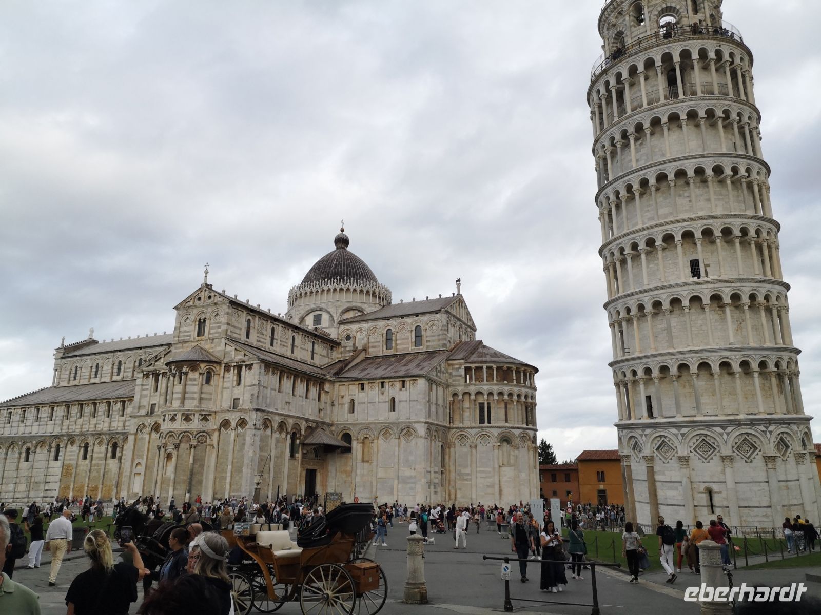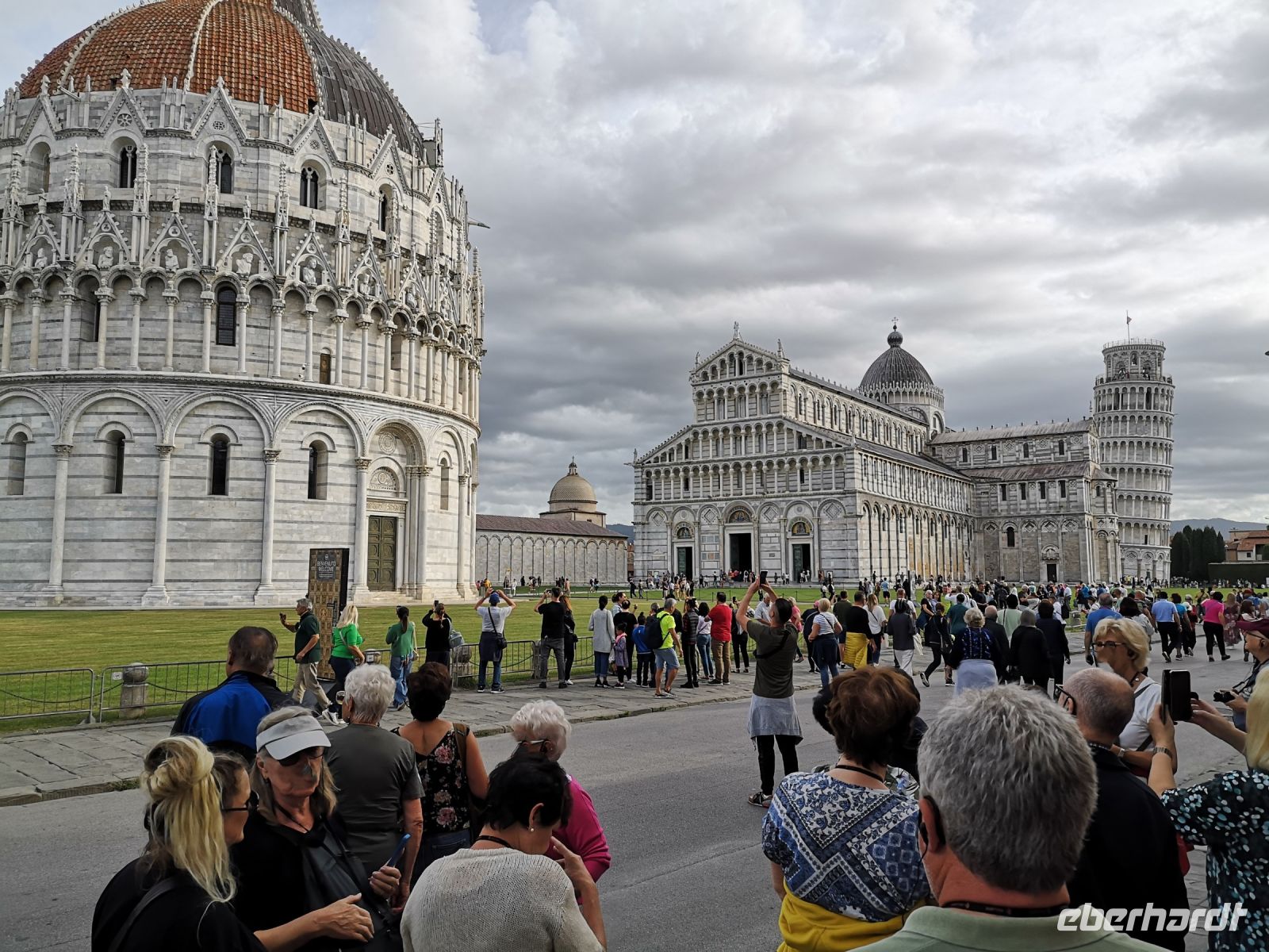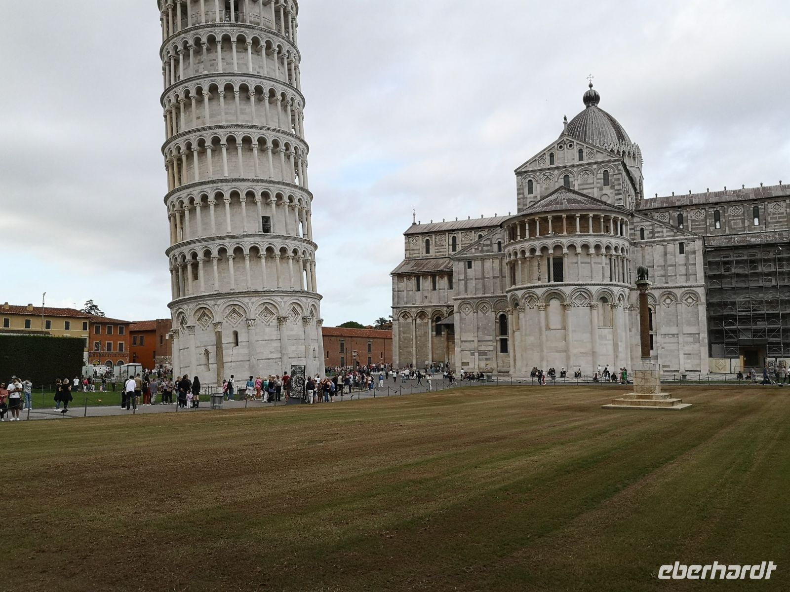 Mit neuer Kraft und einem starken italienischen Kaffee können wir nach dem Frühstück eines der bekannten Wahrzeichen der Toskana ansteuern, den schiefen Turm in Pisa. Wir treffen unsere Stadtführerin Nada am Parkplatz nahe bei Pisa, sie steigt zu uns in den Bus, kaum hat sie das Microphon in der Hand, bringt mit ihrem Temperament gleich den ganzen Bus zum Lachen. Wir fahren gemeinsam in die Stadt und nahe der Innenstadt verlassen wir den Bus und gehen zu Fuß in Zentrum. Es dauert nicht lange und wir sehen die markanten weisen Gebäude die sich auf dem Piazza dei Miracoli zeigen. Ganz zentral der Dom Santa Maria, davor als Einzelgebäude die Baptistische Kirche und dahinter der freistehende Glockenturm, fast 60 Meter hoch und unübersehbar schief geneigt, das Wahrzeichen Pisas, der schiefe Turm von Pisa. Der gesamte Gebäudekomplex steht irgendwie unwirklich vor uns, weiß grau gesteift, total übermächtig füllt er den Platz. Es dauert etwas bis man versteht das es keine Kulisse ist und diese Bauwerke nun schon seit über 650 Jahr hier stehen. Der Turm, der sich auf Grund nachgiebigen Untergrunds, schon während der Erbauung geneigt hatte, benötigte 200 Jahre bis er vollendet werden konnte und nun schlussendlich mit seiner gesamten Masse von 14.500 Tonnen sehr eindrucksvoll balancierend seine Position einhält. Es besteht nach wie vor die Gefahr das er sich weiter neigt, deshalb werden die 7 Glocken zum Geläut nur vorsichtig mit dem Hammer angeschlagen und man verzichtet auf das freie Schwingen der Glocken, was erst den vollen Klang der Glocken entfalten würde.