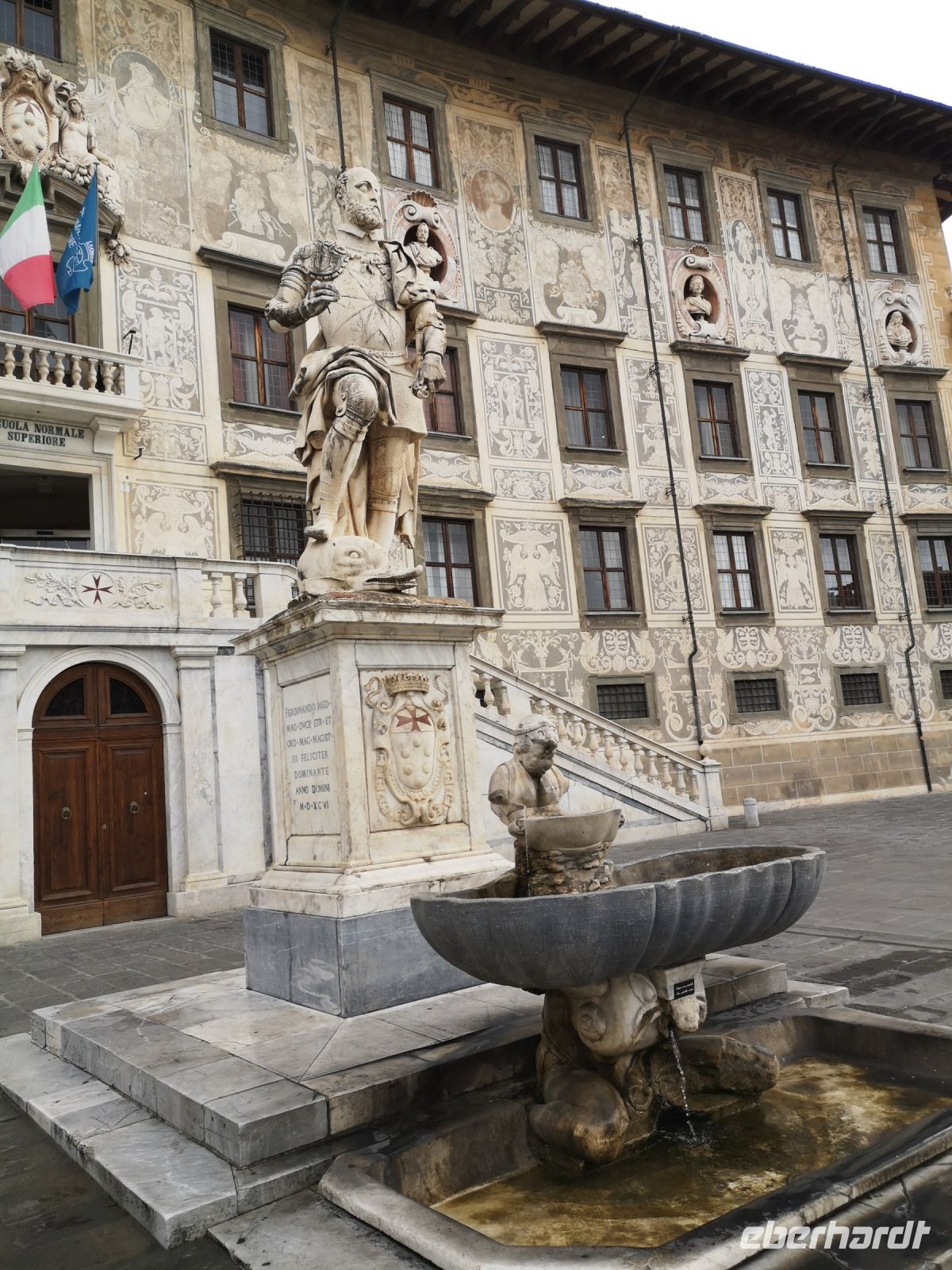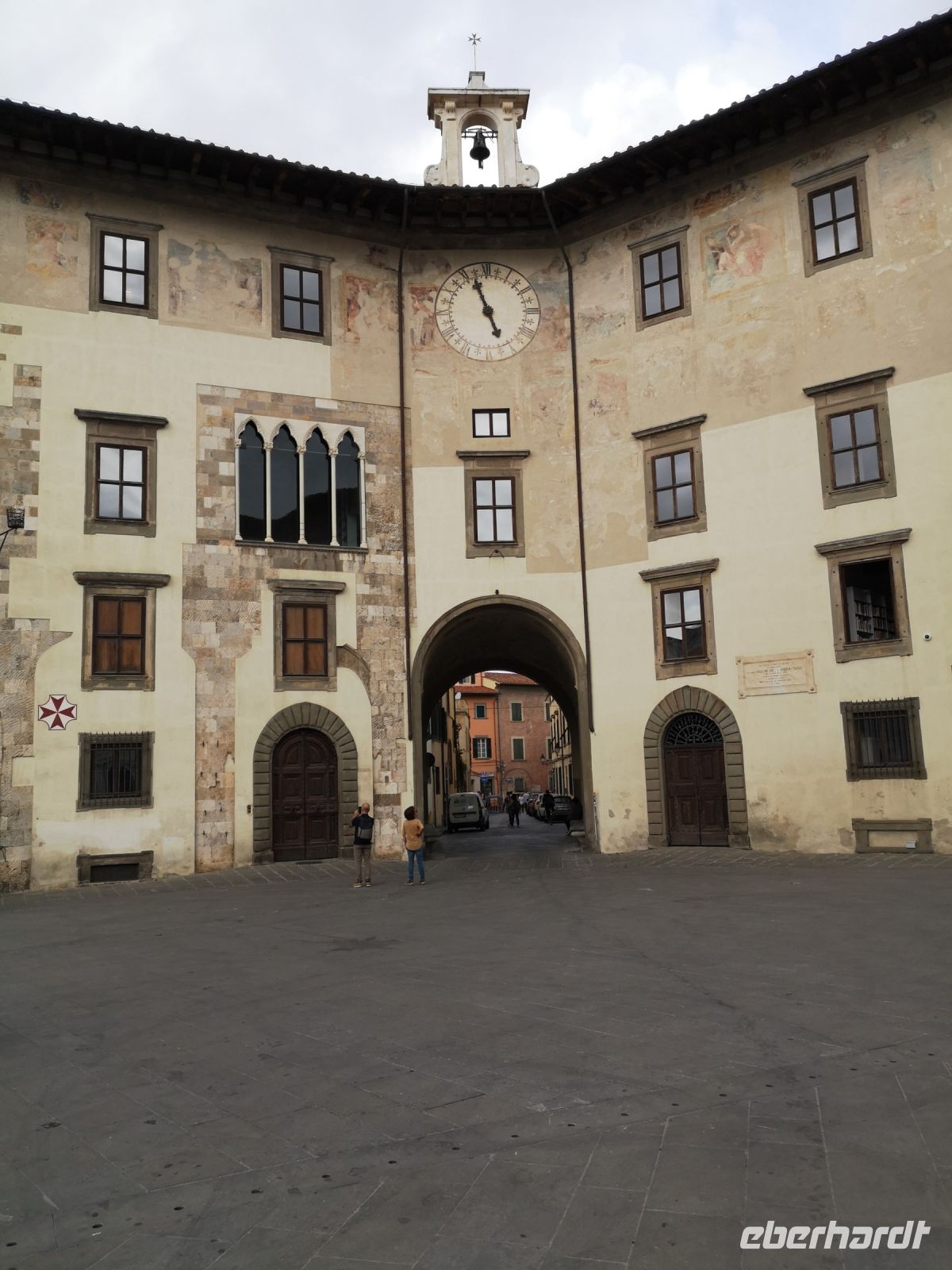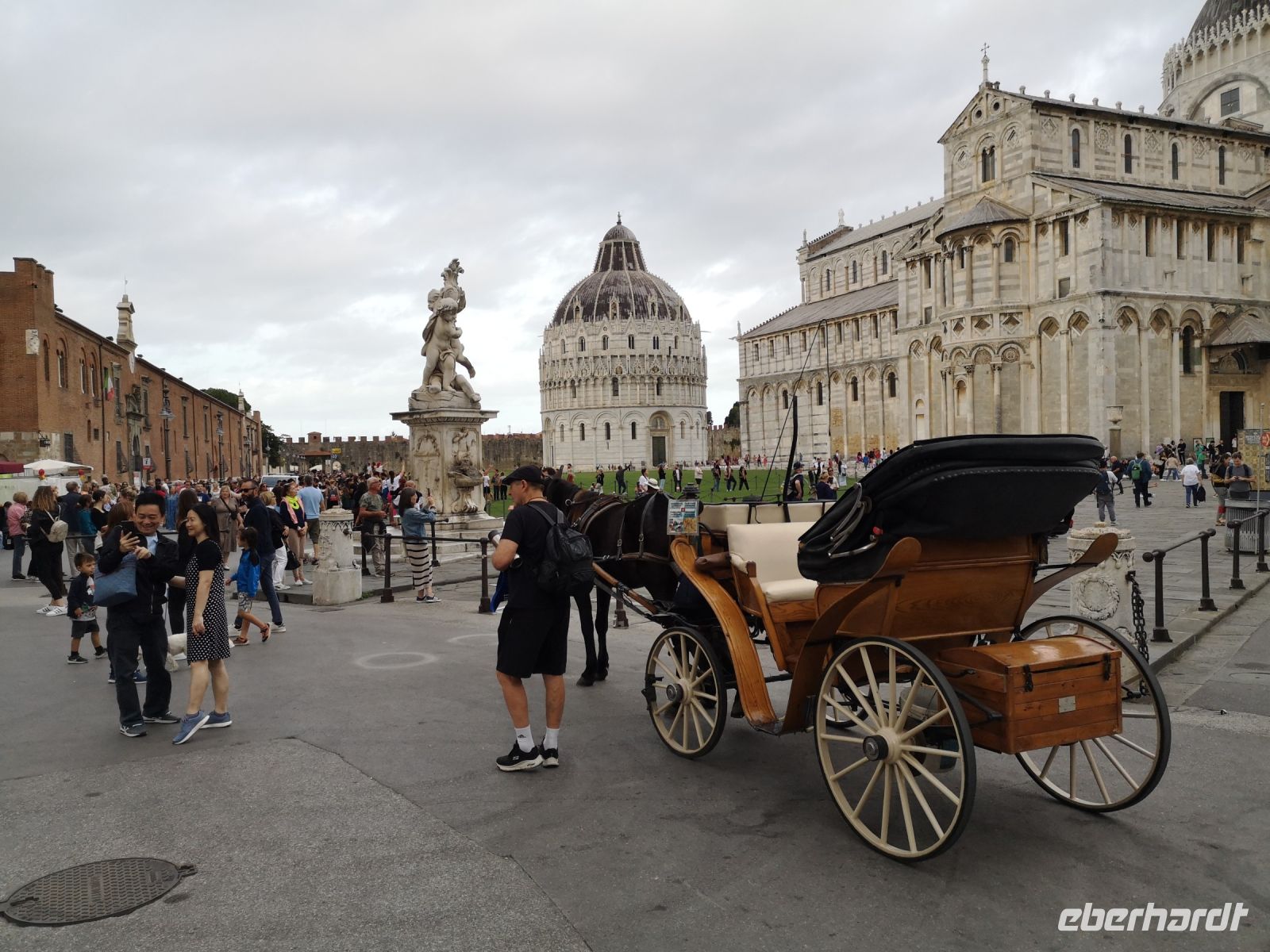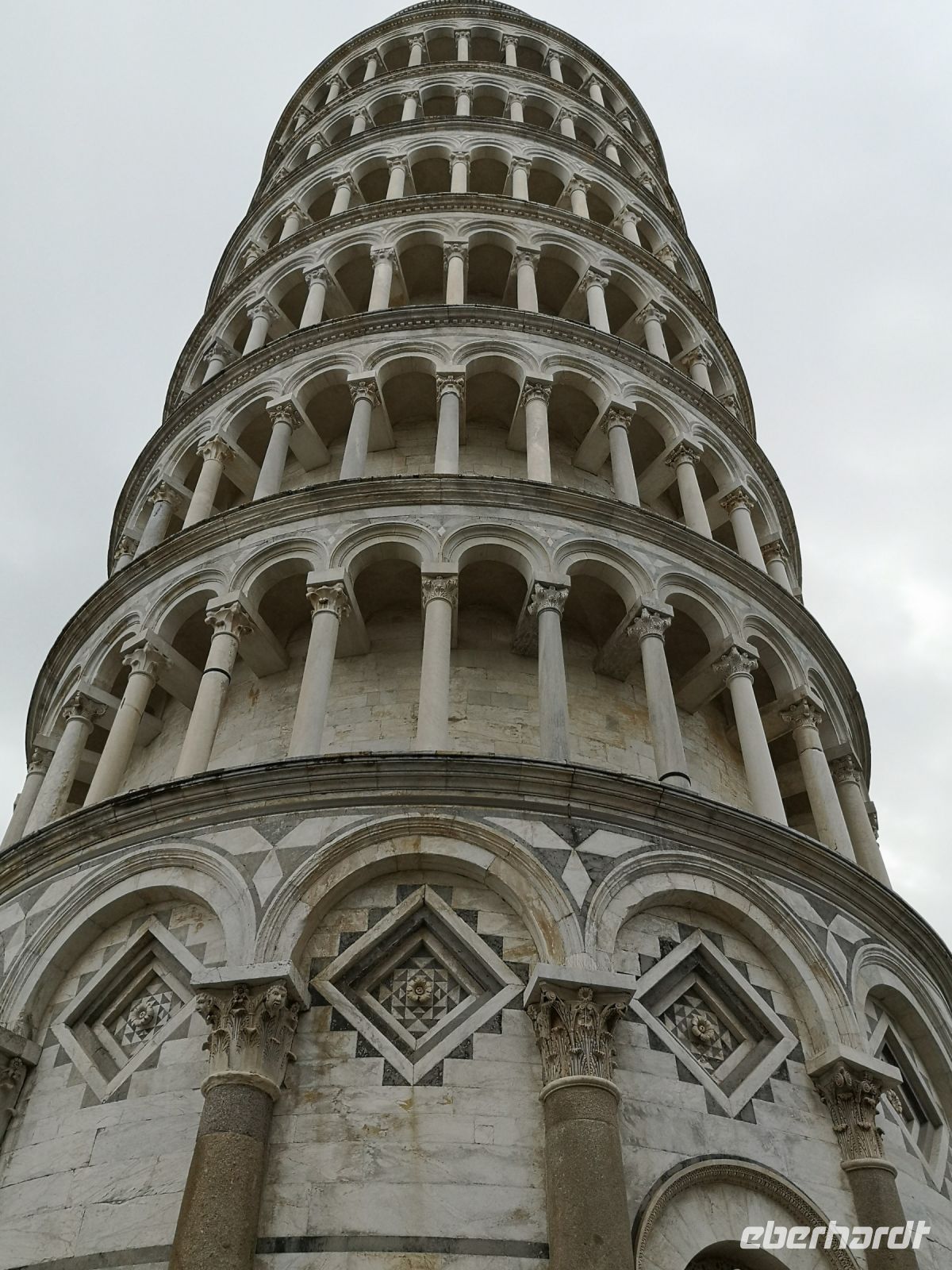 Mit neuer Kraft und einem starken italienischen Kaffee können wir nach dem Frühstück eines der bekannten Wahrzeichen der Toskana ansteuern, den schiefen Turm in Pisa. Wir treffen unsere Stadtführerin Nada am Parkplatz nahe bei Pisa, sie steigt zu uns in den Bus, kaum hat sie das Microphon in der Hand, bringt mit ihrem Temperament gleich den ganzen Bus zum Lachen. Wir fahren gemeinsam in die Stadt und nahe der Innenstadt verlassen wir den Bus und gehen zu Fuß in Zentrum. Es dauert nicht lange und wir sehen die markanten weisen Gebäude die sich auf dem Piazza dei Miracoli zeigen. Ganz zentral der Dom Santa Maria, davor als Einzelgebäude die Baptistische Kirche und dahinter der freistehende Glockenturm, fast 60 Meter hoch und unübersehbar schief geneigt, das Wahrzeichen Pisas, der schiefe Turm von Pisa. Der gesamte Gebäudekomplex steht irgendwie unwirklich vor uns, weiß grau gesteift, total übermächtig füllt er den Platz. Es dauert etwas bis man versteht das es keine Kulisse ist und diese Bauwerke nun schon seit über 650 Jahr hier stehen. Der Turm, der sich auf Grund nachgiebigen Untergrunds, schon während der Erbauung geneigt hatte, benötigte 200 Jahre bis er vollendet werden konnte und nun schlussendlich mit seiner gesamten Masse von 14.500 Tonnen sehr eindrucksvoll balancierend seine Position einhält. Es besteht nach wie vor die Gefahr das er sich weiter neigt, deshalb werden die 7 Glocken zum Geläut nur vorsichtig mit dem Hammer angeschlagen und man verzichtet auf das freie Schwingen der Glocken, was erst den vollen Klang der Glocken entfalten würde.