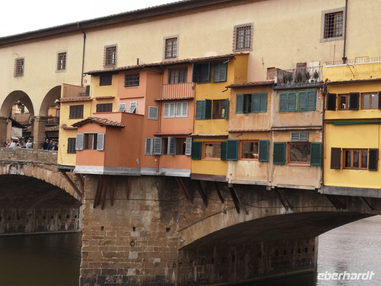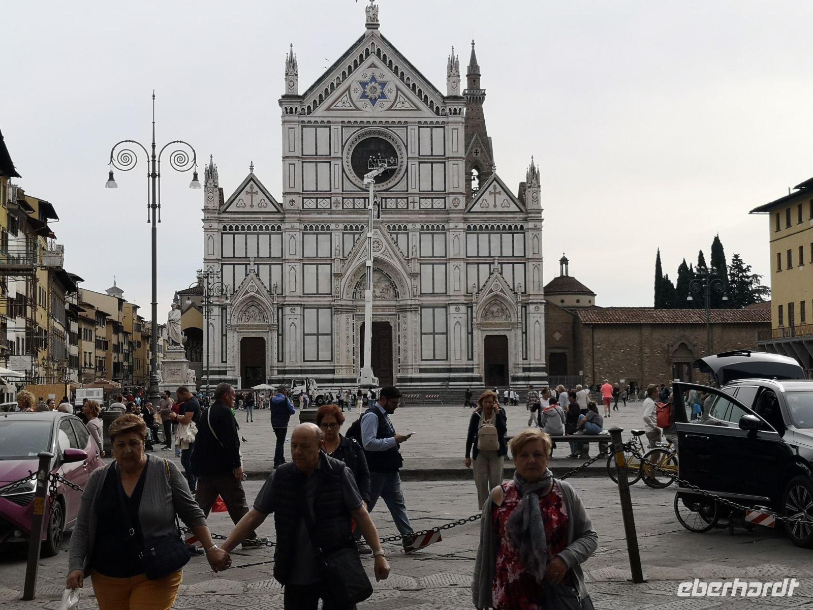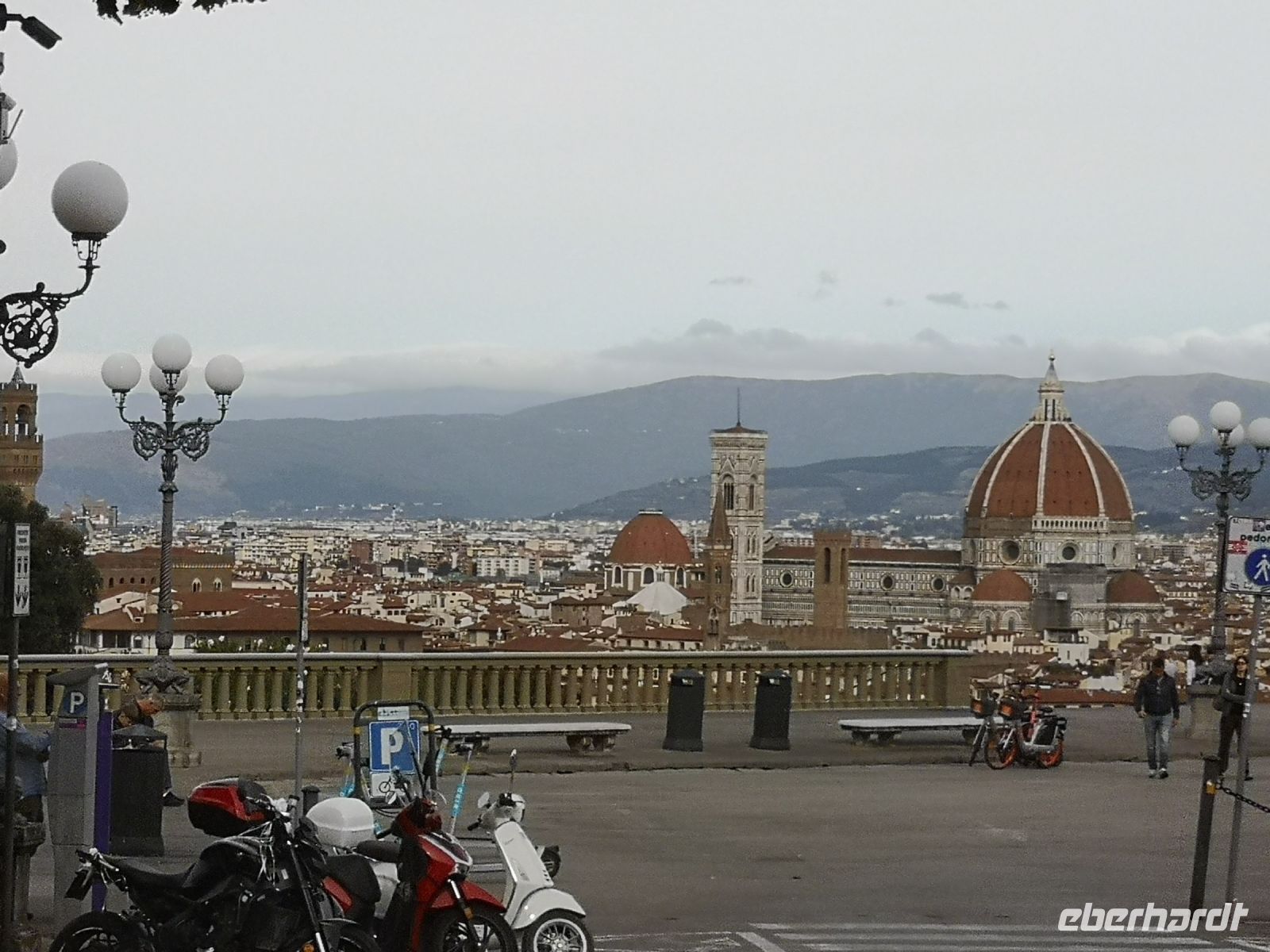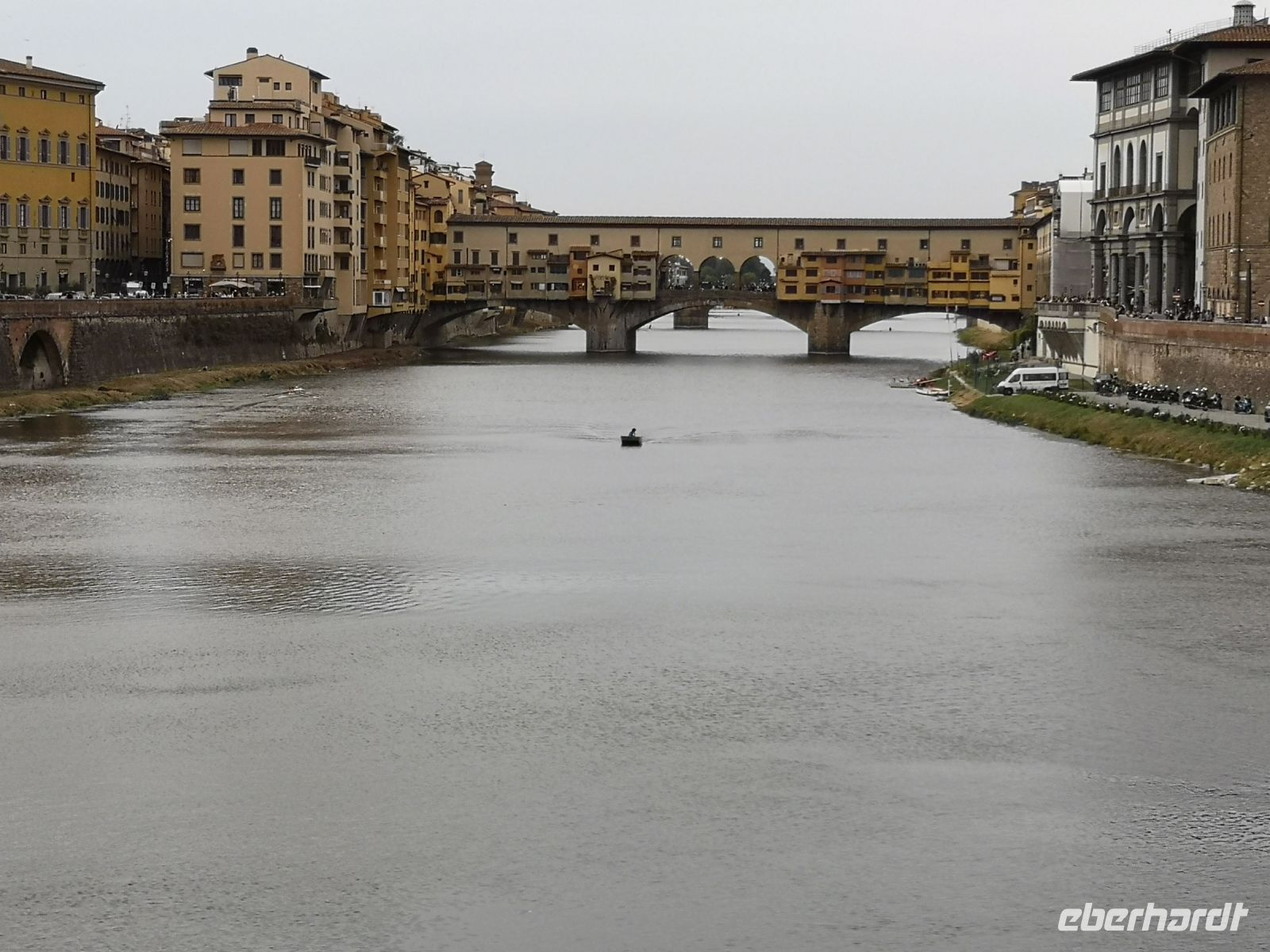 Hier treffen wir unsere heutige Stadtführerin Sabine. Wenn sie nicht gerade mit Touristen unterwegs ist, dann betreibt sie mitten in der Stadt ein kleines Hotel und kümmert sich um ihre Hausgäste. Am Ufer des Arno, nehmen wir sie zu uns in den Bus und gemeinsam fahren wir hoch zur Anhöhe Piazzale Michelangelo. Von hier haben wir einen schönen Überblick und können die wichtigsten Gebäude von oben gut ausmachen. Zurück am Arno Ufer verlassen wir den Bus und machen unseren Weg zu Fuß in die Altstadt. An der National Bibliothek vorbei, tauchen wir in die Altstadt ein. Bald stehen wir vor der Franziskaner Kirche Santa Croce und sind erneut erdrückt von dem massiven Marmor Gebäude, so filigran wie es gearbeitet wurde ist es doch eine massive Erscheinung. Aber wir gehen weiter zum Dom Platz, betrachten die Kathedrale Santa Maria in voller Größe, erst nach einer Weile bemerken wir das freistehende Gebäude, Baptisterium San Giovanni. Der Dom stellt alle in den Schatten und selbst solch beeindruckende Kunstwerke wie das Baptisterium werden überstrahlt. Florenz hat solch eine Fülle von Kirchen, Palästen, Basilikas, man könnte über eine Woche hierbleiben und hätte noch nicht alles gesehen. Wir müssen uns schützen und an vielen Kunstwerken einfach vorbeilaufen, es übersteigt unserer Wahrnehmungsgrenze. Erst an dem Platz delle Signoria machen wir wieder einen längeren Stop. Hier vor dem Palazzo Vecchio, dem Rathaus, schauen wir uns die berühmte Statue, den David von Michelangelo an. Wir haben nun unsere geführte Tour durch Florenz fast fertig, sind auch zur besseren Orientierung wieder in der Nähe des Arno angelangt und bevor wir Sabine verabschieden, besuchen wir noch gemeinsam die berühmte Goldschmiede Brücke Ponte Vecchio. Nun benötigen wir etwas Zeit für uns selbst um die ganzen Eindrücke etwas zu verdauen. Wir nehmen uns nochmal fast 3 Stunden um in der Stadt zu bleiben, etwas zu Essen und zu Bummeln und Florenz auf uns wirken zu lassen. Dann erst treffen wir uns am Bus und fahren zurück zu unserem Hotel, und erholen uns beim Abendessen.