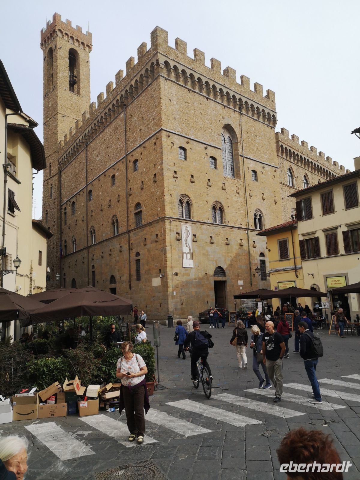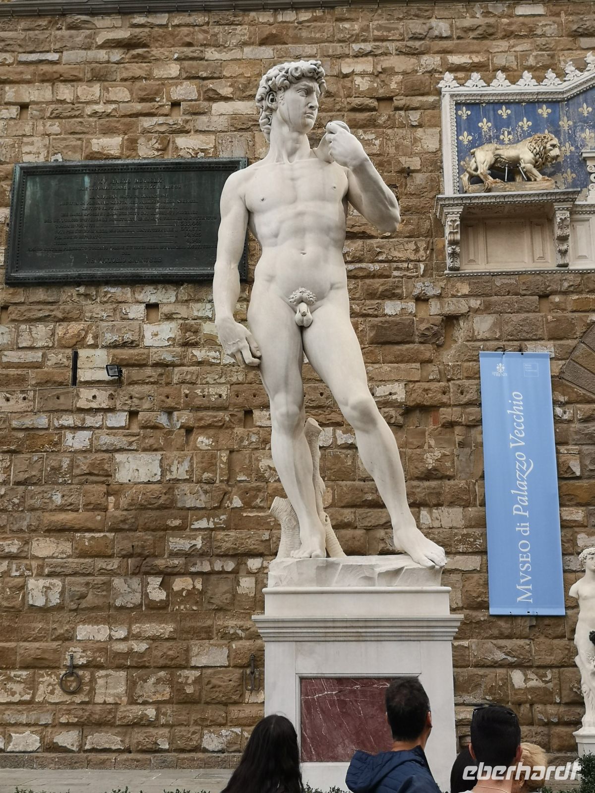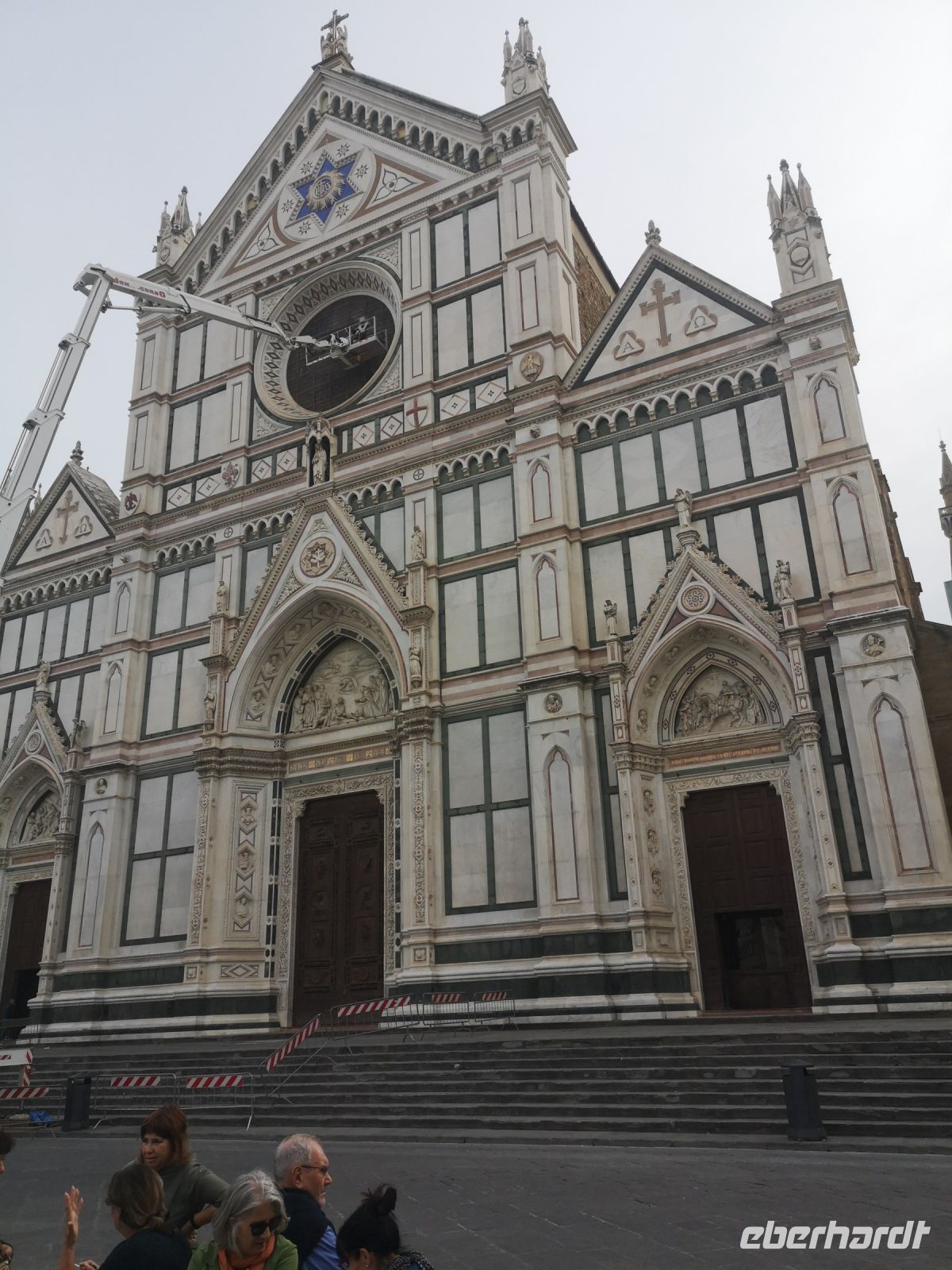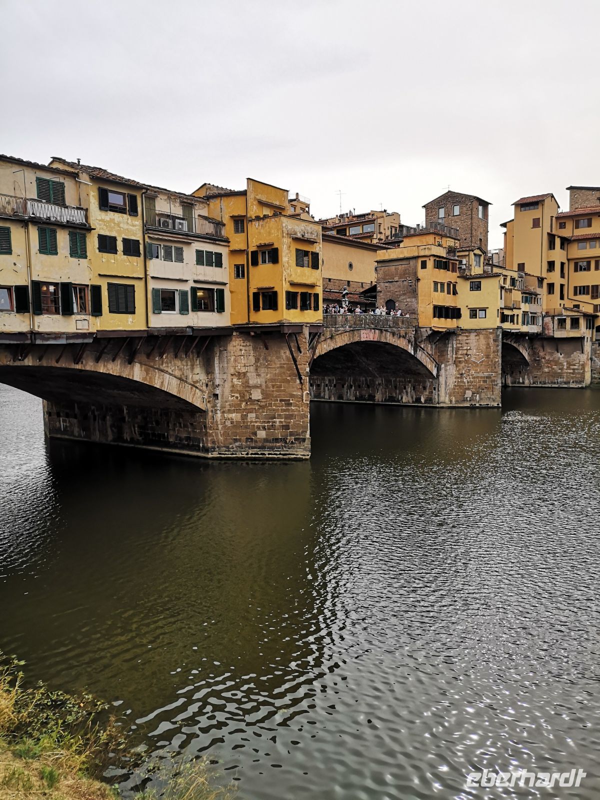 Hier treffen wir unsere heutige Stadtführerin Sabine. Wenn sie nicht gerade mit Touristen unterwegs ist, dann betreibt sie mitten in der Stadt ein kleines Hotel und kümmert sich um ihre Hausgäste. Am Ufer des Arno, nehmen wir sie zu uns in den Bus und gemeinsam fahren wir hoch zur Anhöhe Piazzale Michelangelo. Von hier haben wir einen schönen Überblick und können die wichtigsten Gebäude von oben gut ausmachen. Zurück am Arno Ufer verlassen wir den Bus und machen unseren Weg zu Fuß in die Altstadt. An der National Bibliothek vorbei, tauchen wir in die Altstadt ein. Bald stehen wir vor der Franziskaner Kirche Santa Croce und sind erneut erdrückt von dem massiven Marmor Gebäude, so filigran wie es gearbeitet wurde ist es doch eine massive Erscheinung. Aber wir gehen weiter zum Dom Platz, betrachten die Kathedrale Santa Maria in voller Größe, erst nach einer Weile bemerken wir das freistehende Gebäude, Baptisterium San Giovanni. Der Dom stellt alle in den Schatten und selbst solch beeindruckende Kunstwerke wie das Baptisterium werden überstrahlt. Florenz hat solch eine Fülle von Kirchen, Palästen, Basilikas, man könnte über eine Woche hierbleiben und hätte noch nicht alles gesehen. Wir müssen uns schützen und an vielen Kunstwerken einfach vorbeilaufen, es übersteigt unserer Wahrnehmungsgrenze. Erst an dem Platz delle Signoria machen wir wieder einen längeren Stop. Hier vor dem Palazzo Vecchio, dem Rathaus, schauen wir uns die berühmte Statue, den David von Michelangelo an. Wir haben nun unsere geführte Tour durch Florenz fast fertig, sind auch zur besseren Orientierung wieder in der Nähe des Arno angelangt und bevor wir Sabine verabschieden, besuchen wir noch gemeinsam die berühmte Goldschmiede Brücke Ponte Vecchio. Nun benötigen wir etwas Zeit für uns selbst um die ganzen Eindrücke etwas zu verdauen. Wir nehmen uns nochmal fast 3 Stunden um in der Stadt zu bleiben, etwas zu Essen und zu Bummeln und Florenz auf uns wirken zu lassen. Dann erst treffen wir uns am Bus und fahren zurück zu unserem Hotel, und erholen uns beim Abendessen.