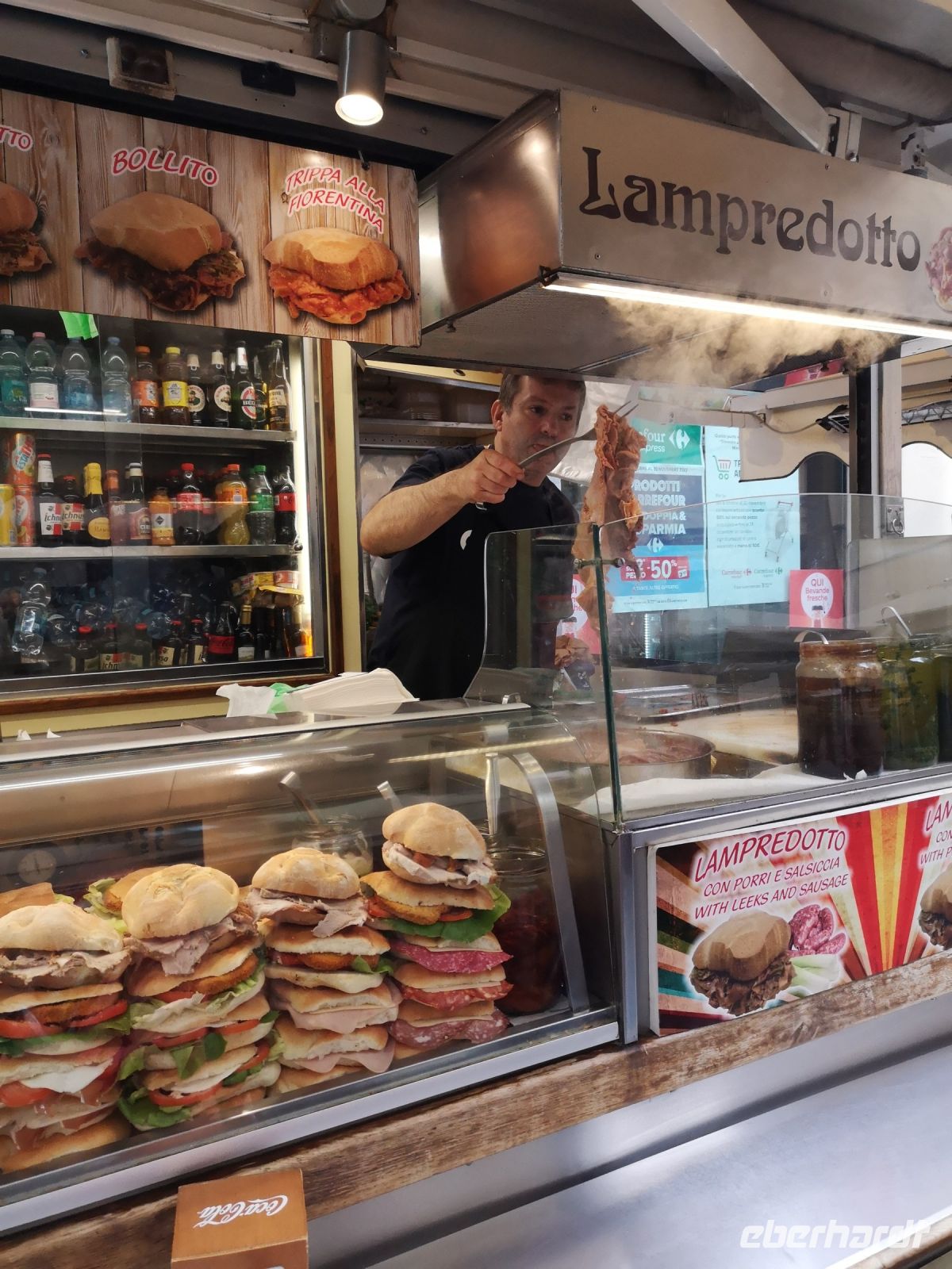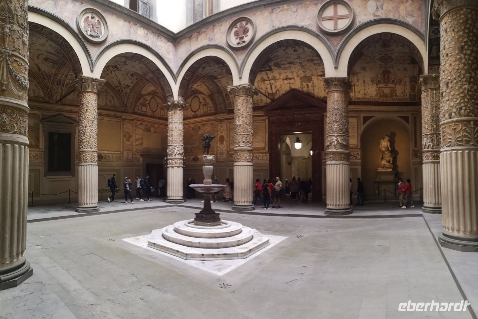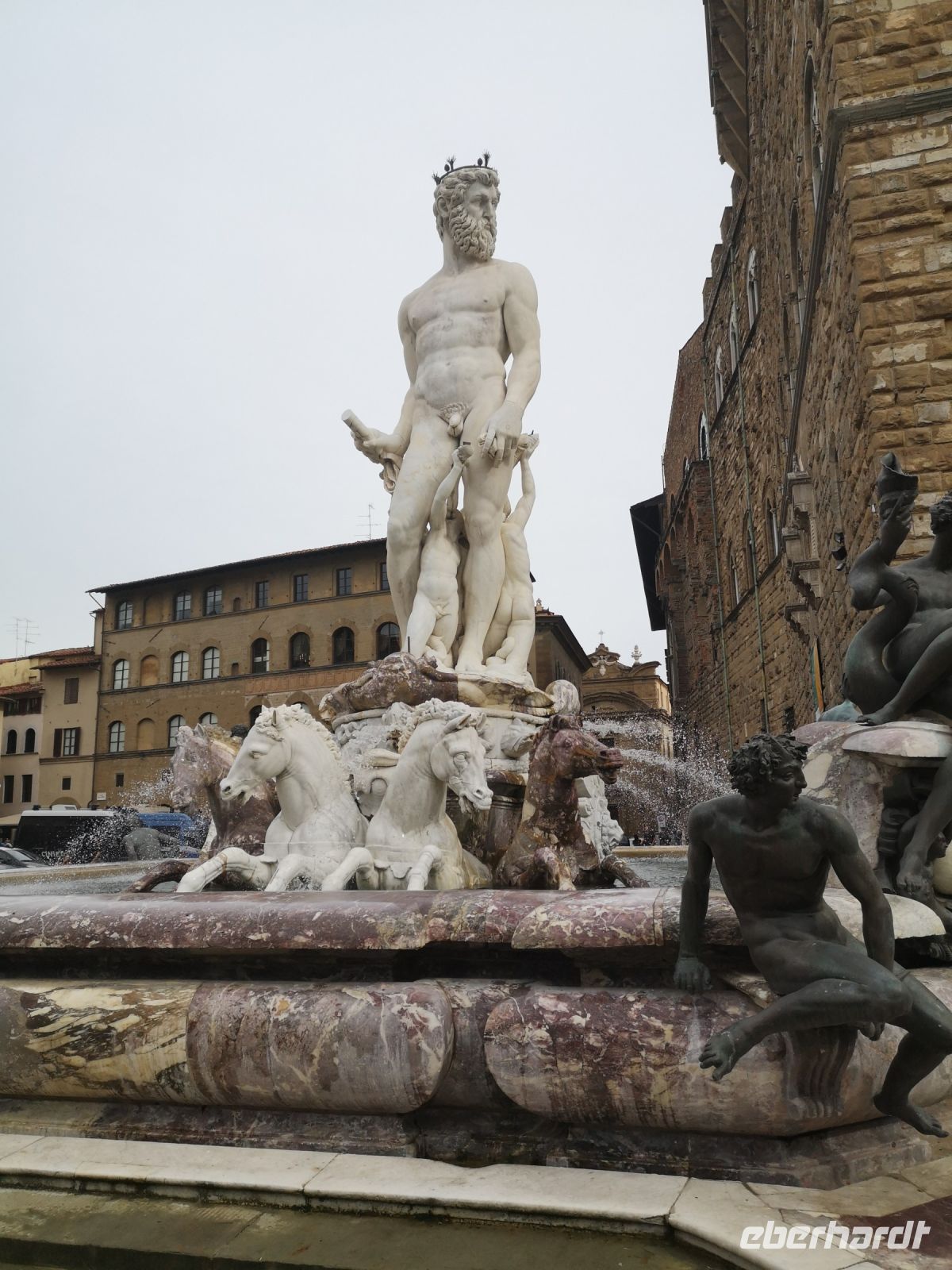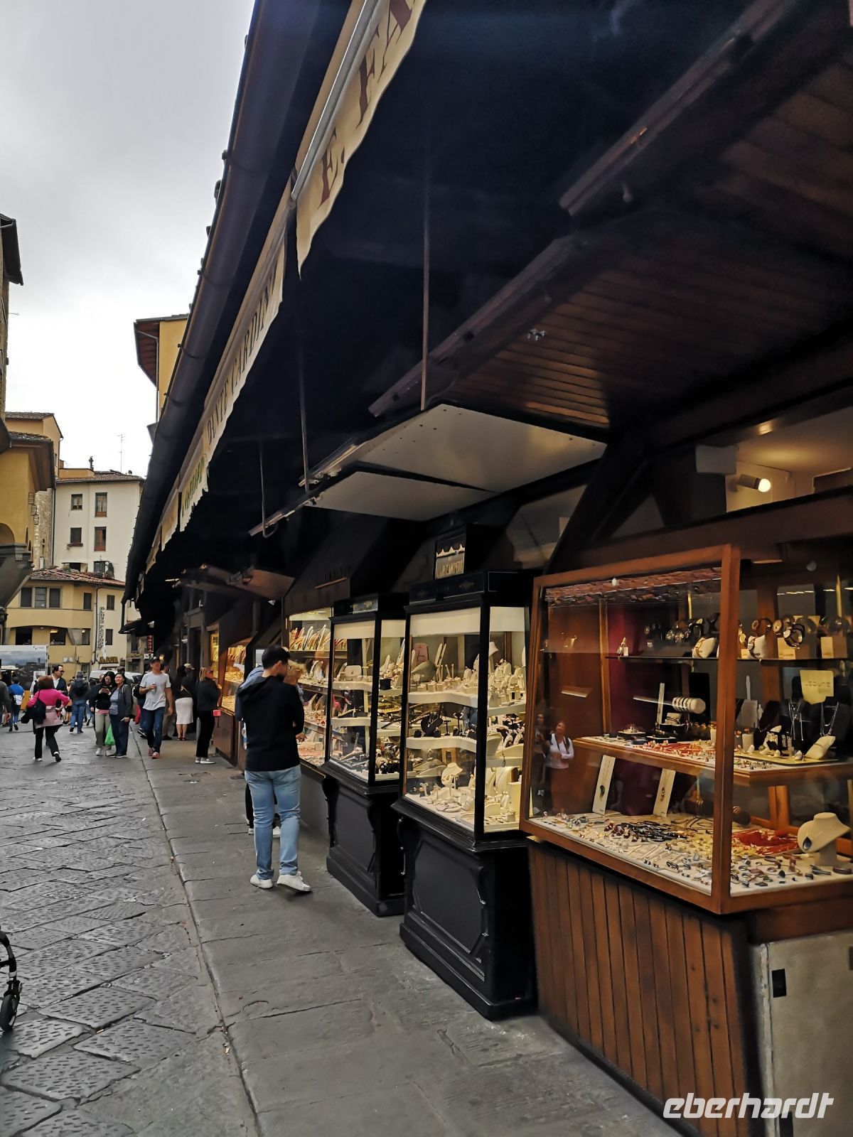 Hier treffen wir unsere heutige Stadtführerin Sabine. Wenn sie nicht gerade mit Touristen unterwegs ist, dann betreibt sie mitten in der Stadt ein kleines Hotel und kümmert sich um ihre Hausgäste. Am Ufer des Arno, nehmen wir sie zu uns in den Bus und gemeinsam fahren wir hoch zur Anhöhe Piazzale Michelangelo. Von hier haben wir einen schönen Überblick und können die wichtigsten Gebäude von oben gut ausmachen. Zurück am Arno Ufer verlassen wir den Bus und machen unseren Weg zu Fuß in die Altstadt. An der National Bibliothek vorbei, tauchen wir in die Altstadt ein. Bald stehen wir vor der Franziskaner Kirche Santa Croce und sind erneut erdrückt von dem massiven Marmor Gebäude, so filigran wie es gearbeitet wurde ist es doch eine massive Erscheinung. Aber wir gehen weiter zum Dom Platz, betrachten die Kathedrale Santa Maria in voller Größe, erst nach einer Weile bemerken wir das freistehende Gebäude, Baptisterium San Giovanni. Der Dom stellt alle in den Schatten und selbst solch beeindruckende Kunstwerke wie das Baptisterium werden überstrahlt. Florenz hat solch eine Fülle von Kirchen, Palästen, Basilikas, man könnte über eine Woche hierbleiben und hätte noch nicht alles gesehen. Wir müssen uns schützen und an vielen Kunstwerken einfach vorbeilaufen, es übersteigt unserer Wahrnehmungsgrenze. Erst an dem Platz delle Signoria machen wir wieder einen längeren Stop. Hier vor dem Palazzo Vecchio, dem Rathaus, schauen wir uns die berühmte Statue, den David von Michelangelo an. Wir haben nun unsere geführte Tour durch Florenz fast fertig, sind auch zur besseren Orientierung wieder in der Nähe des Arno angelangt und bevor wir Sabine verabschieden, besuchen wir noch gemeinsam die berühmte Goldschmiede Brücke Ponte Vecchio. Nun benötigen wir etwas Zeit für uns selbst um die ganzen Eindrücke etwas zu verdauen. Wir nehmen uns nochmal fast 3 Stunden um in der Stadt zu bleiben, etwas zu Essen und zu Bummeln und Florenz auf uns wirken zu lassen. Dann erst treffen wir uns am Bus und fahren zurück zu unserem Hotel, und erholen uns beim Abendessen.